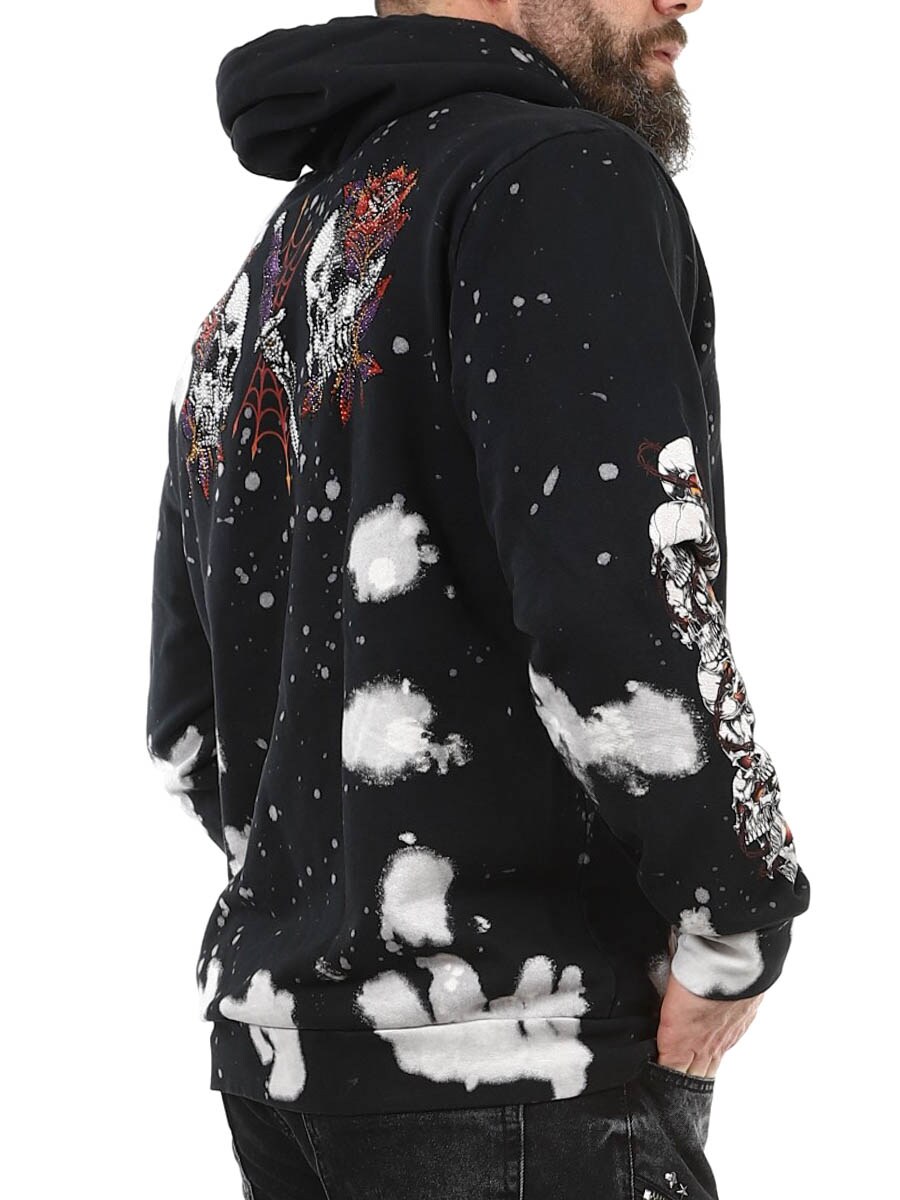 Bluza z wyrazistym charakterem i detalami, które naprawdę przyciągają wzrok. Czarna baza została wybielona w splatterowym wzorze i ozdobiona dużymi grafikami. Bluza ma klasyczną kieszeń kangurkę, regulowany kaptur oraz ściągacze dla lepszego dopasowania i komfortu. Idealna dla osób, które chcą bluzę z mocnym rockowym stylem i dużą dawką ekspresji.