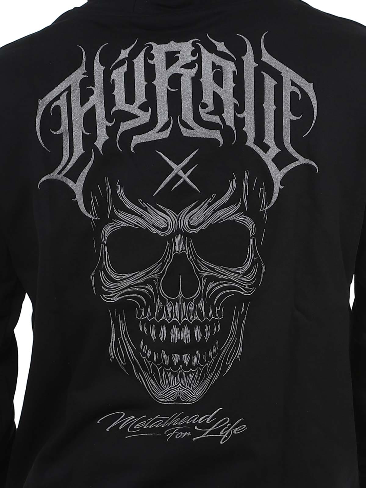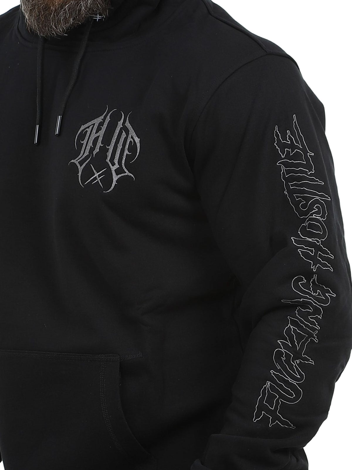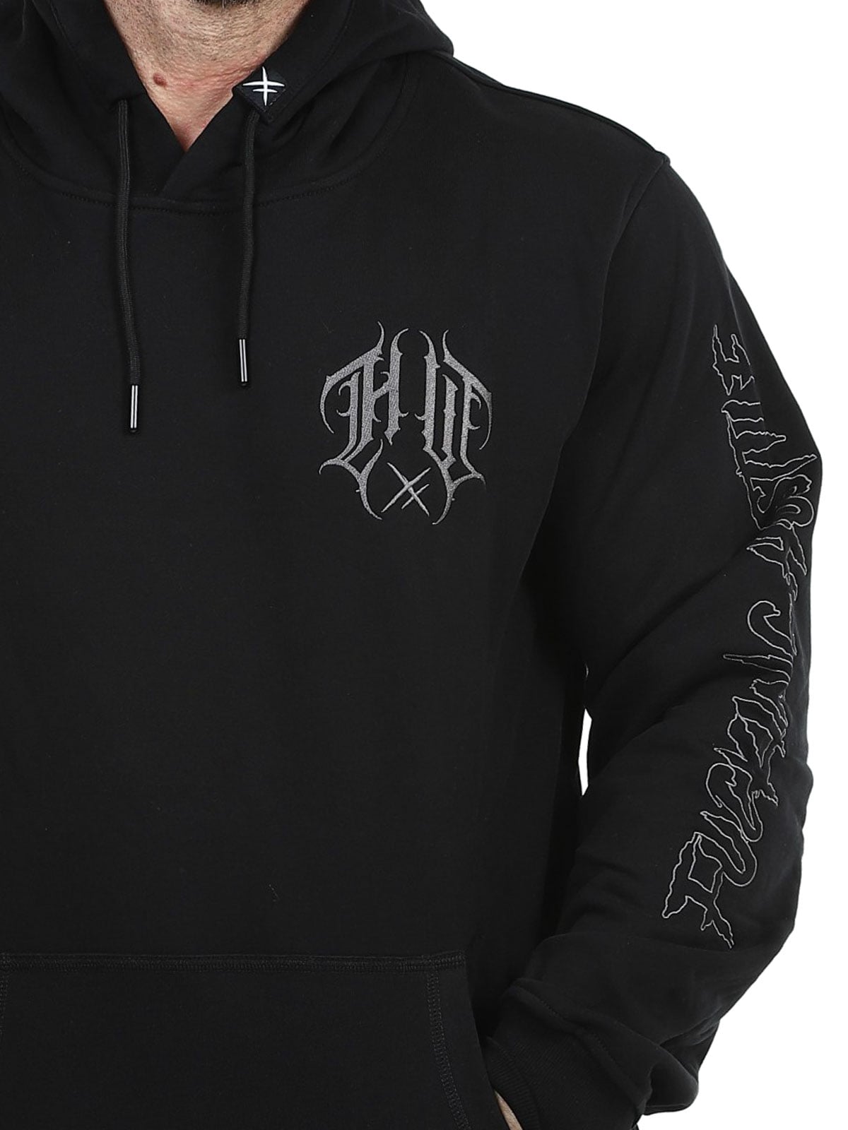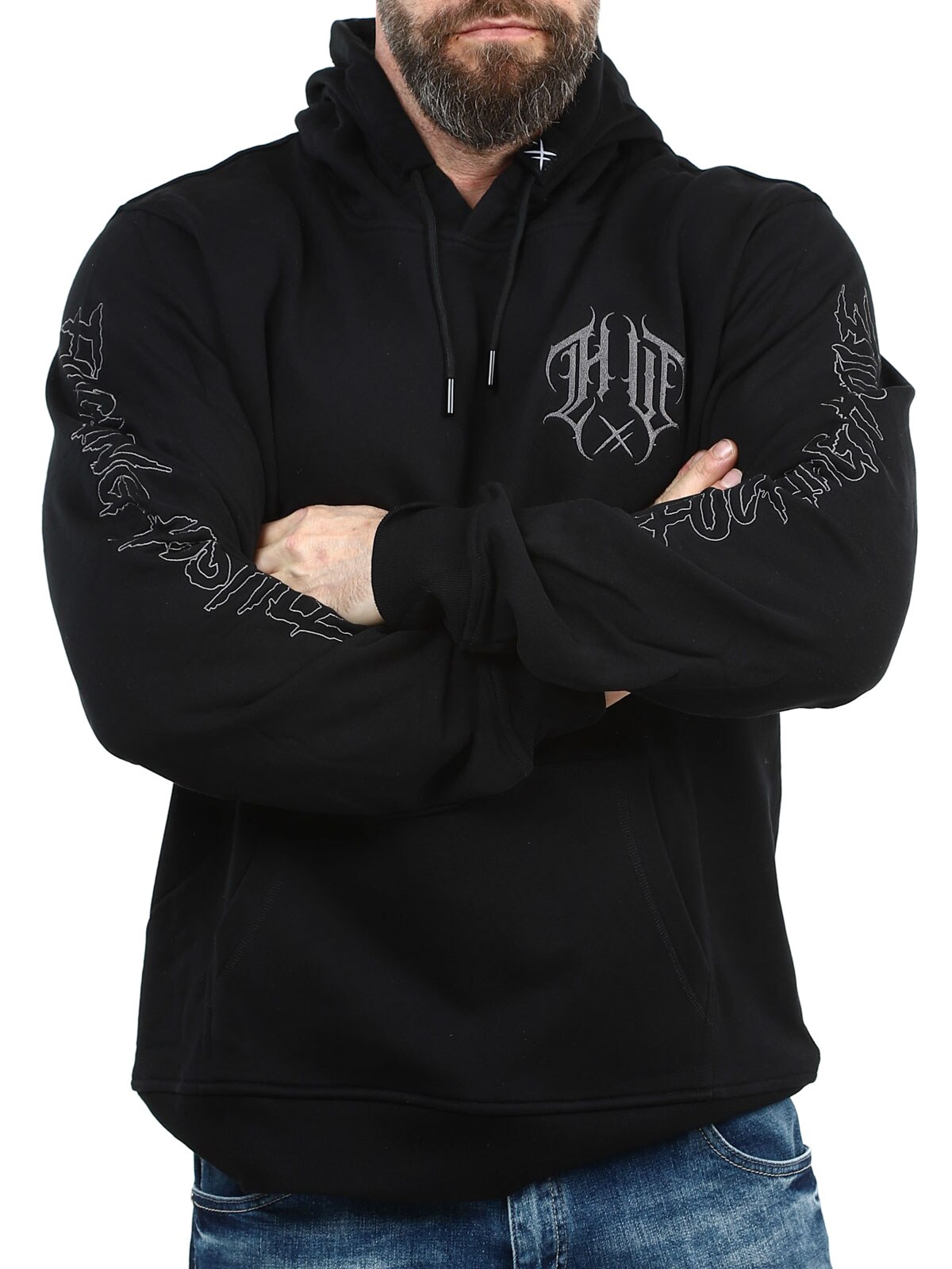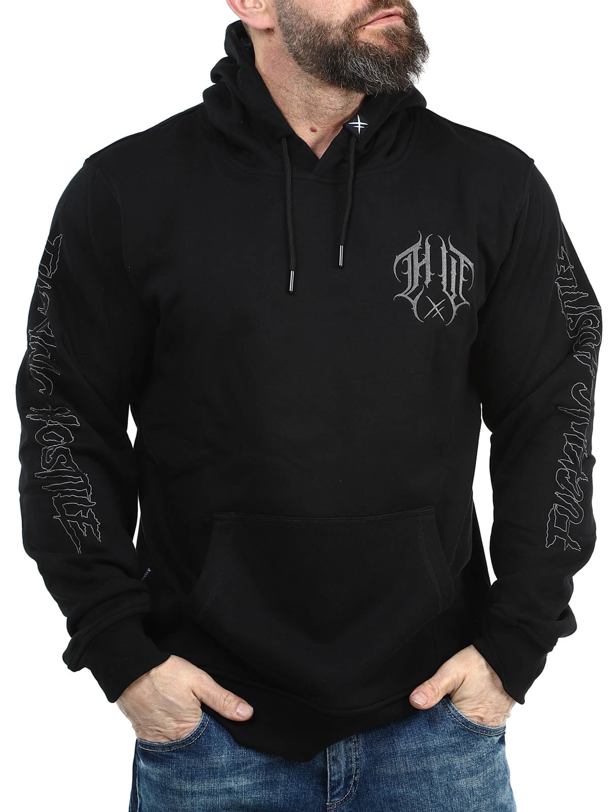 Czarna bluza z kapturem z efektownym, dopasowanym nadrukiem na piersi, plecach i rękawach. Bluza posiada również unikalny nadruk po wewnętrznej stronie kaptura, który wyróżnia się, gdy kaptur jest założony, nadając ubraniu dodatkowy, ciekawy detal. Model wyposażony jest w praktyczną kieszeń kangurkę z przodu oraz ściągacze przy mankietach i na dole dla wygodnego dopasowania.