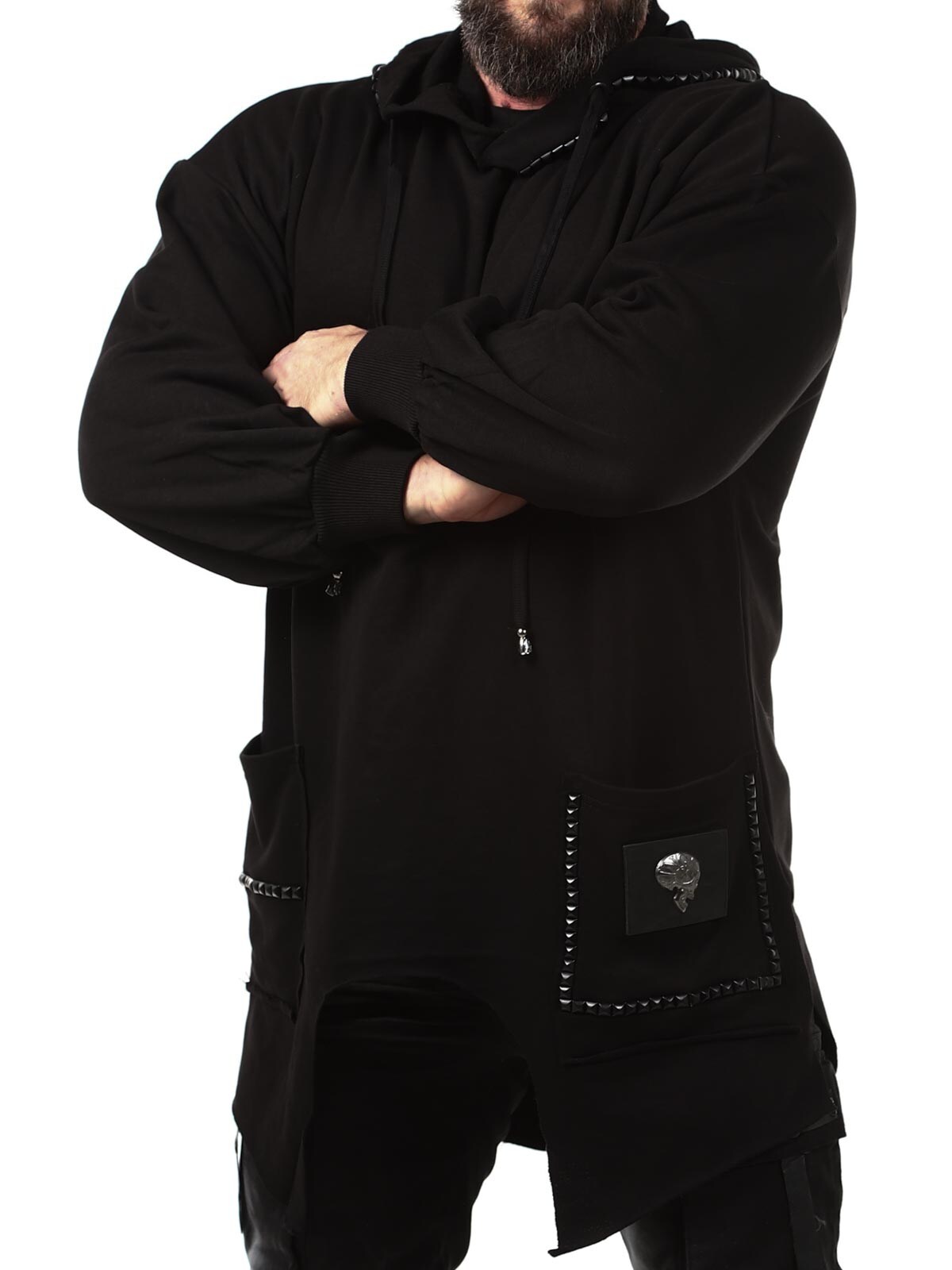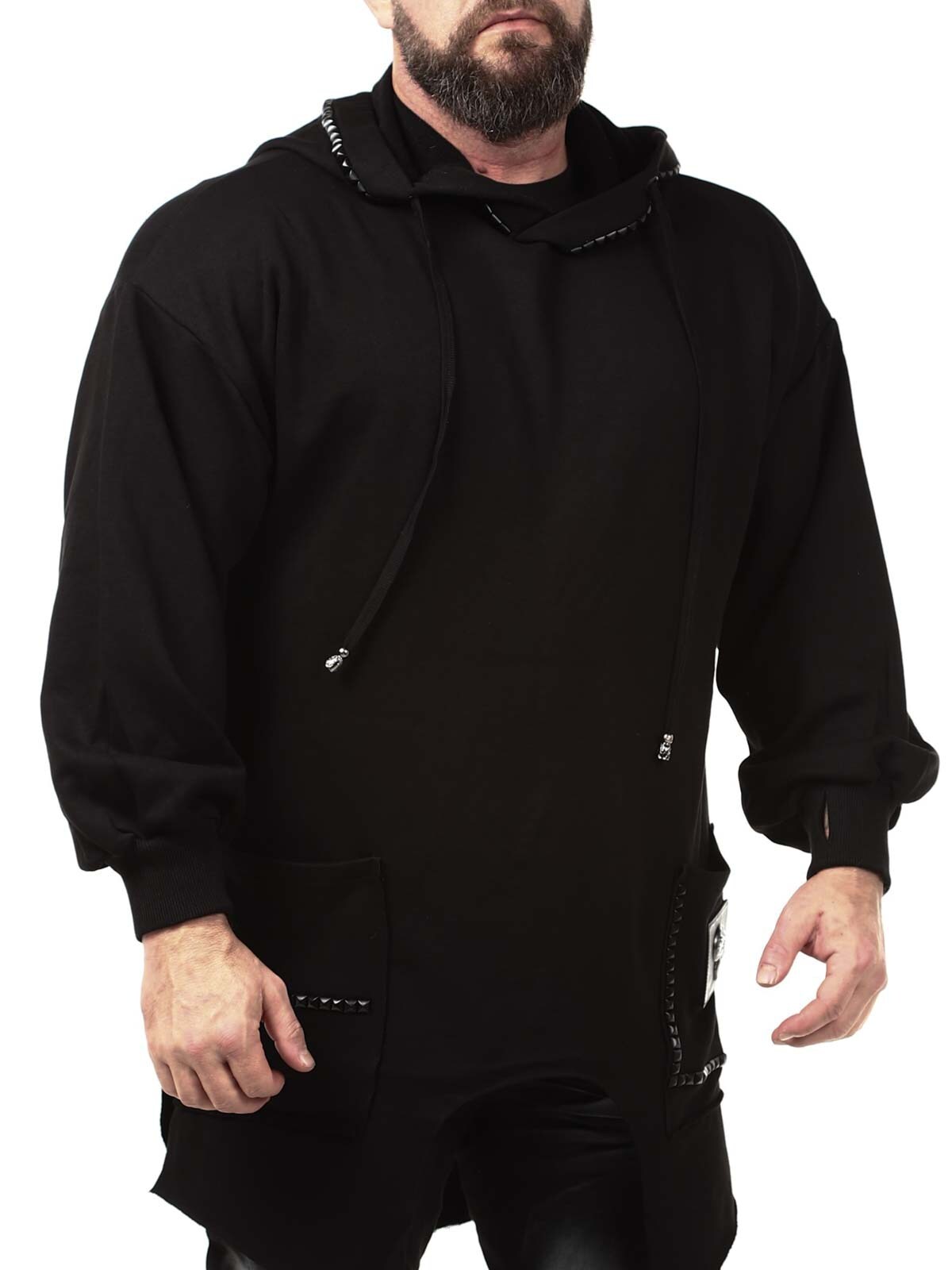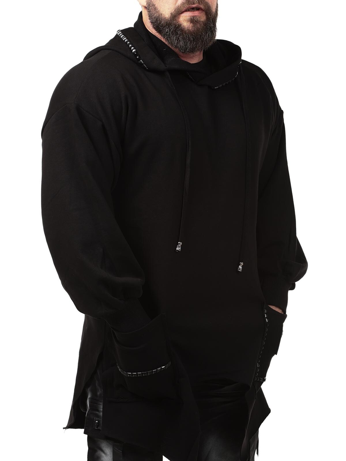 Bluza z kapturem w dłuższym modelu z rozcięciami na dole po bokach. Ozdobiona nitami, naszywką oraz logo z tyłu. Posiada kaptur ściągany sznurkiem oraz dwie otwarte kieszenie z przodu.