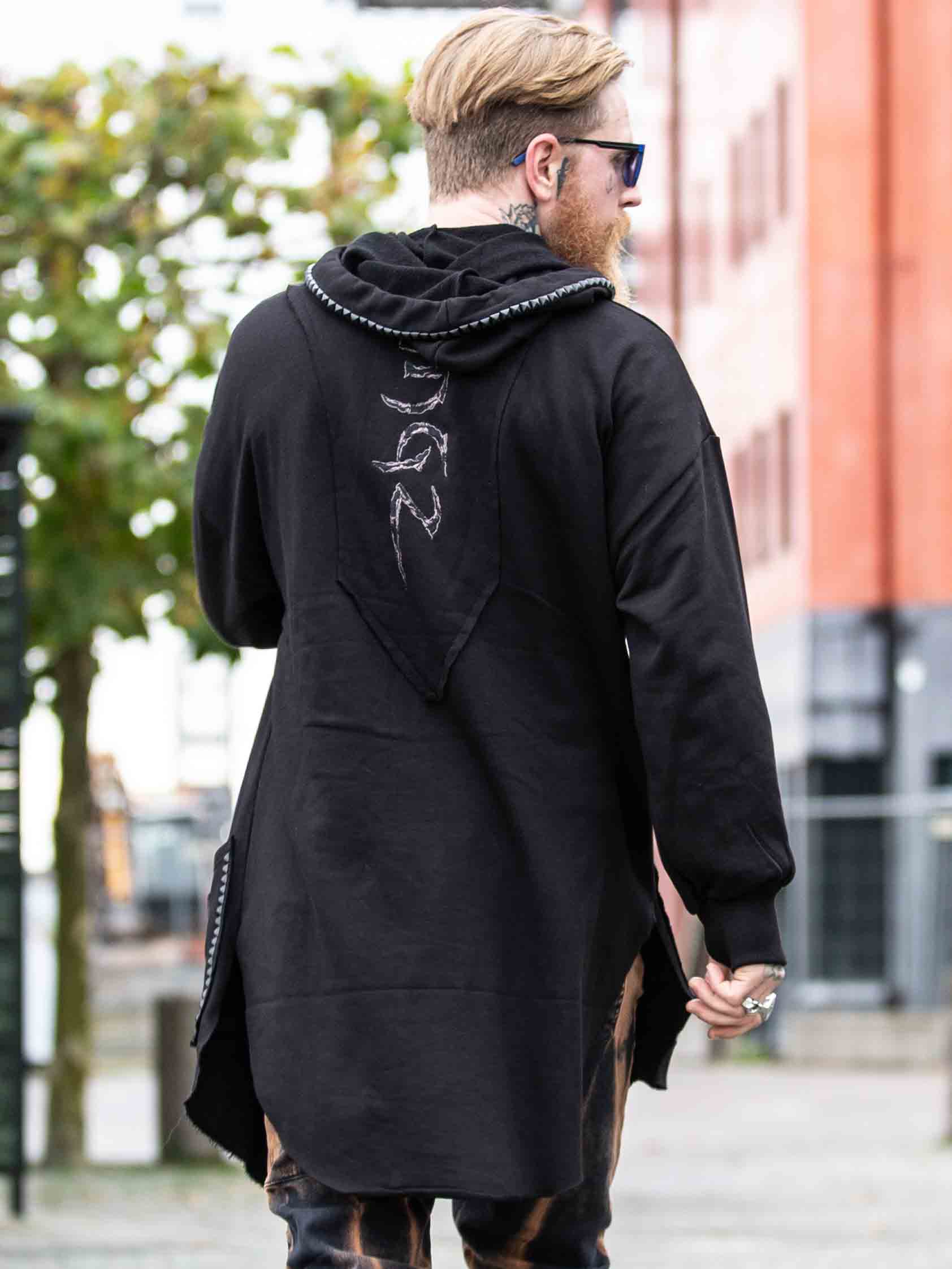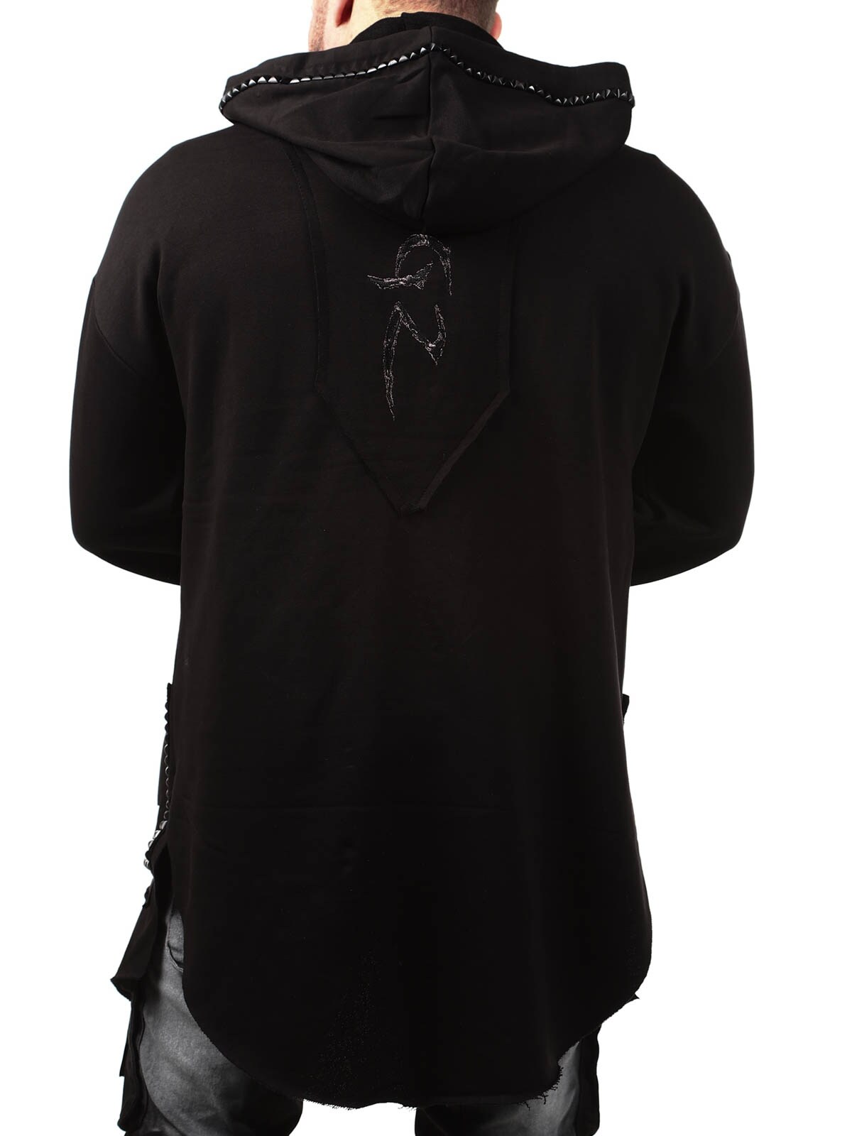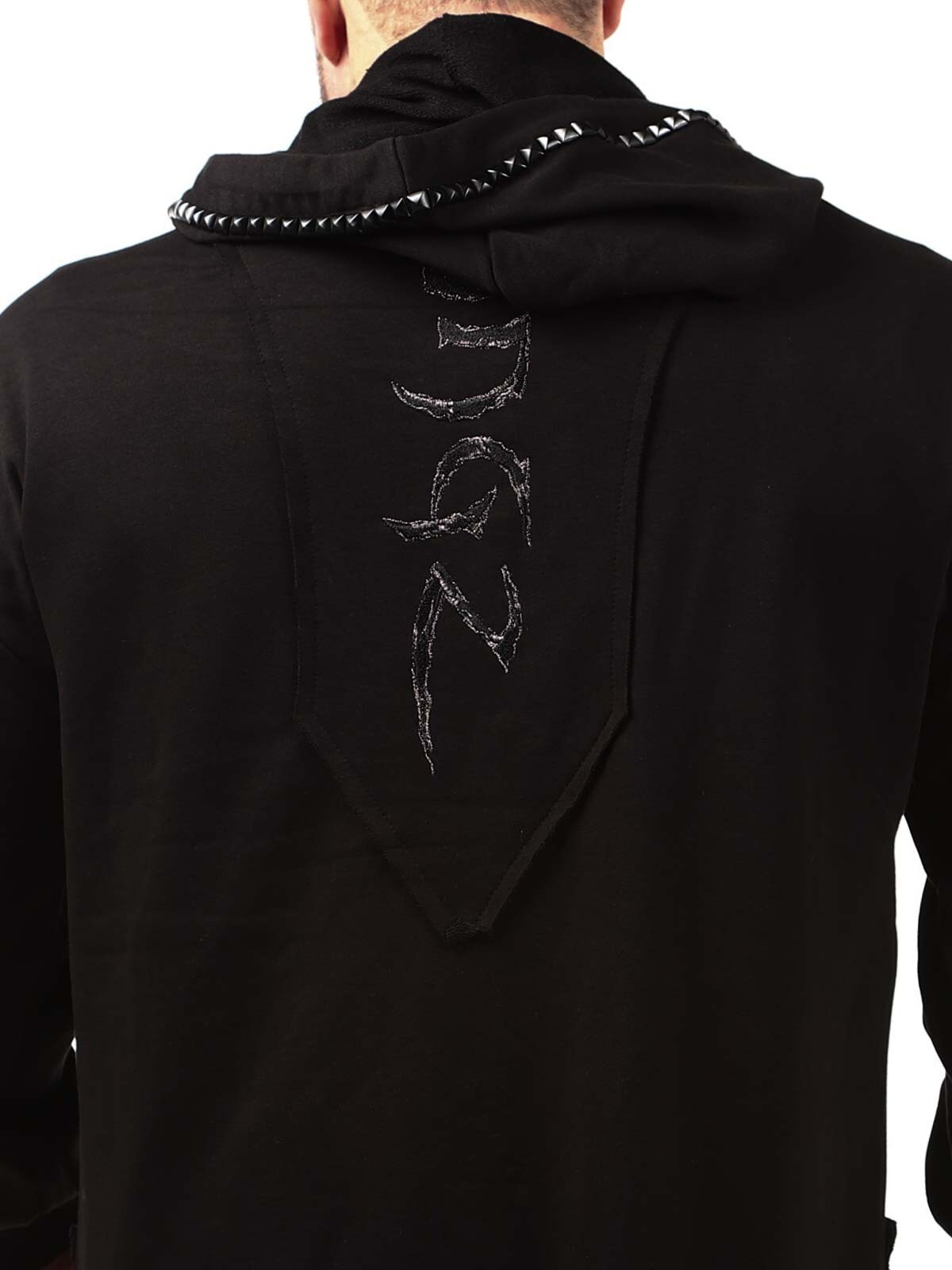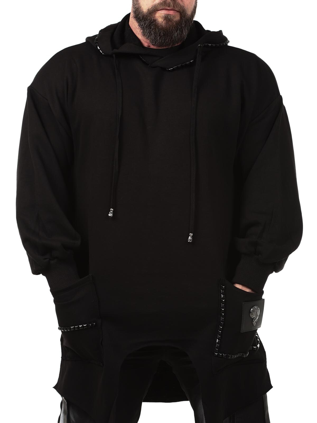 Bluza z kapturem w dłuższym modelu z rozcięciami na dole po bokach. Ozdobiona nitami, naszywką oraz logo z tyłu. Posiada kaptur ściągany sznurkiem oraz dwie otwarte kieszenie z przodu.