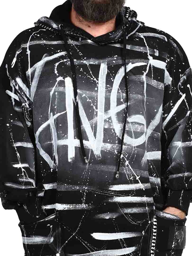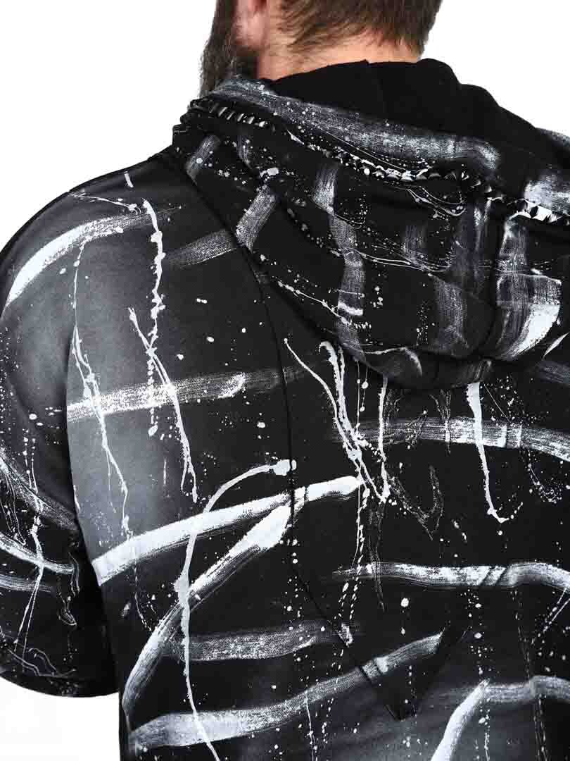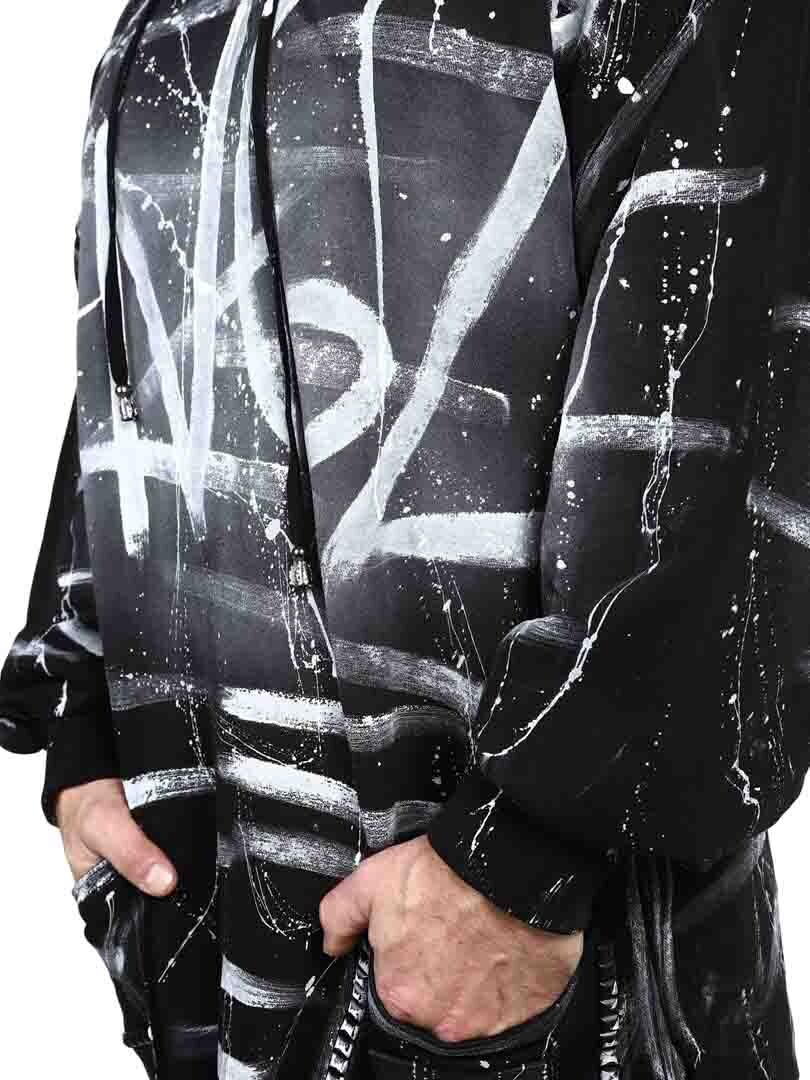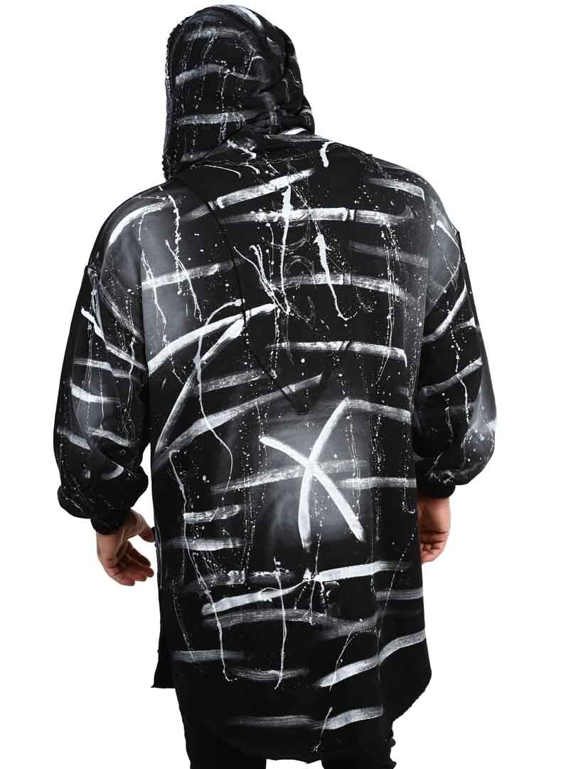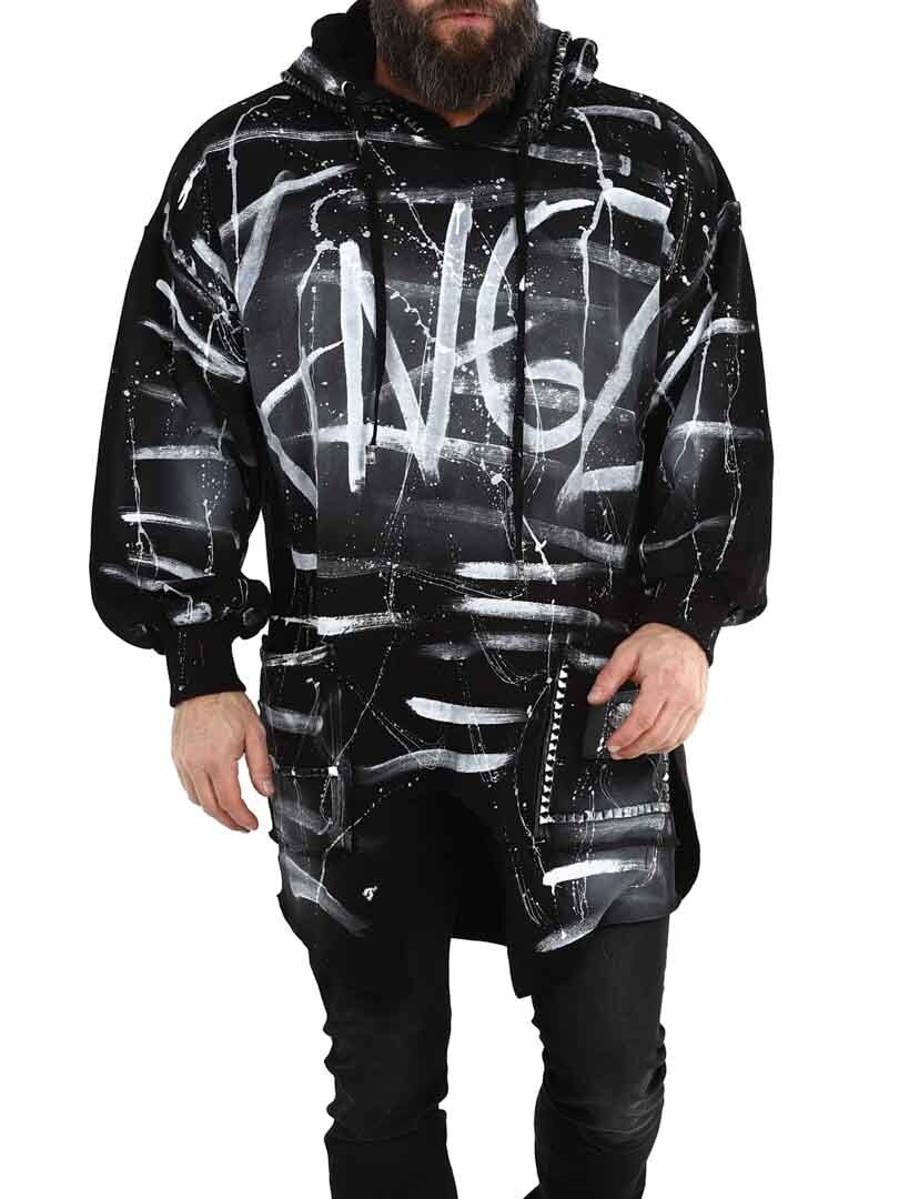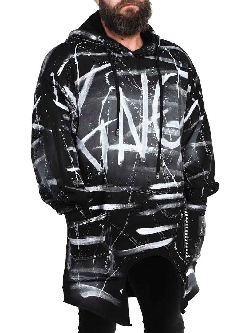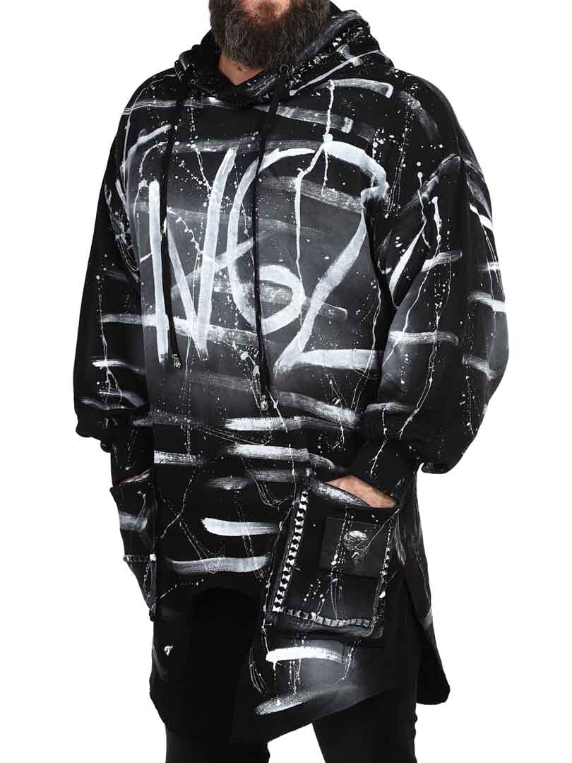 Bluza z kapturem w dłuższym modelu z rozcięciami na dole po bokach. Ozdobiona nitami, naszywką oraz logo z tyłu. Posiada kaptur ściągany sznurkiem oraz dwie otwarte kieszenie z przodu.