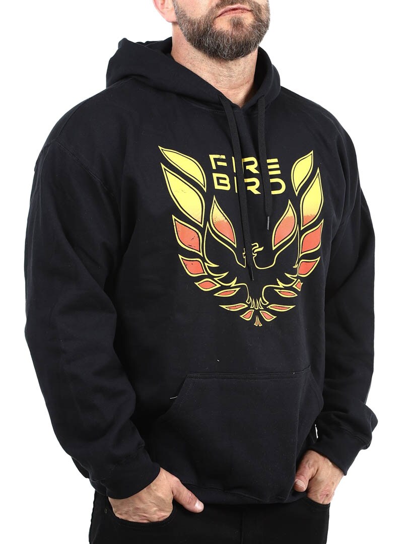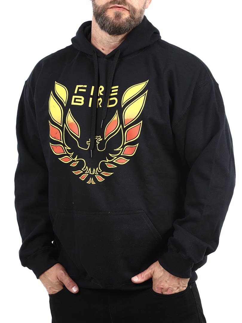 Czarna bluza z kapturem z kultowym emblematem „Firebird”. Nadruk w odcieniach czerwieni i żółci ma postarzany, vintage'owy wygląd, który natychmiast przywodzi na myśl muscle car z lat 70. Idealne połączenie wygody i fajnego stylu retro!