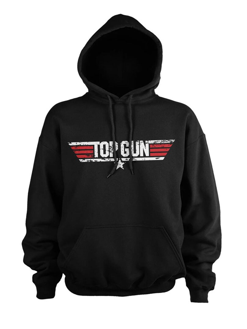 Ta czarna bluza z kapturem z motywem Top Gun to must-have dla wszystkich fanów klasycznych filmów akcji i kultowego stylu lat 80. Posiada kaptur ze sznurkiem, kieszeń typu kangurka oraz ściągacze przy mankietach i u dołu.