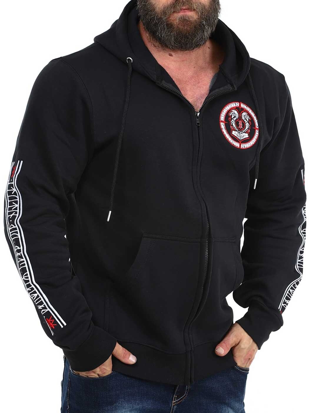 Bluza z kapturem zapinana na zamek i motywami inspirowanymi Wikingami. Posiada dwie kieszenie w talii oraz ściągacze na końcach rękawów. Te wyjątkowe spodenki dostępne są wyłącznie w RockDenim!