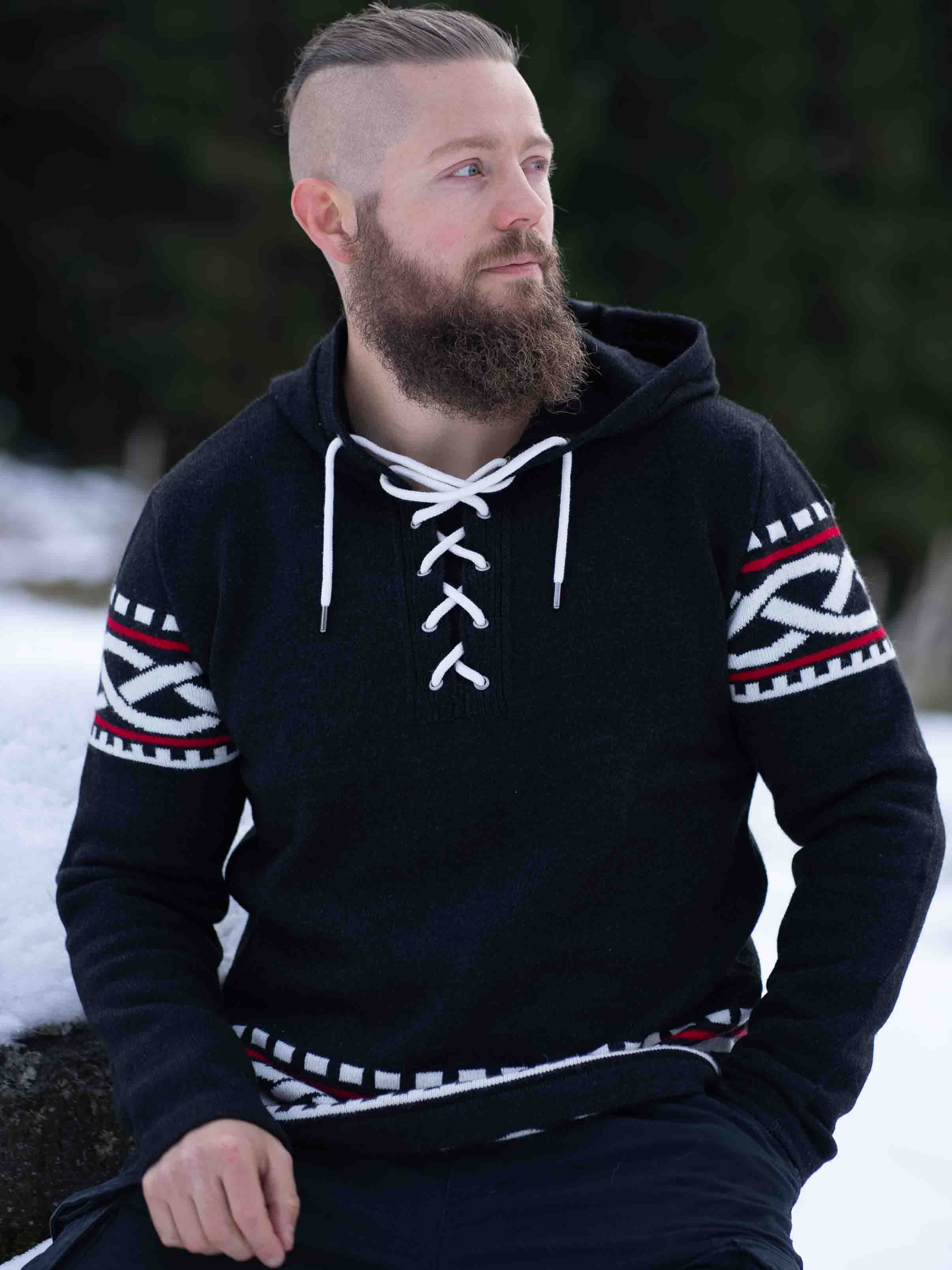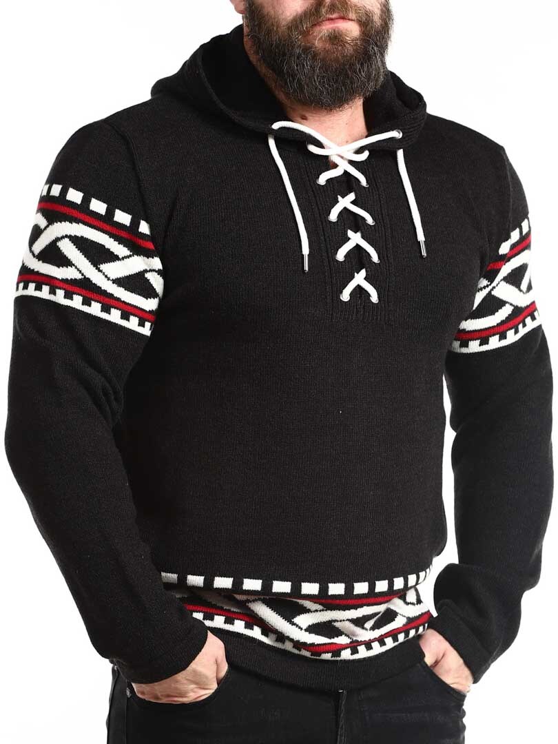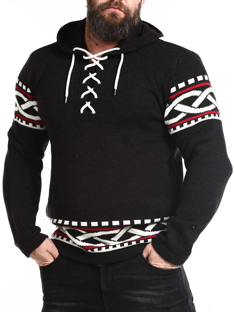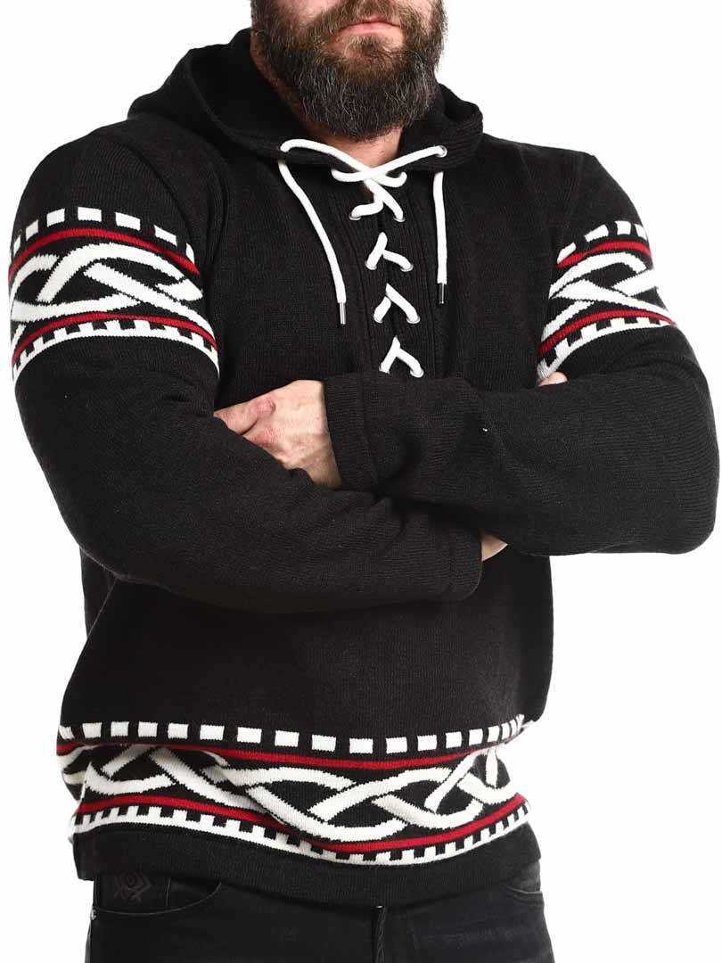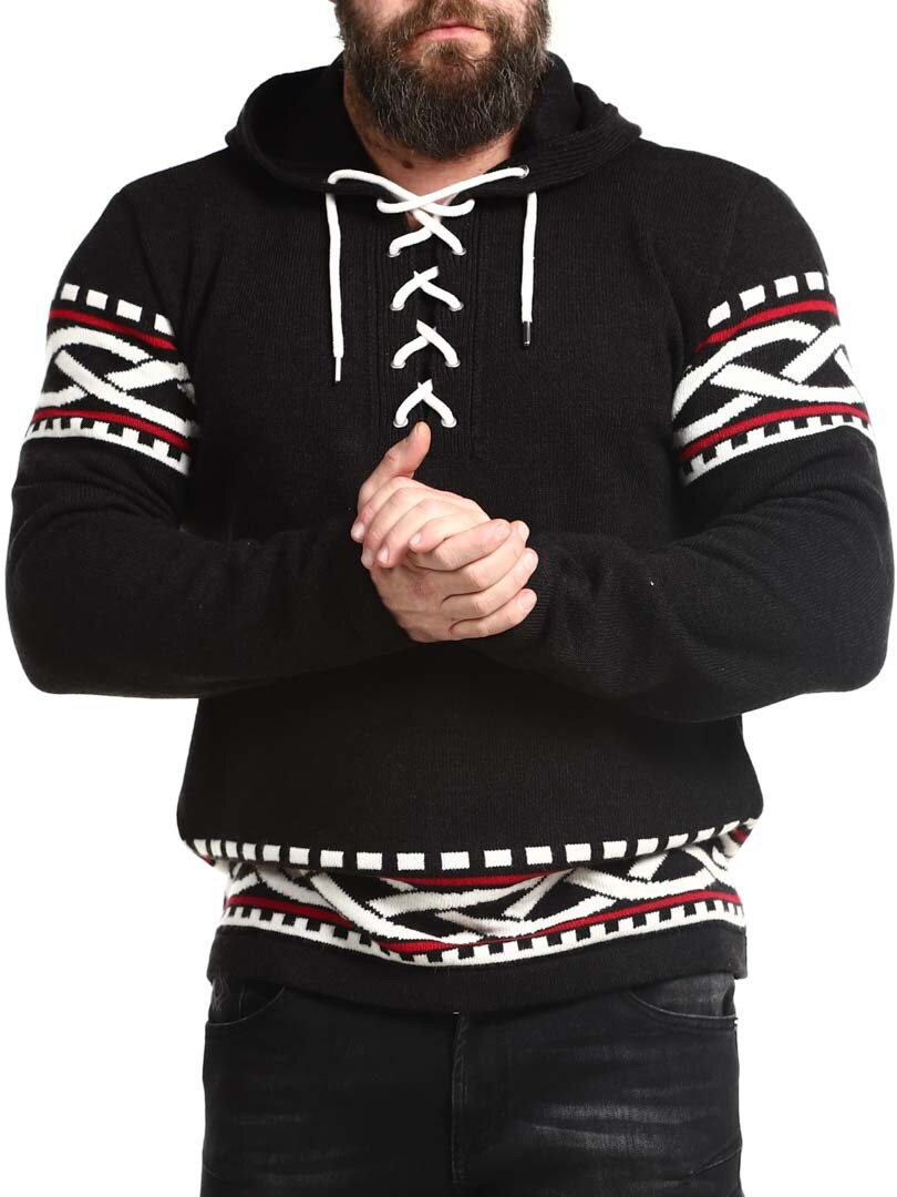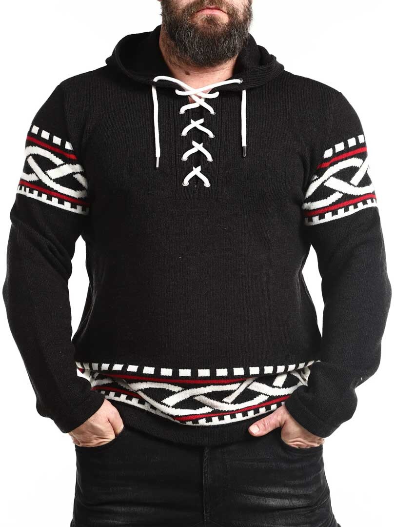 Poczuj siłę Północy dzięki naszej bluzy z kapturem inspirowanej wikingami – doskonałe połączenie surowego stylu i nowoczesnego komfortu. Bluza posiada autentyczny nordycki wzór z wyraźnymi wikińskimi detalami na rękawach i dole, a sznurowanie przy dekolcie nadaje jej tradycyjny i mocny charakter. Wykonana z miękkiego, ciepłego materiału, zapewnia wygodę przez cały dzień – zarówno na świeżym powietrzu, jak i na co dzień, gdy chcesz się wyróżnić.