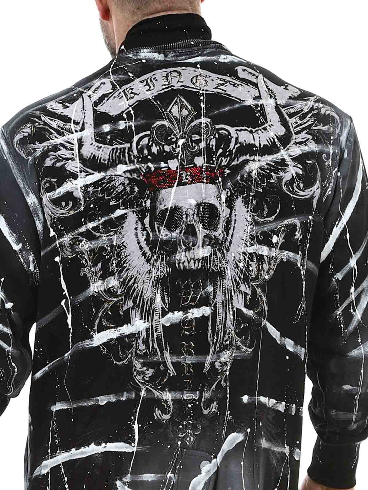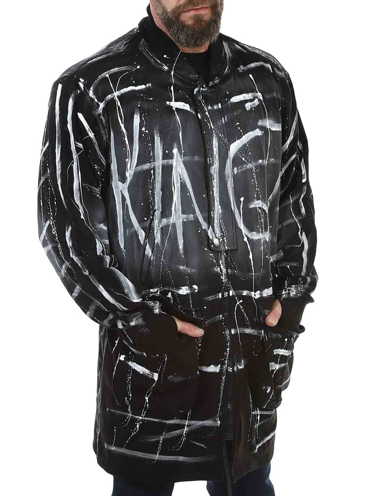 Długa bluza z charakterem i designem, który naprawdę się wyróżnia. Ozdobiona malowanymi efektami i rozpryskami farby, które nadają surowy i artystyczny wygląd, natomiast tył zdobi motyw czaszki ze strasami jako przyciągający uwagę detal. Bluza posiada cztery kieszenie z przodu i zapinana jest zarówno na zamek błyskawiczny, jak i guziki.