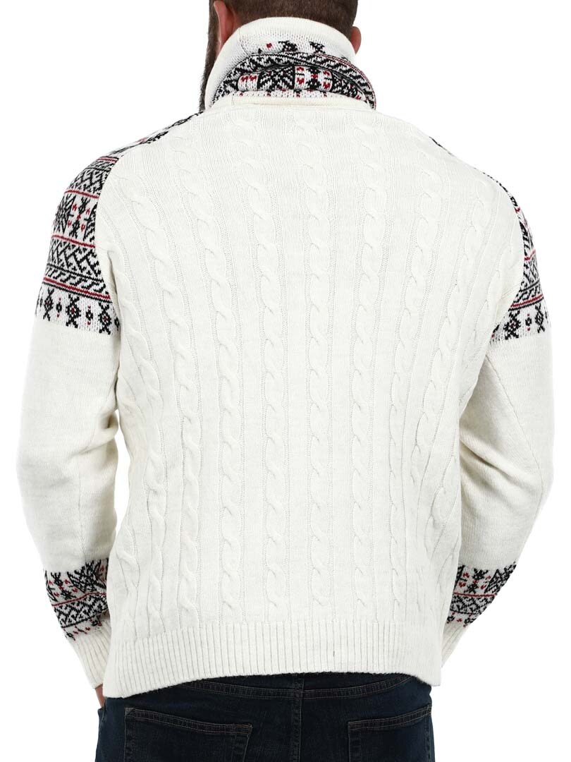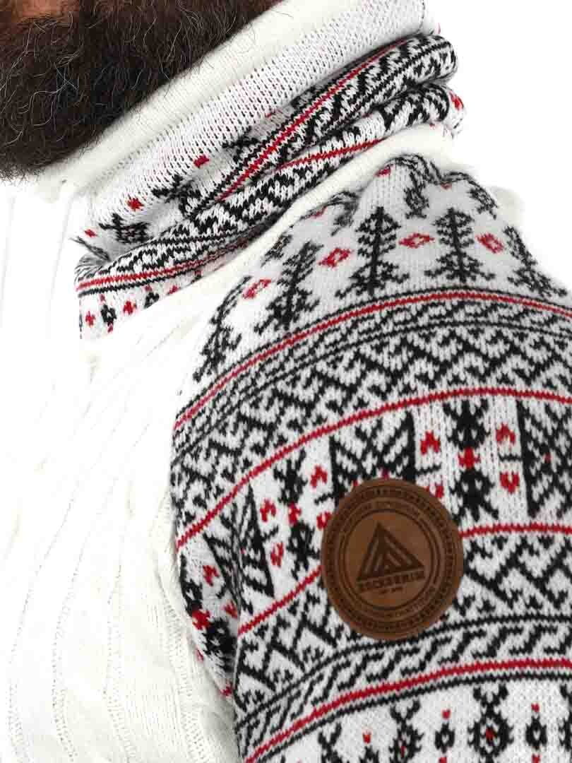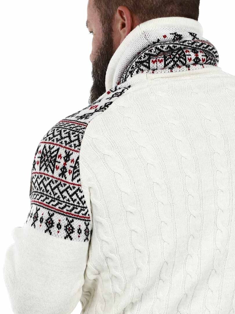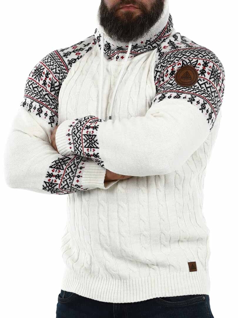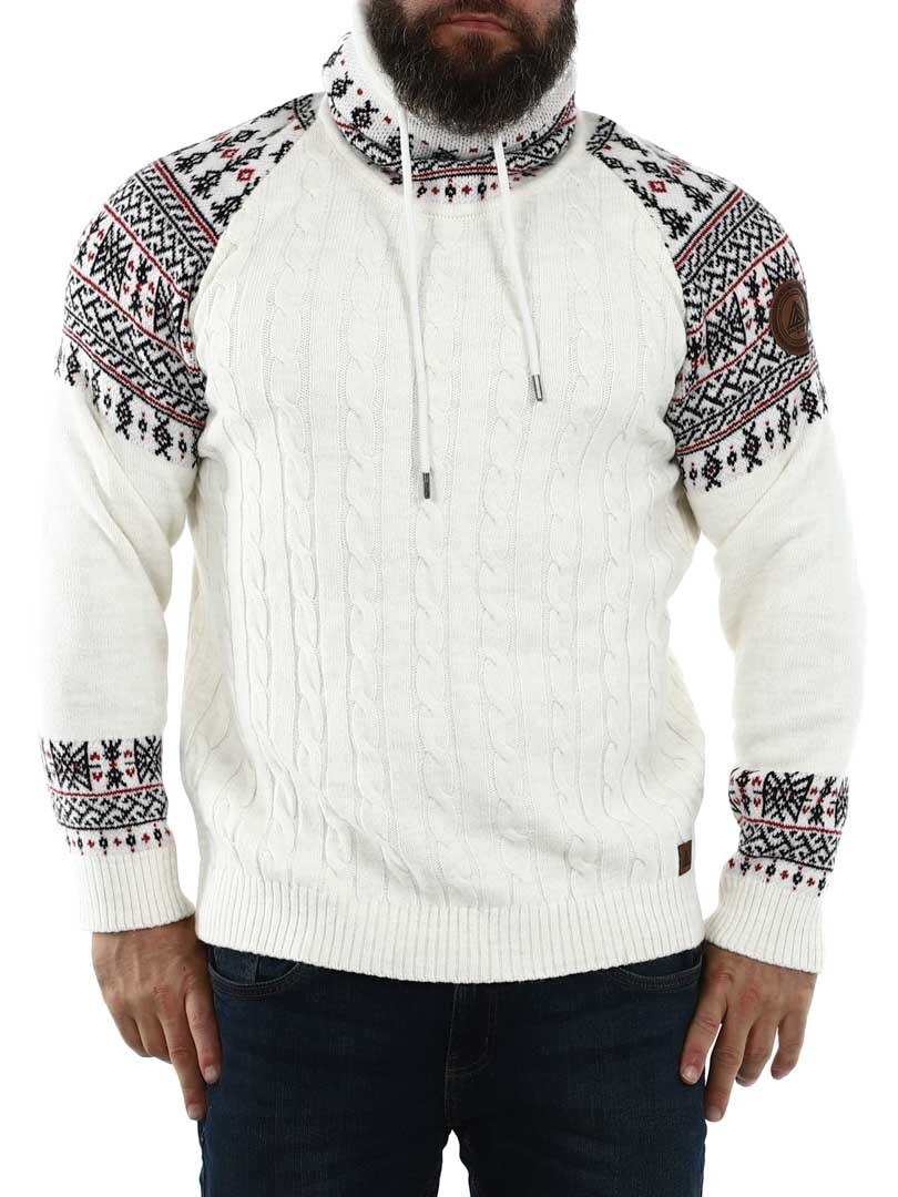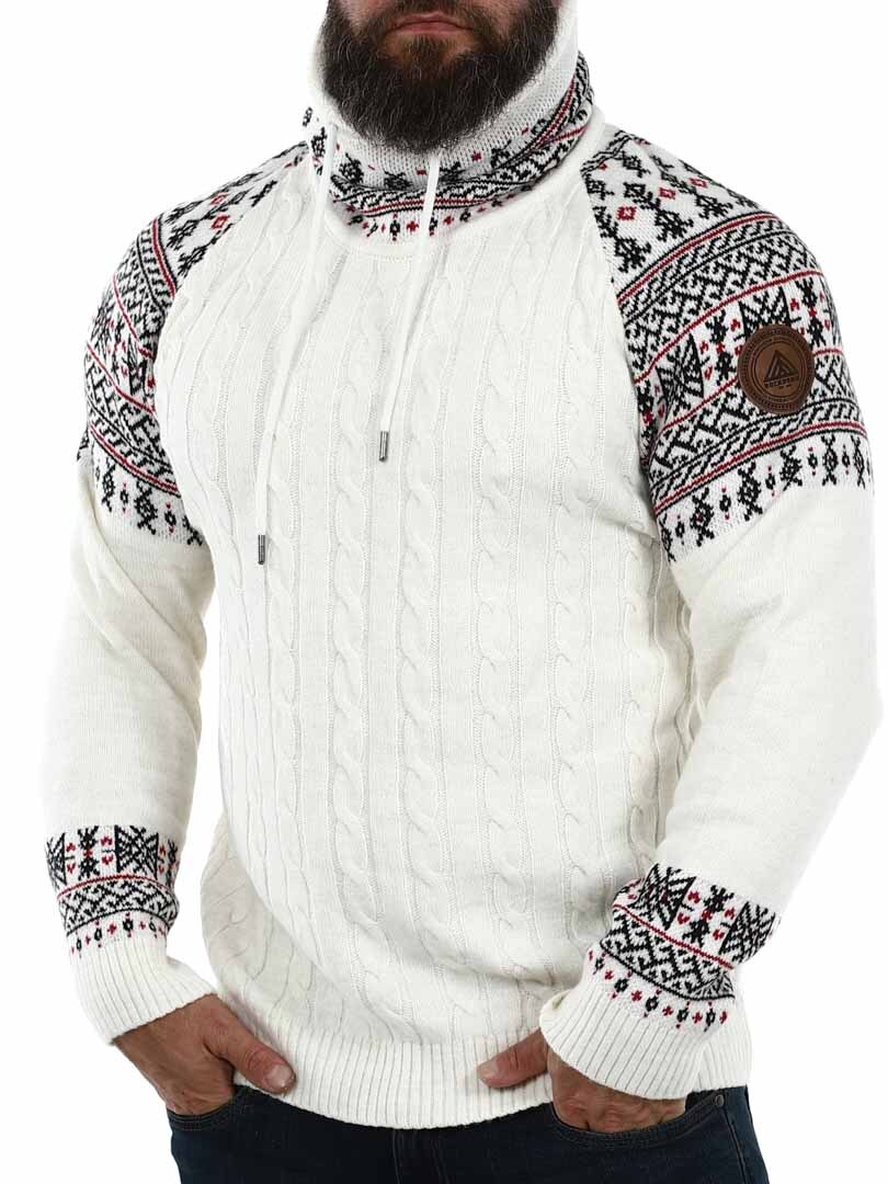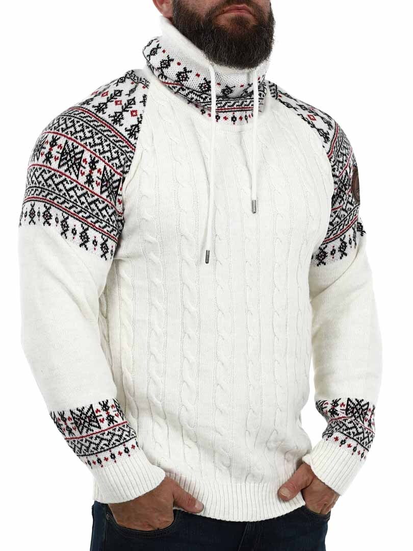 Sweter warkoczowy z mieszanki wełny i kaszmiru, dzięki czemu jest bardzo wygodny i ciepły. Zaprojektowane z wysokim dekoltem, który można regulować za pomocą sznurówek. Rękawy i dekolt podkreślone ładnym wzorem w kontrastowych kolorach. Ta koszula została stworzona specjalnie dla naszych klientów i jest dostępna tylko w RockDenim!
