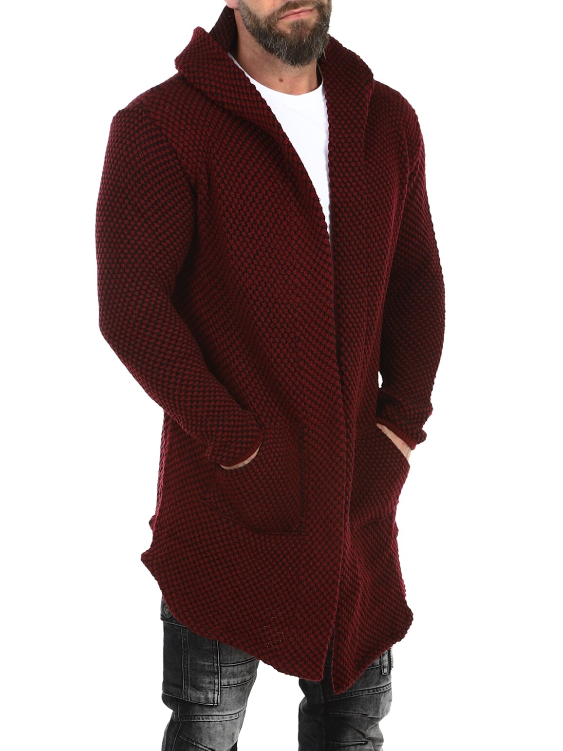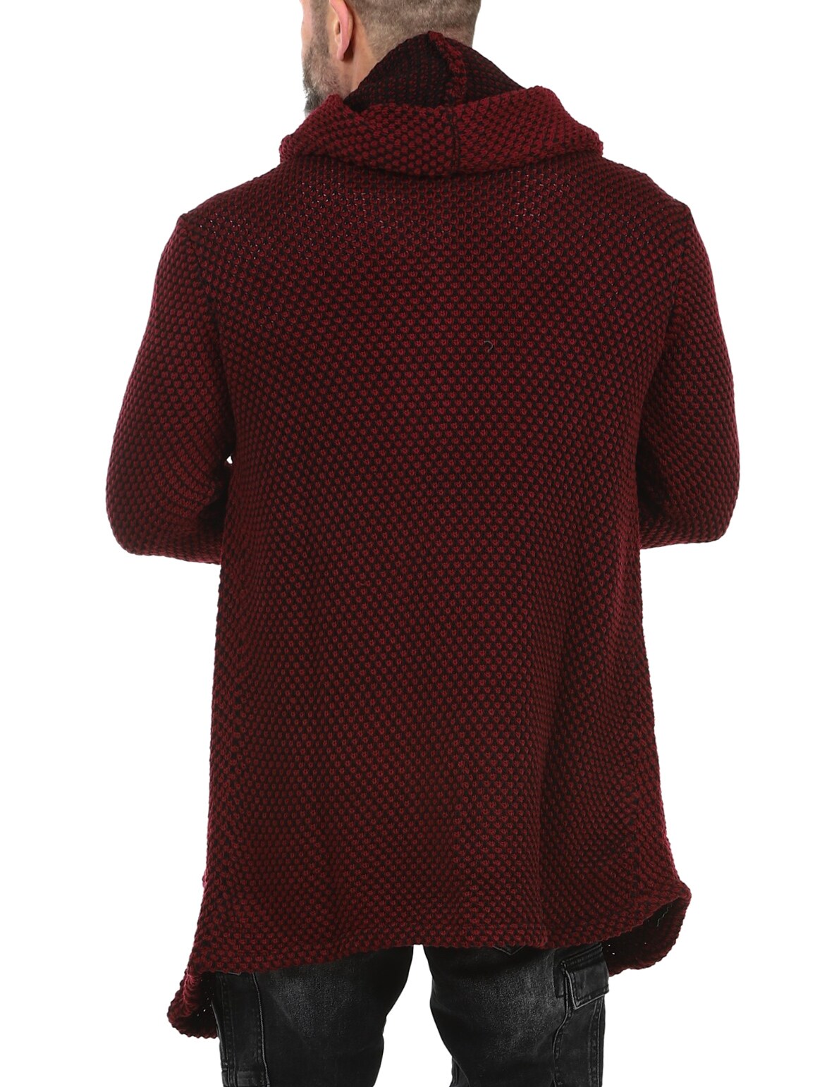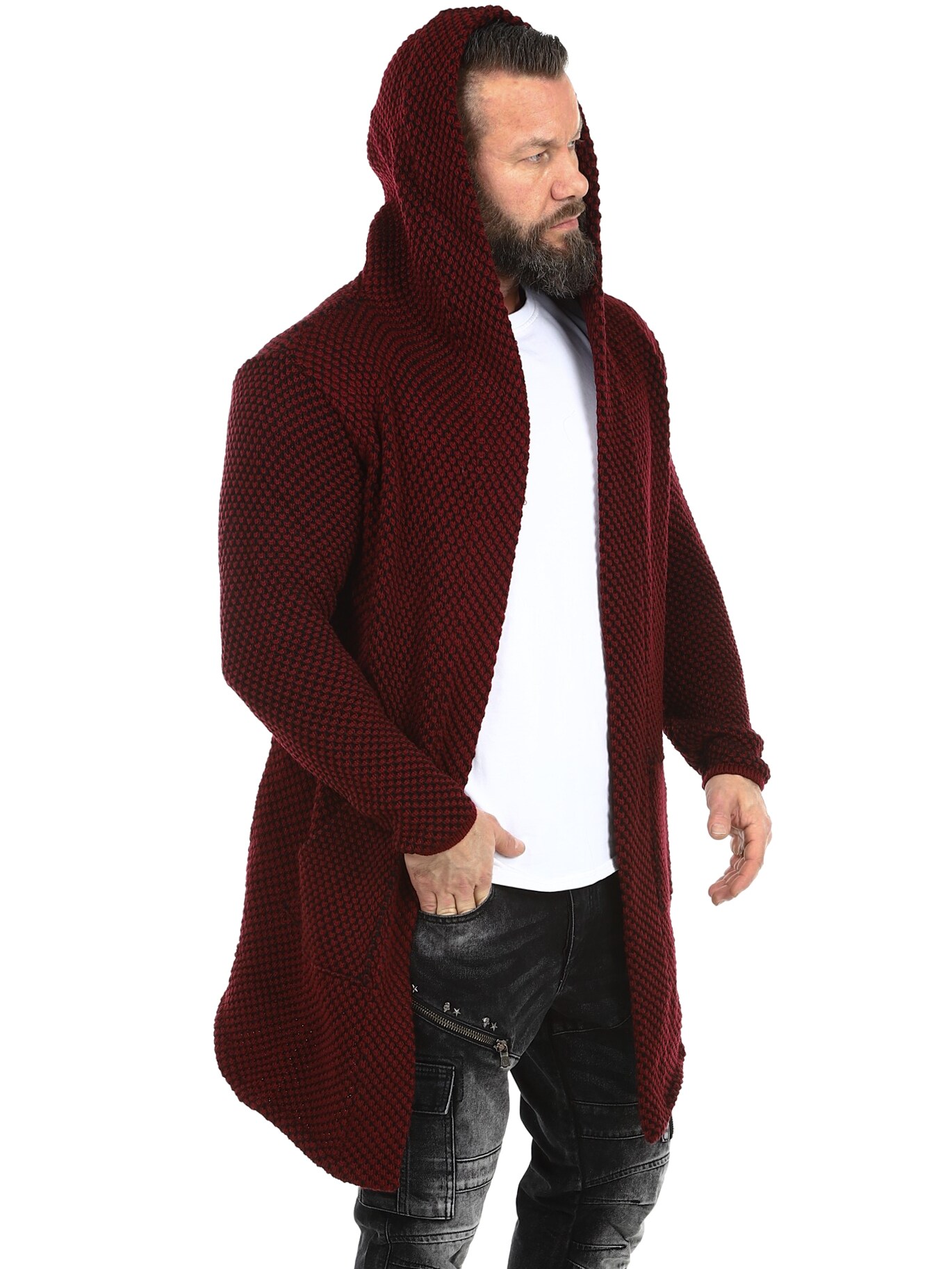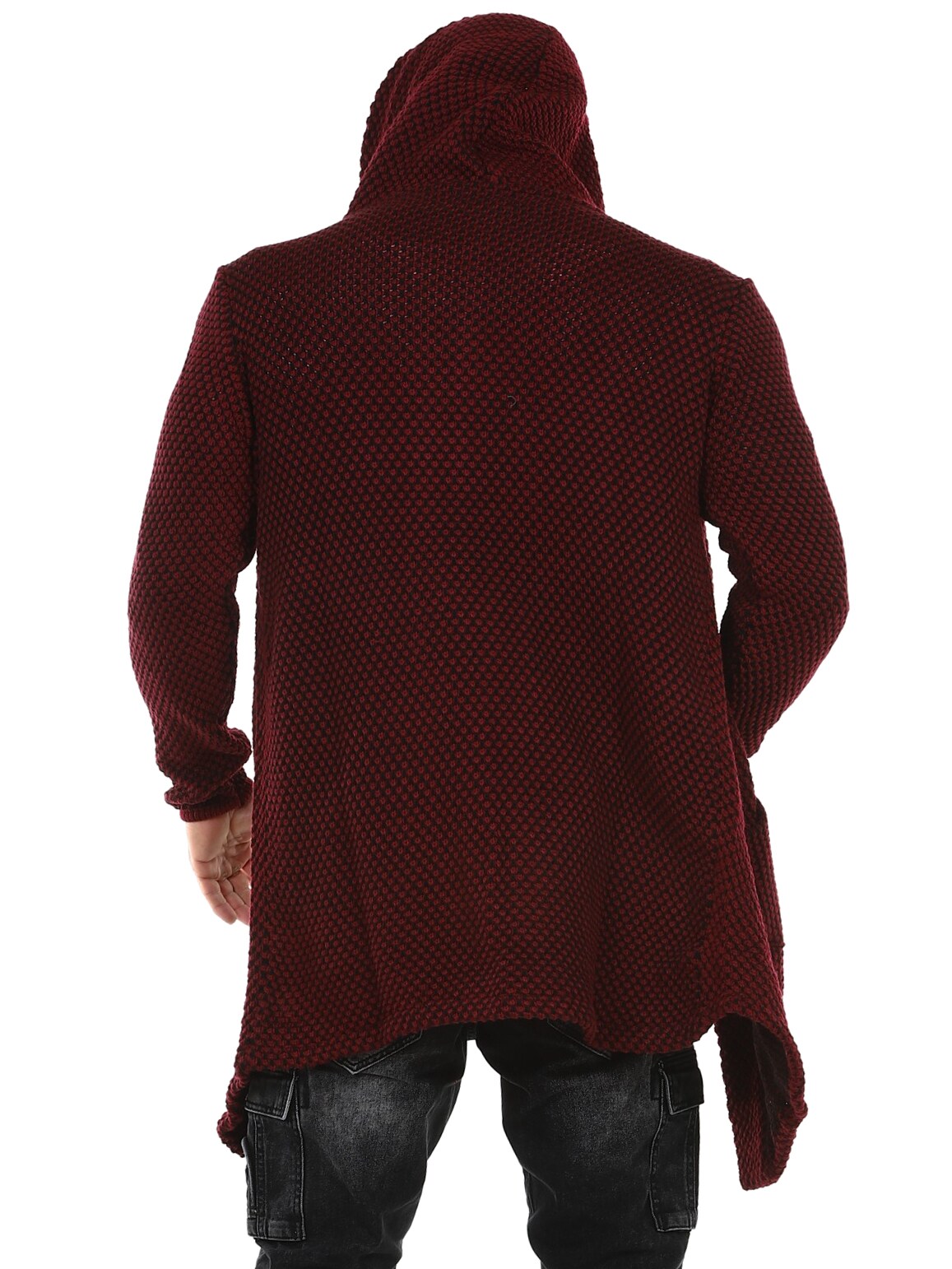 Sweter z grubej dzianiny o ciekawym wzorze. Długi i elastyczny model zakończony w szpic, z obszernym kapturem. Wykonany z wygodnego i ciepłego materiału.