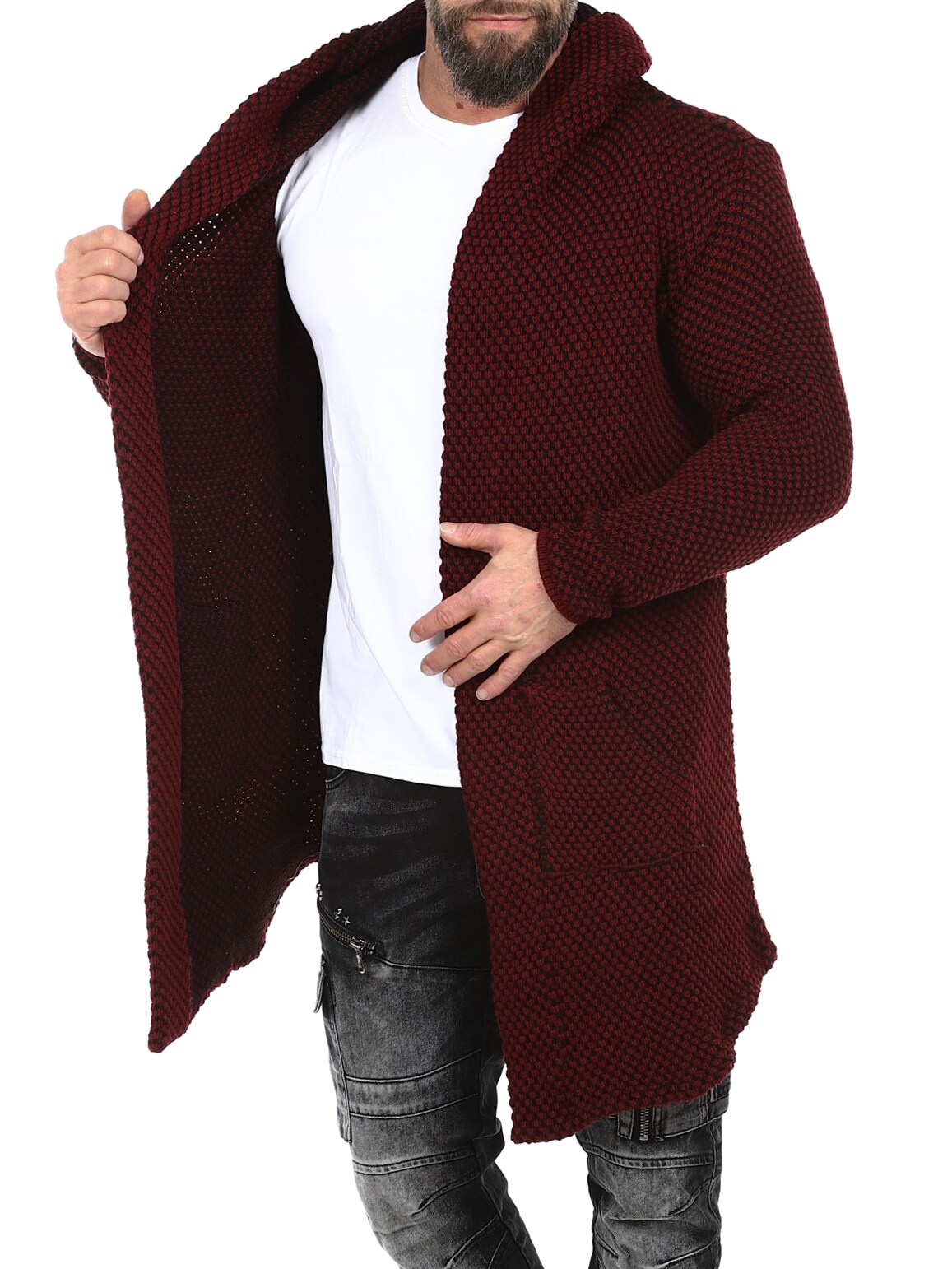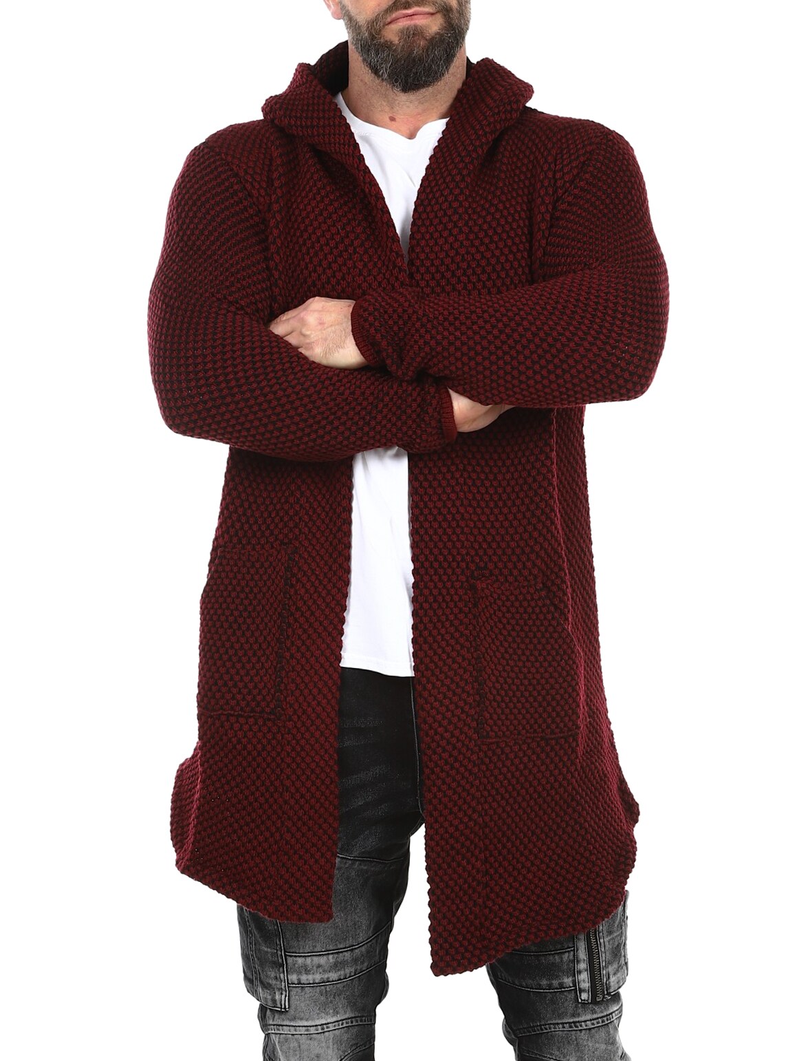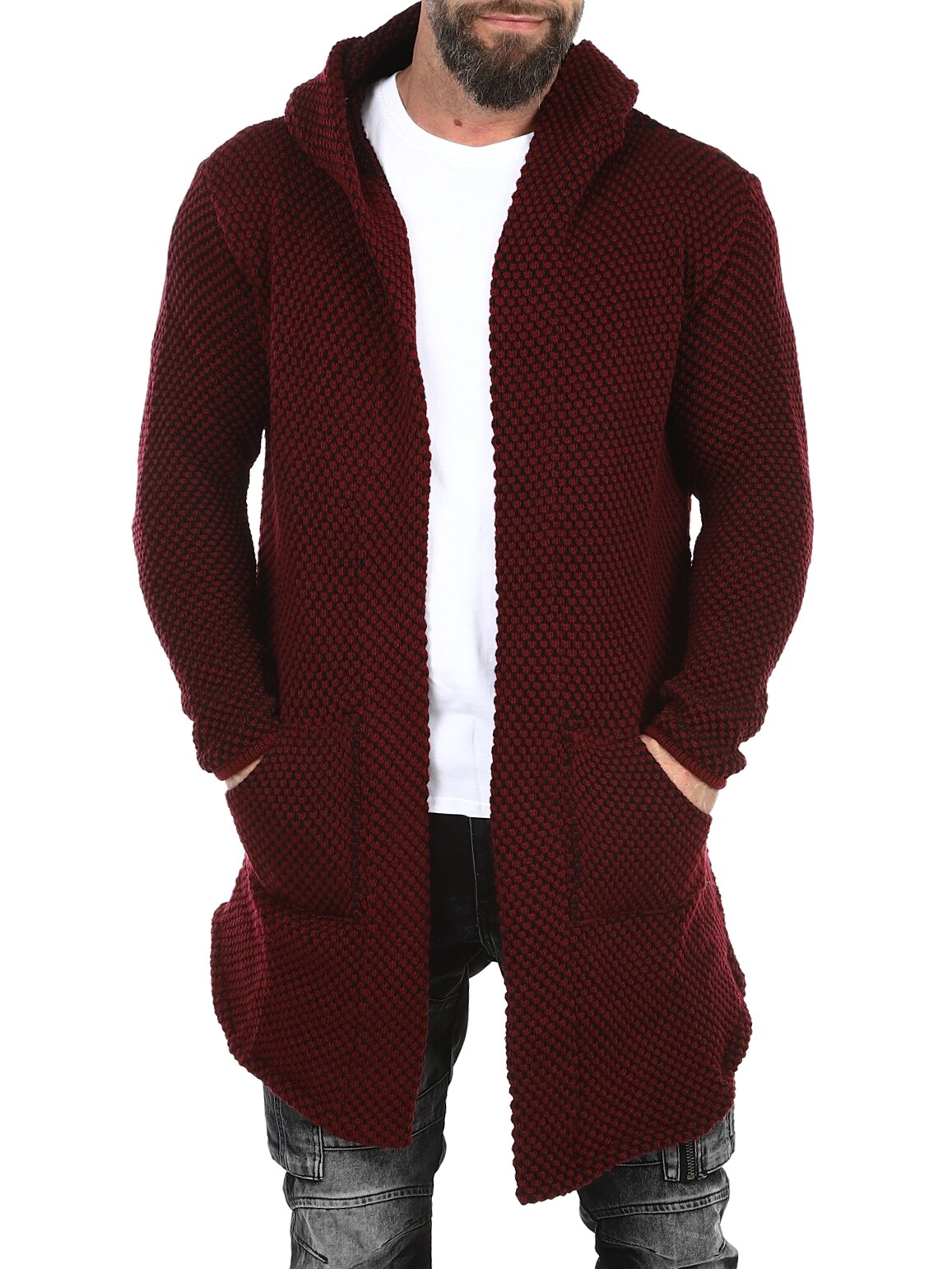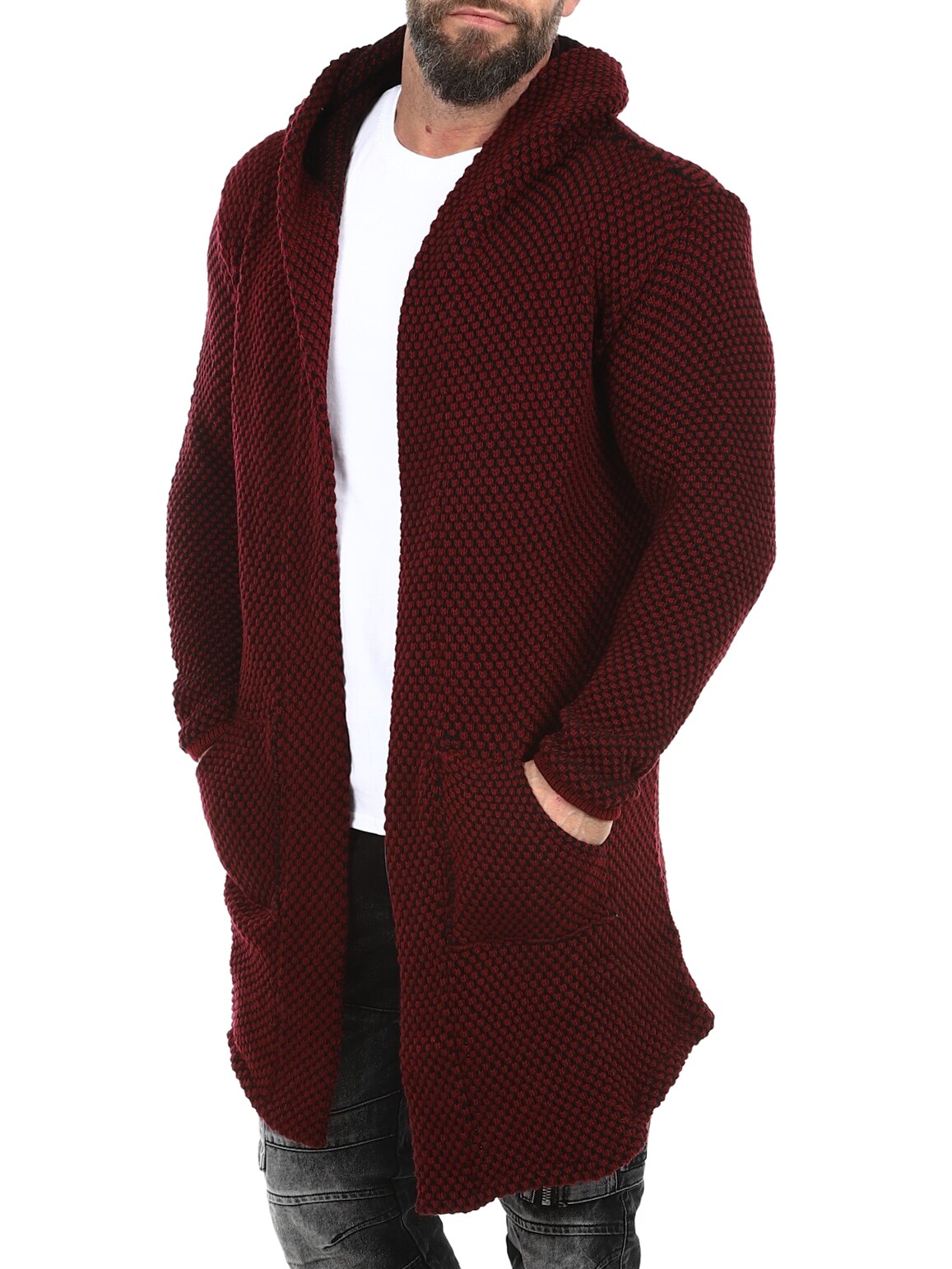 Sweter z grubej dzianiny o ciekawym wzorze. Długi i elastyczny model zakończony w szpic, z obszernym kapturem. Wykonany z wygodnego i ciepłego materiału.