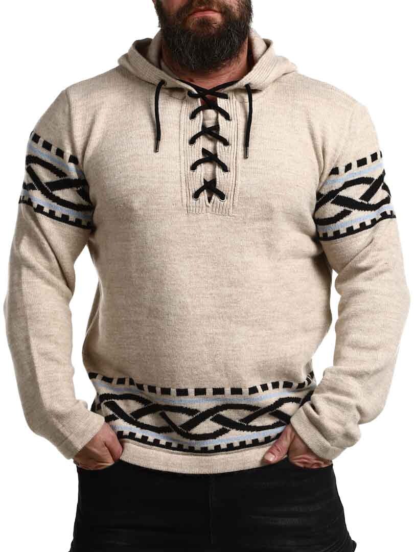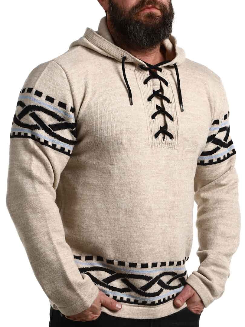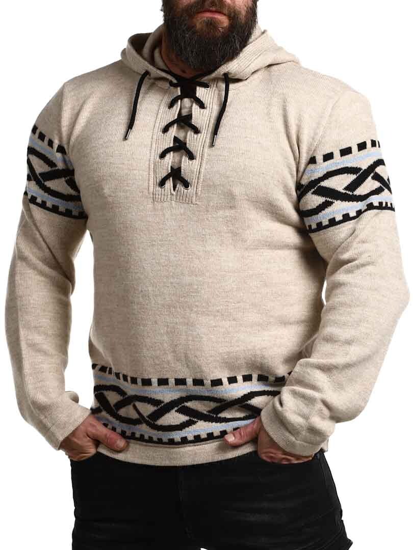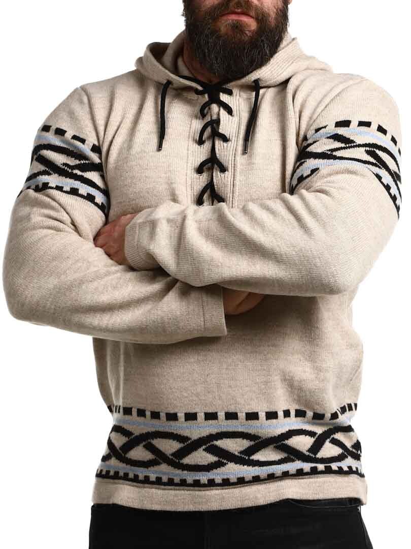 Poczuj siłę Północy dzięki naszej bluzy z kapturem inspirowanej wikingami – doskonałe połączenie surowego stylu i nowoczesnego komfortu. Bluza posiada autentyczny nordycki wzór z wyraźnymi wikińskimi detalami na rękawach i dole, a sznurowanie przy dekolcie nadaje jej tradycyjny i mocny charakter. Wykonana z miękkiego, ciepłego materiału, zapewnia wygodę przez cały dzień – zarówno na świeżym powietrzu, jak i na co dzień, gdy chcesz się wyróżnić.