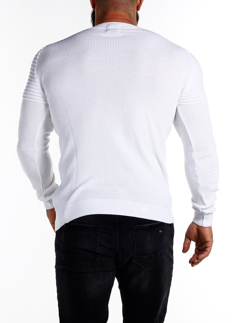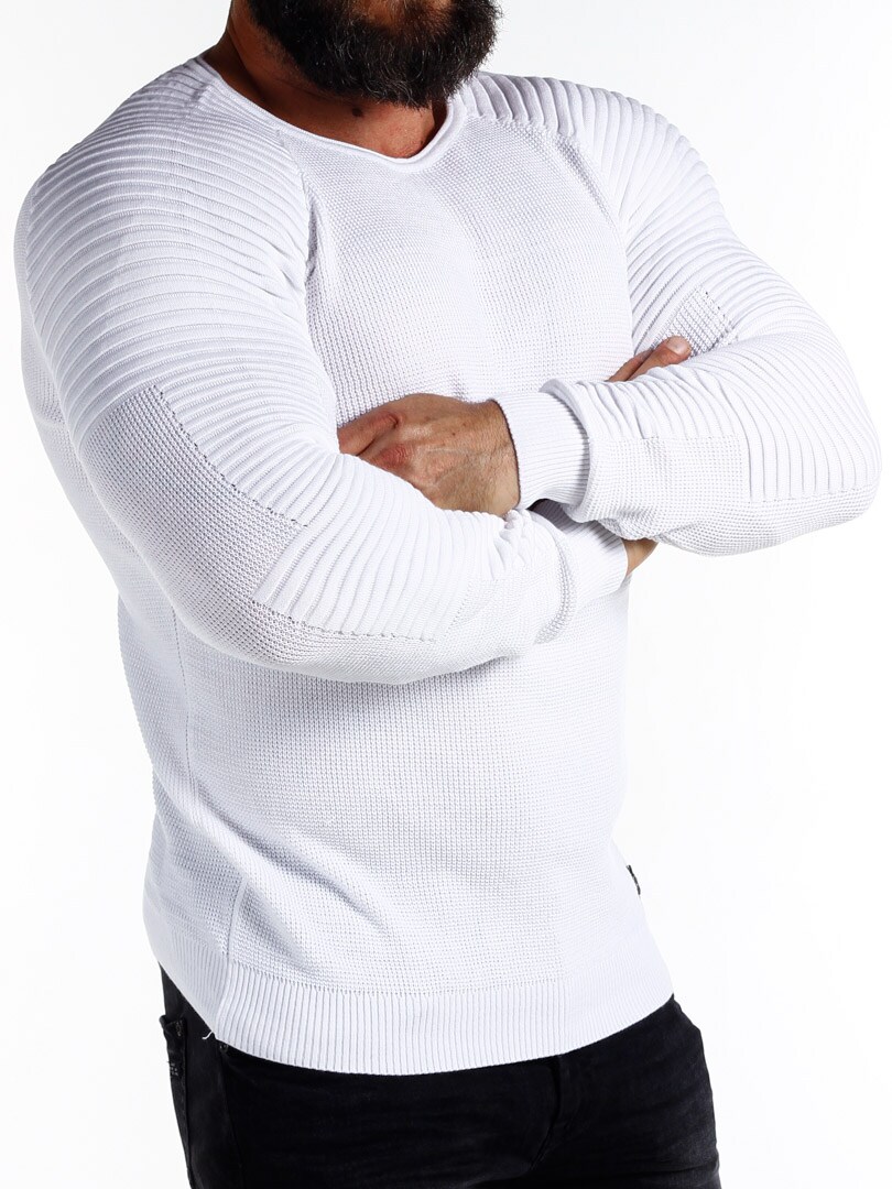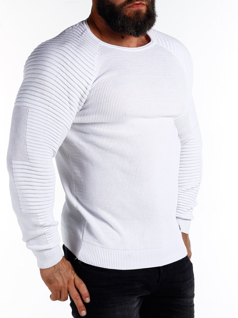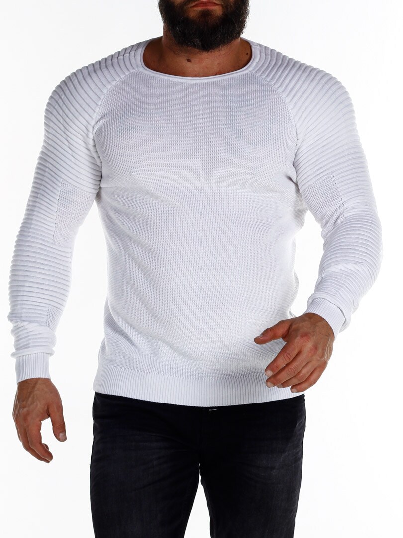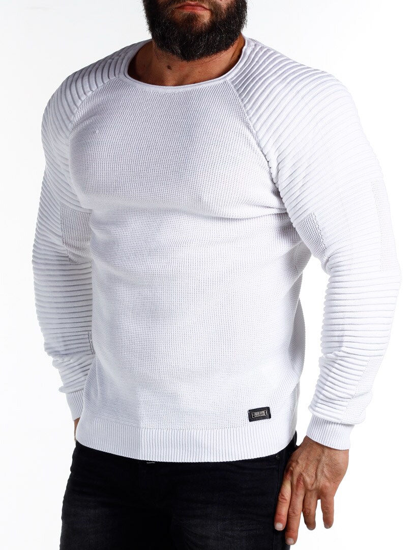Elastyczny sweter z dzianiny o różnych wzorach i okrągłym dekolcie. Ramiona i rękawy wykonane są z grubszego splotu, co nadaje całości efektowny kontrast. Na dole widoczna mała naszywka z czarnej imitacji skóry. Dostępny w kilku kolorach!