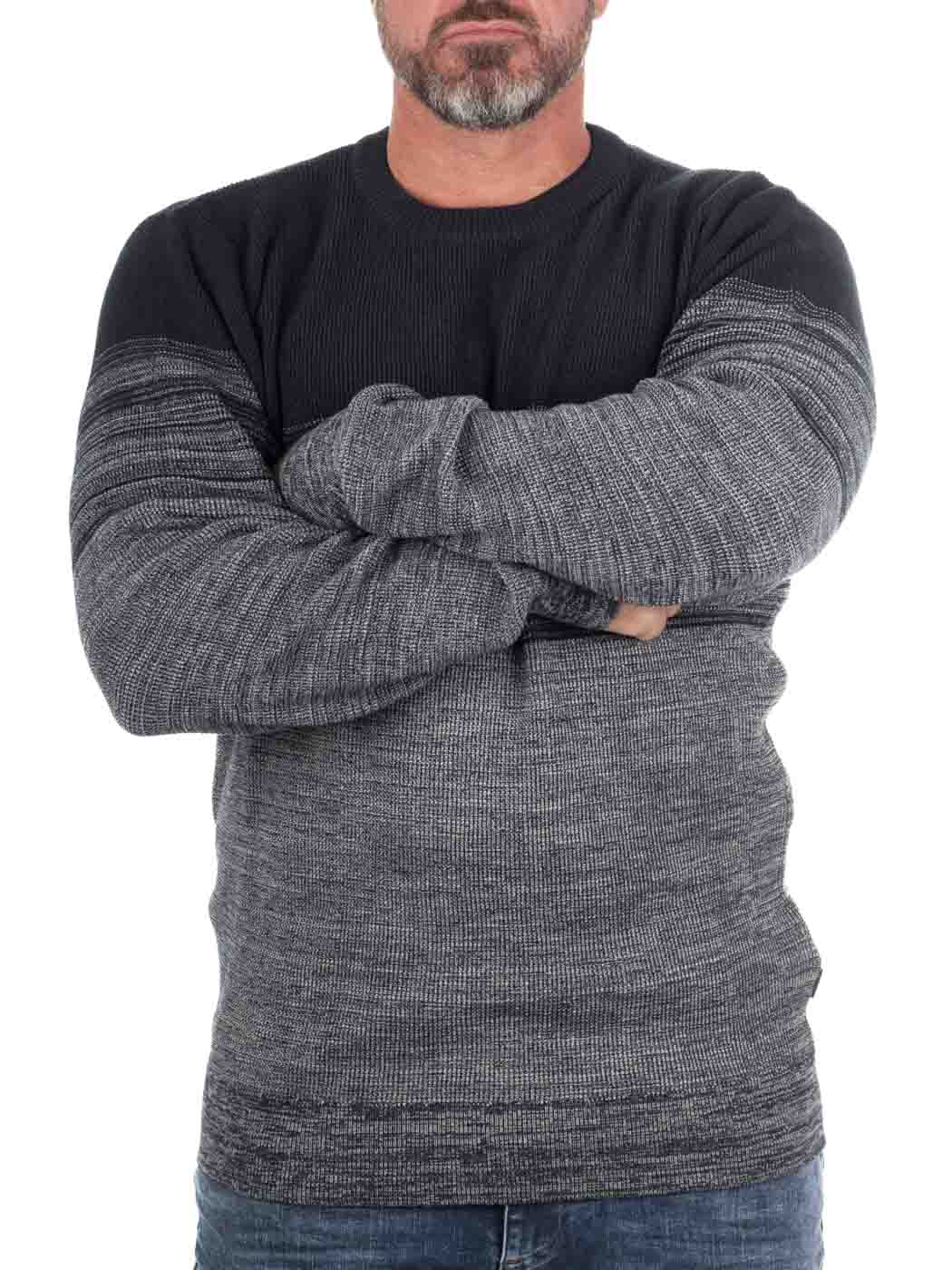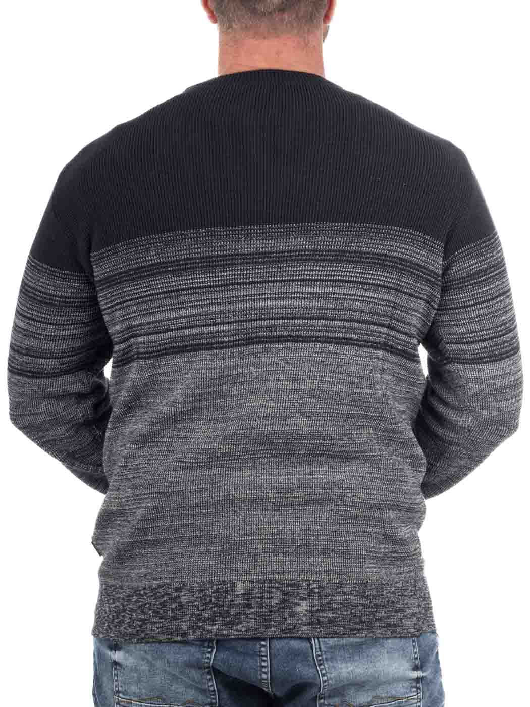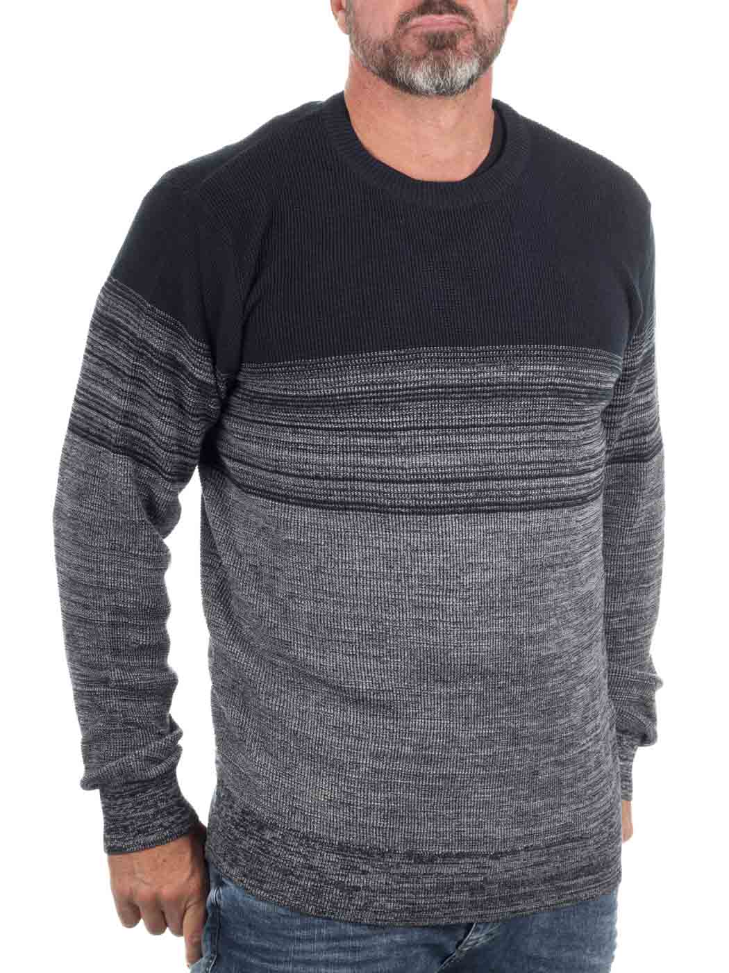 Stylowy dzianinowy sweter z subtelnym przejściem kolorystycznym z granatu do szarości. Prążkowane ściągacze przy dekolcie, rękawach i u dołu zapewniają dobre dopasowanie. Uniwersalny model, który świetnie wygląda zarówno z jeansami na co dzień, jak i narzucony na koszulę – idealne połączenie stylu i wygody.