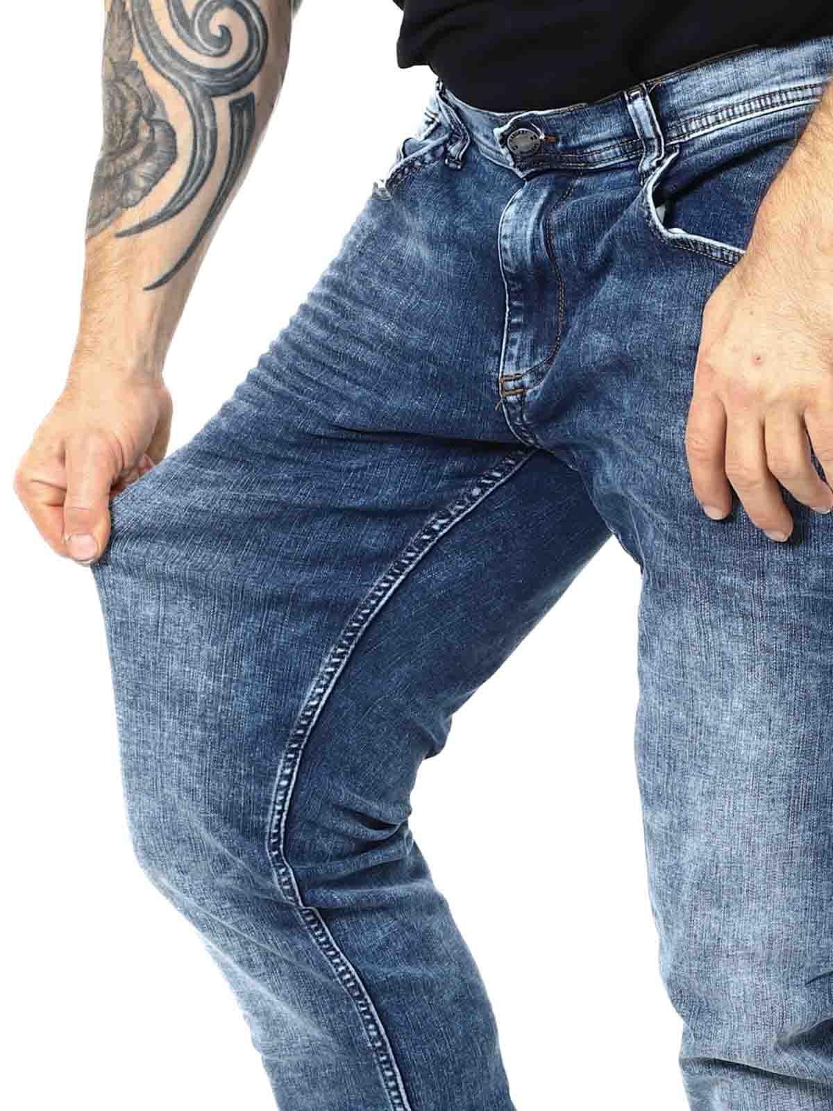 Niebieskie dżinsy z technologią Multiflex, która zapewnia dodatkową rozciągliwość i wysoki komfort noszenia. Mają regularną talię oraz zwężane nogawki. Trzy kieszenie z przodu, dwie z tyłu i szlufki w pasie.