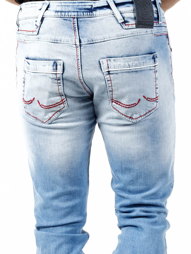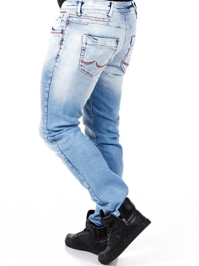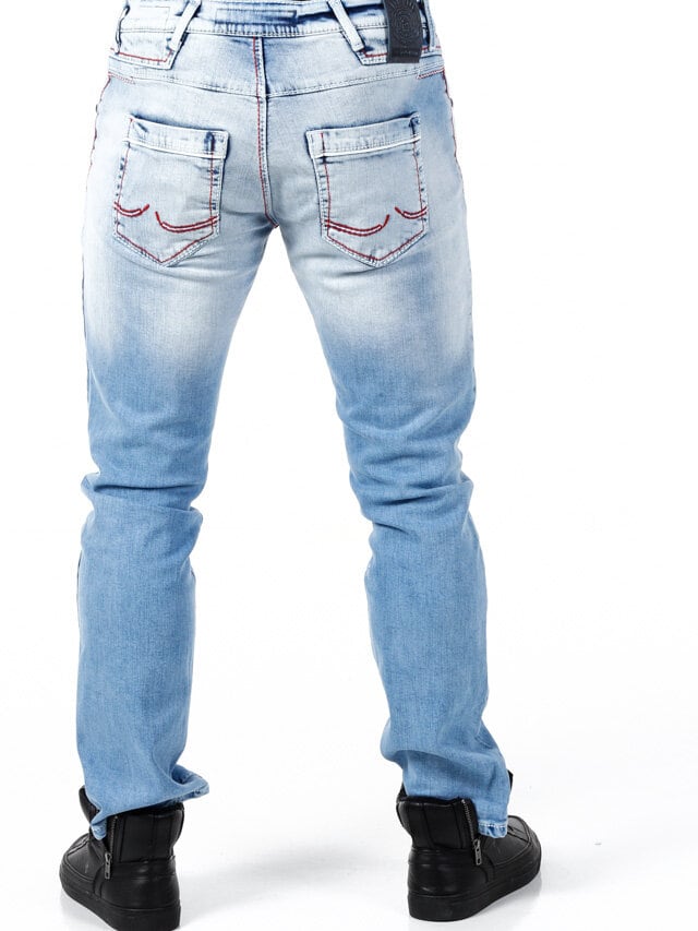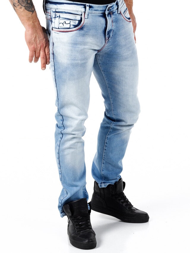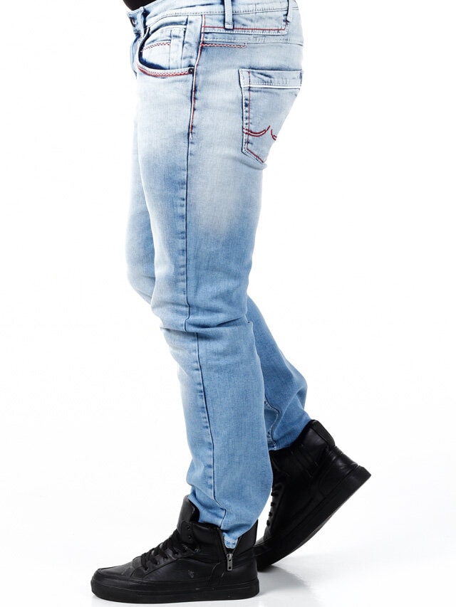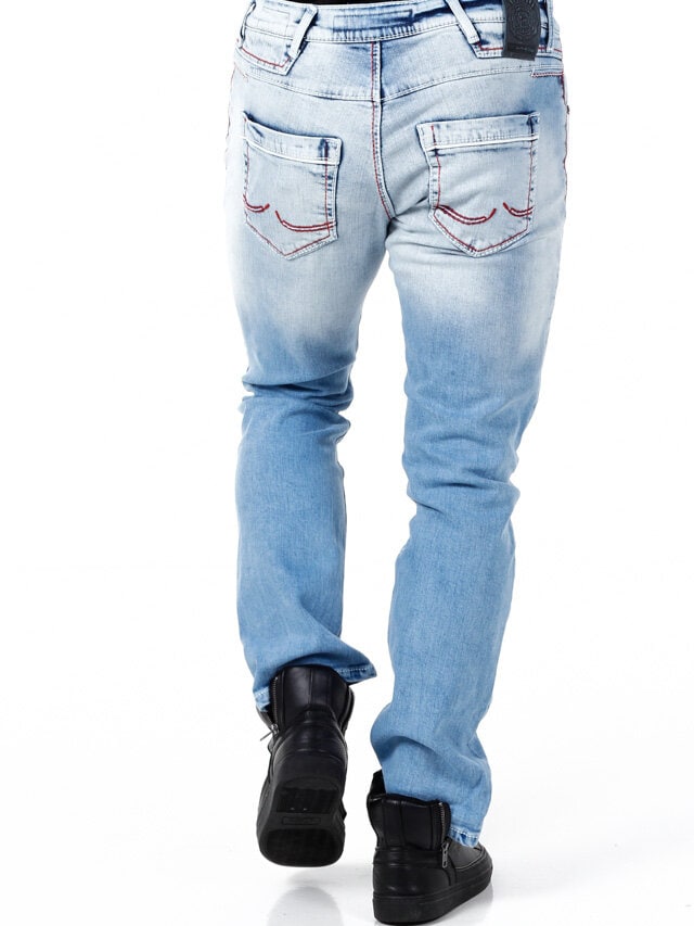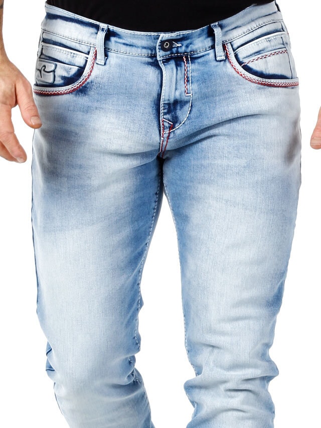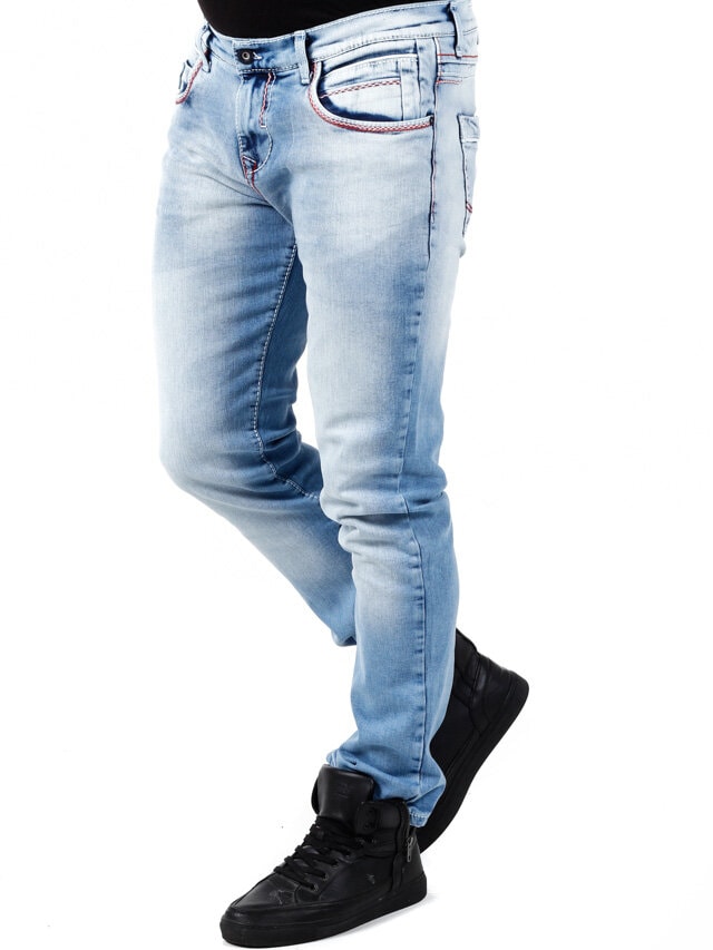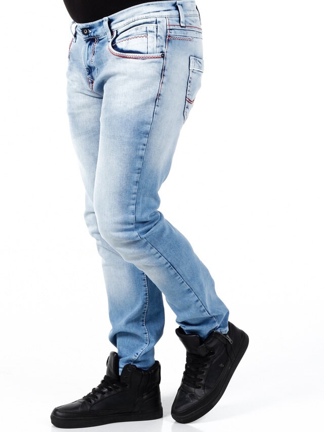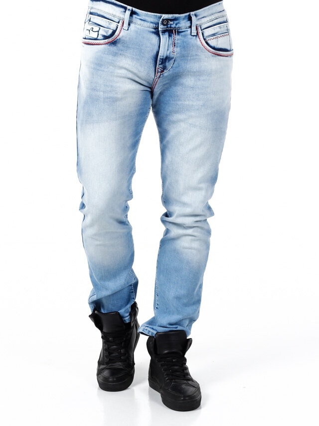 Stylowe jeansy z widocznymi szwami w kontrastowych kolorach. Elastyczny model o klasycznym kroju. Sześć przednich kieszeni i dwie tylne.