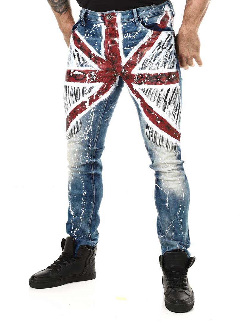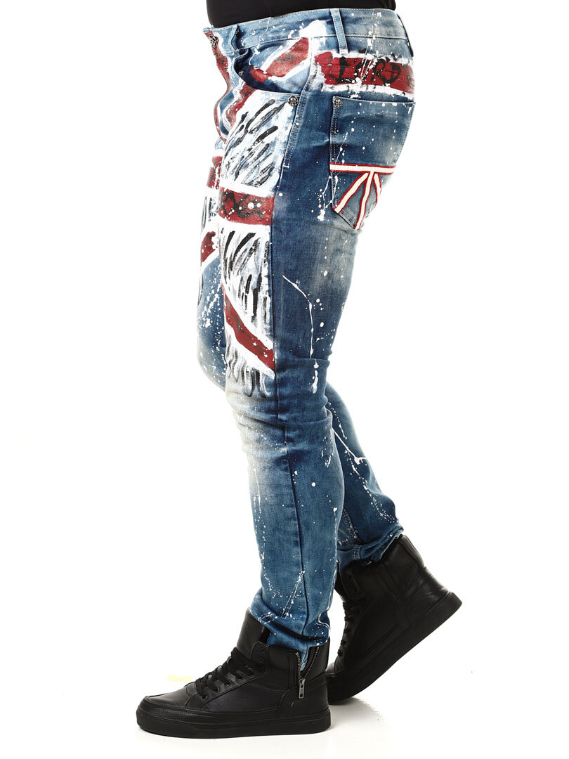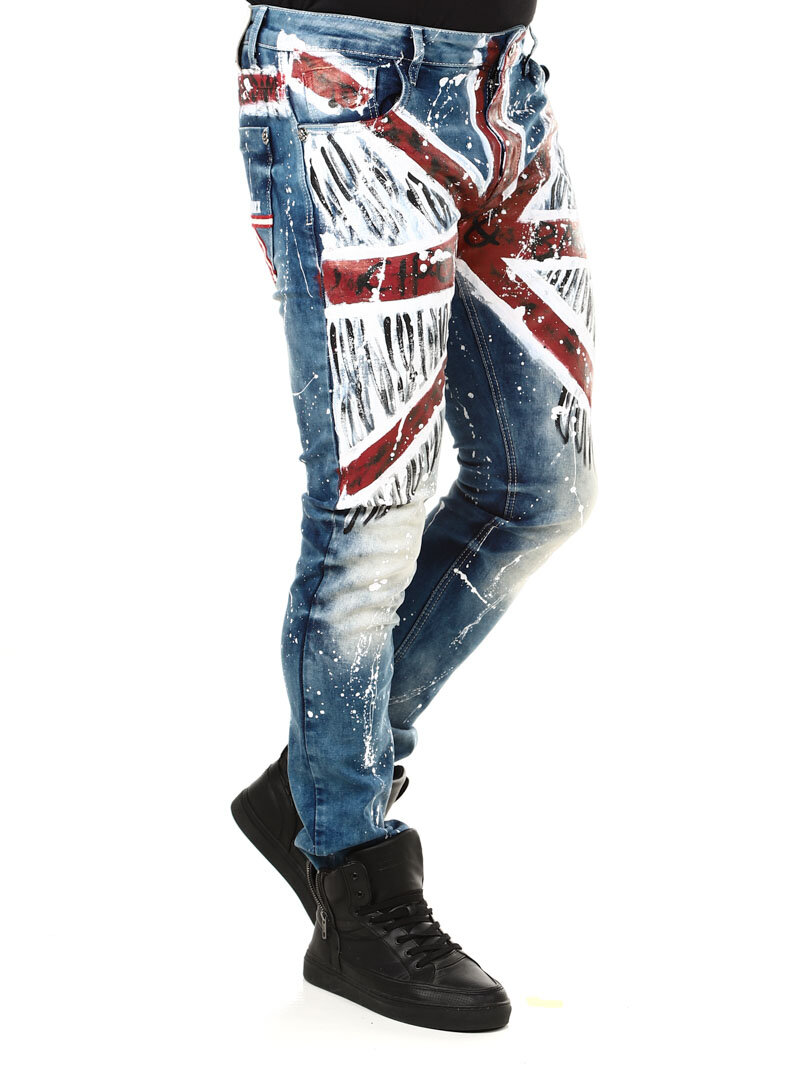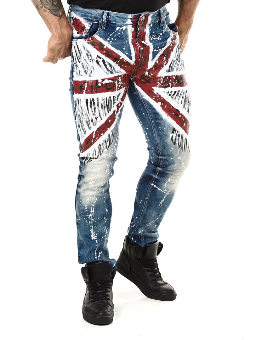 Wyjątkowe i niepowtarzalne jeansy z malowanym dużym brytyjskim motywem z przodu oraz plamami koloru z tyłu i logo. Posiadają trzy kieszenie z przodu, dwie z tyłu oraz szlufki w pasie. Jeśli chcesz być wyjątkowy i wyróżniać się, te jeansy są właśnie dla Ciebie!