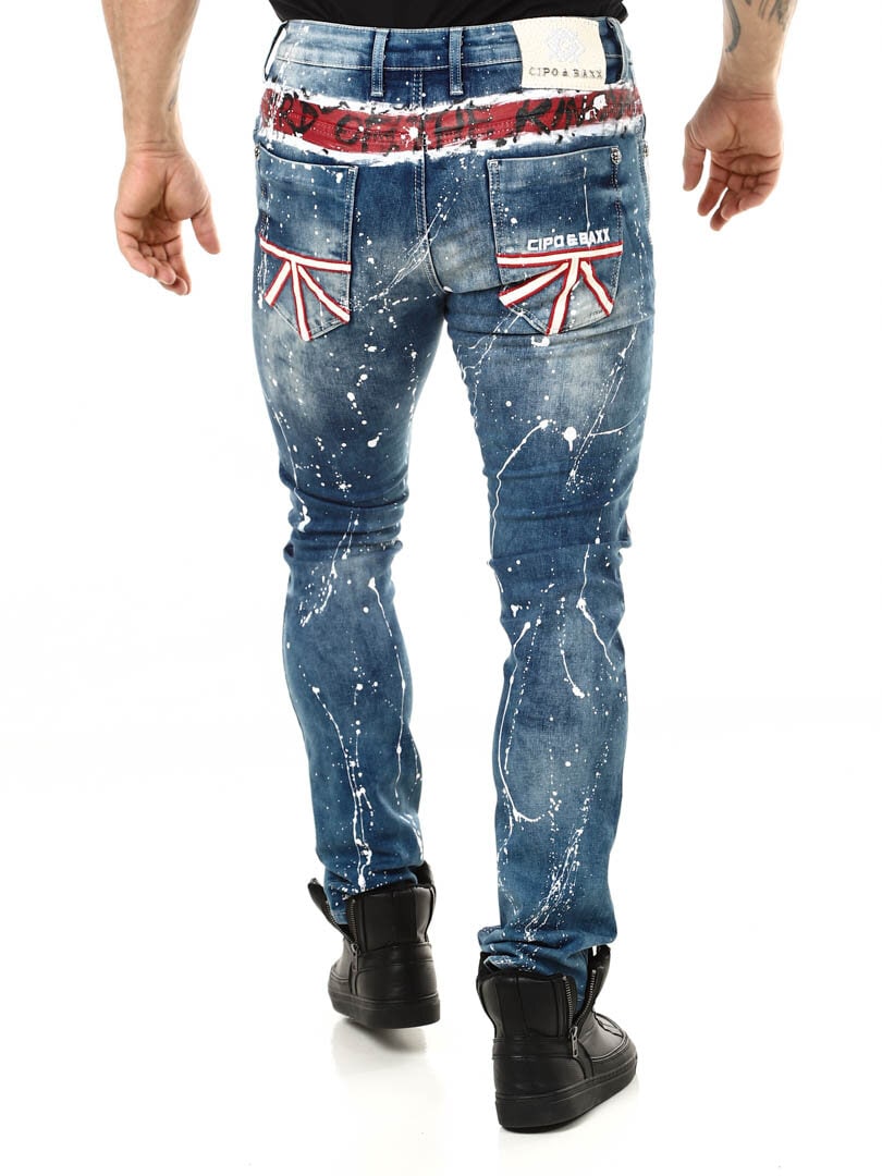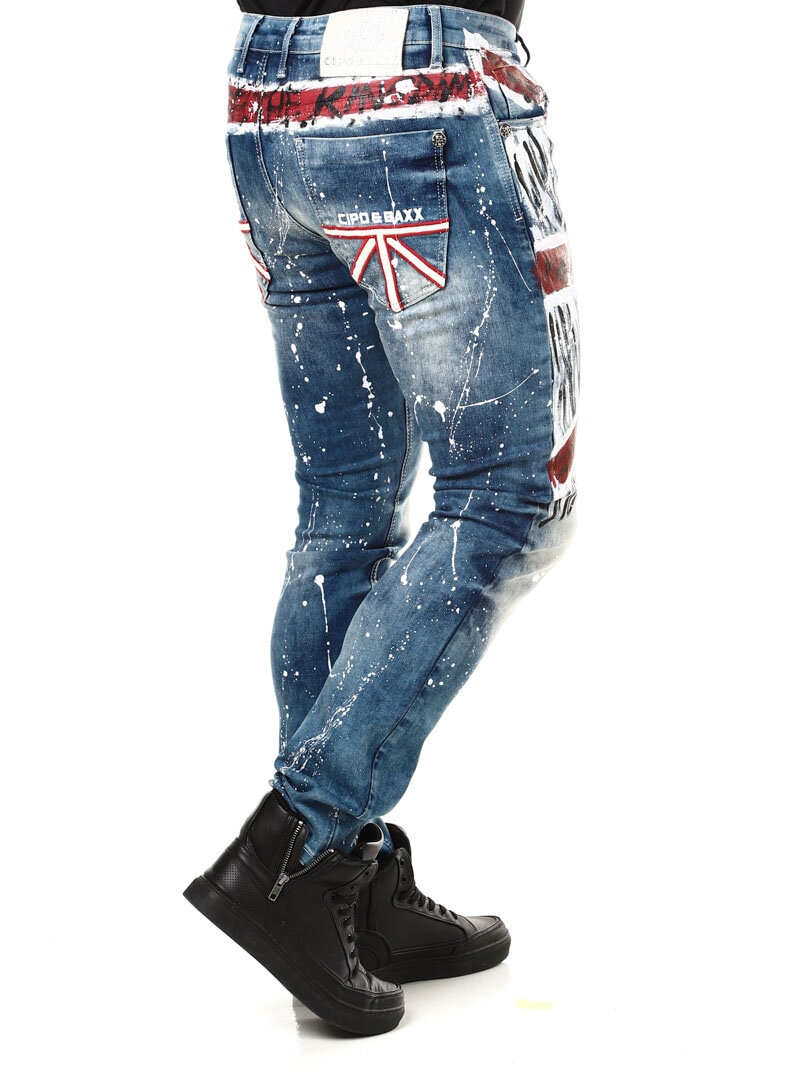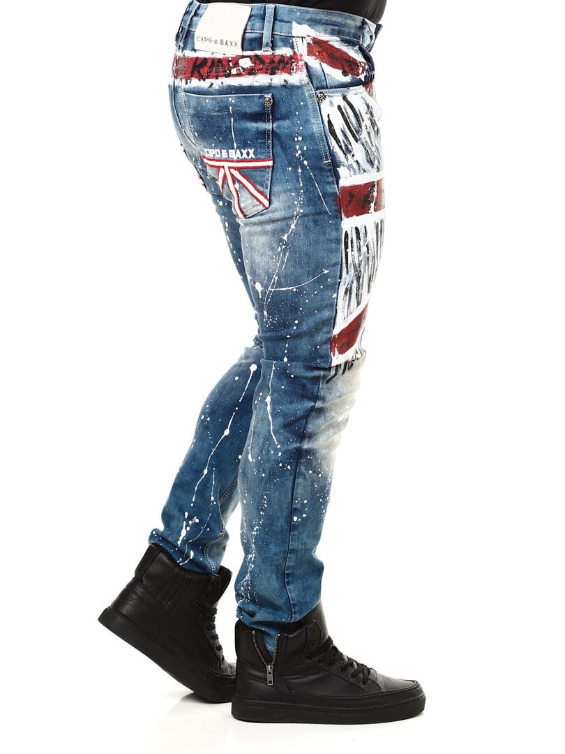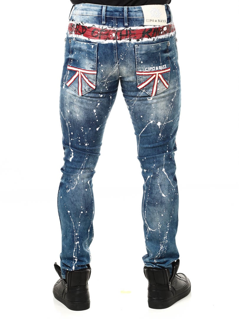 Wyjątkowe i niepowtarzalne jeansy z malowanym dużym brytyjskim motywem z przodu oraz plamami koloru z tyłu i logo. Posiadają trzy kieszenie z przodu, dwie z tyłu oraz szlufki w pasie. Jeśli chcesz być wyjątkowy i wyróżniać się, te jeansy są właśnie dla Ciebie!
