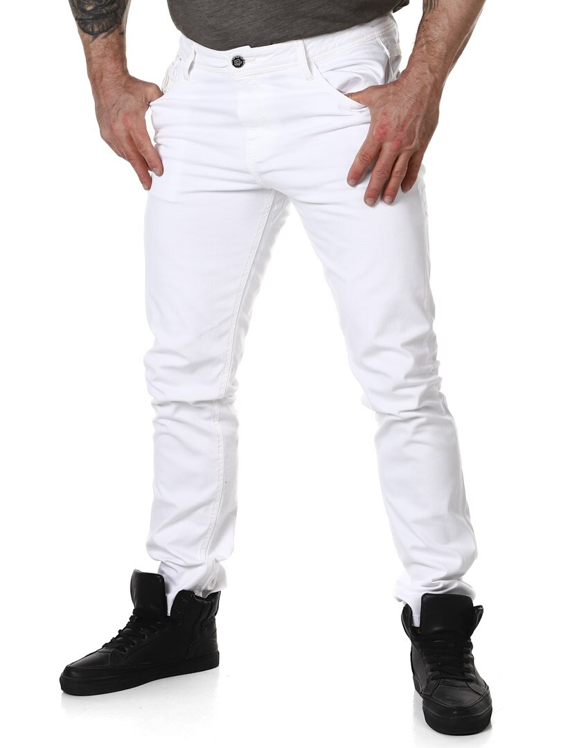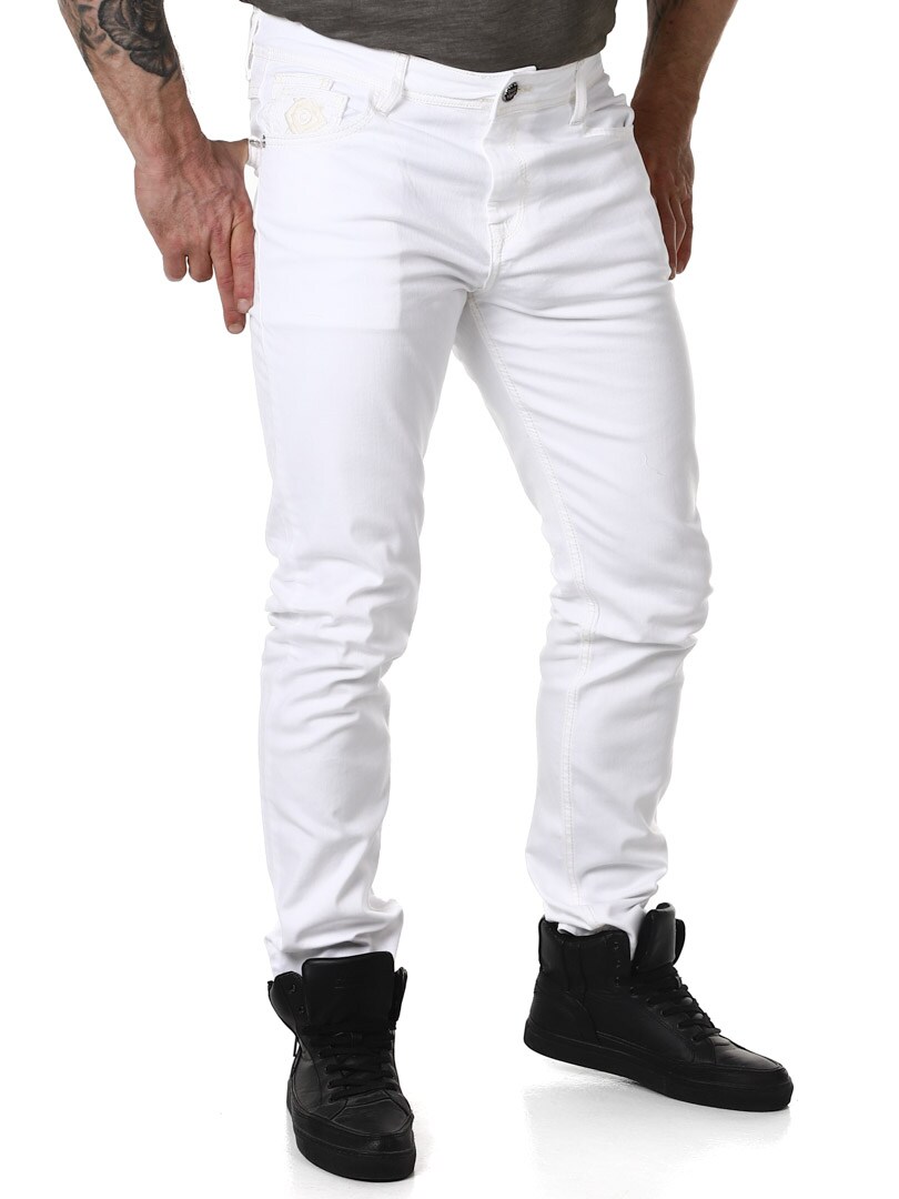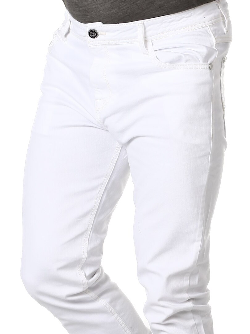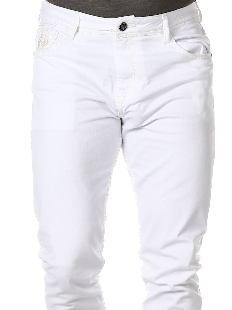 Białe jeansy z lekko ciemniejszymi szwami i naszytym nadrukiem z przodu i z tyłu. Posiada sześć kieszeni, w pasie szlufki, z tyłu metka z logo.