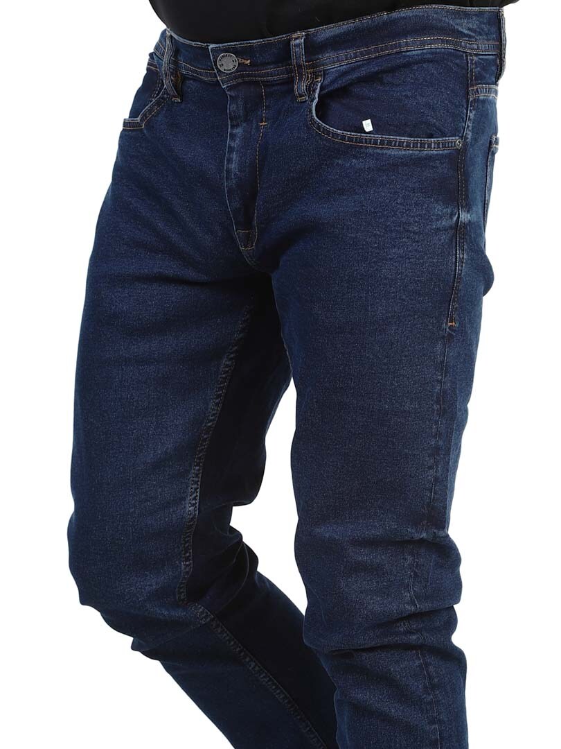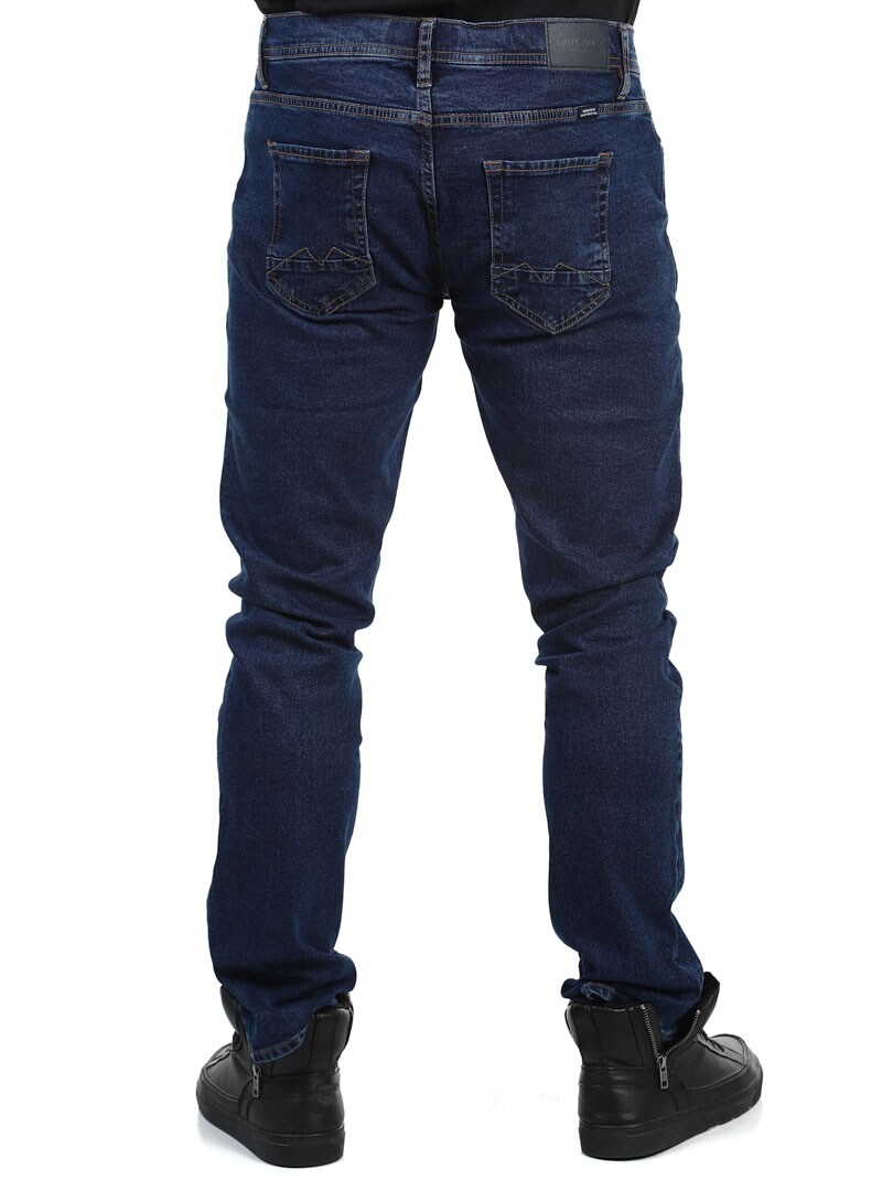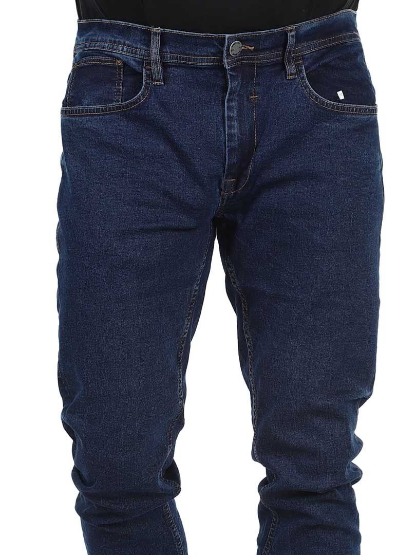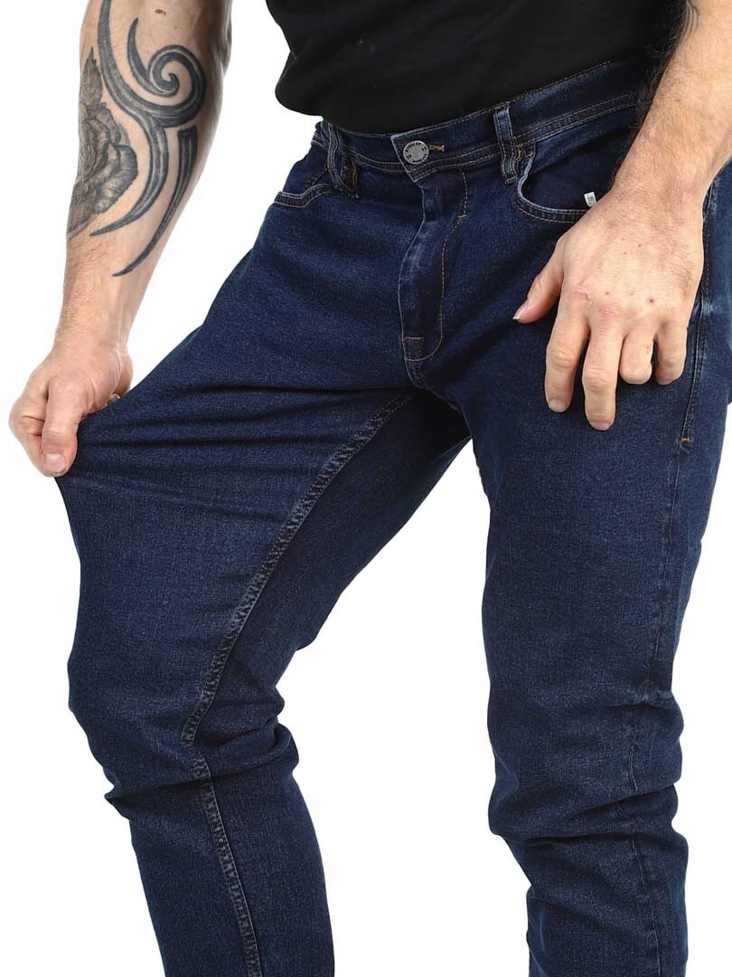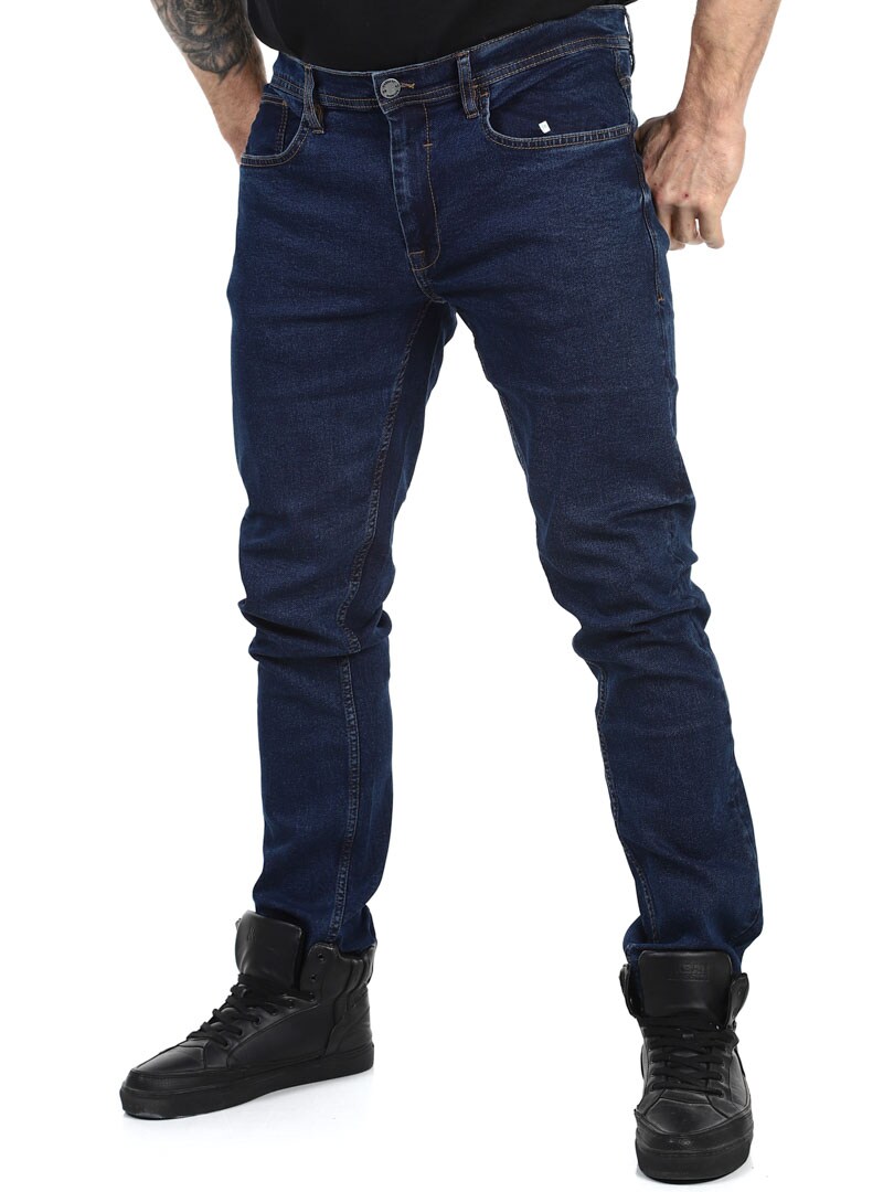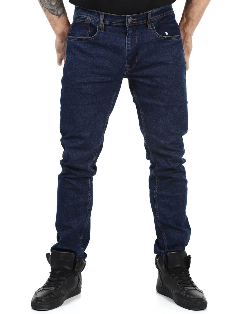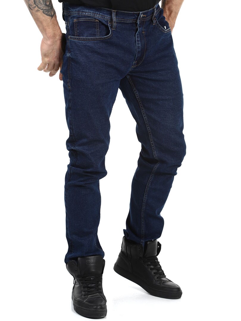 Granatowe, klasyczne spodnie z elastycznego denimu. Model z 5 kieszeniami, normalną talią i zwężanymi nogawkami. Jeansy basic możesz dopasować właściwie do każdego stylu!