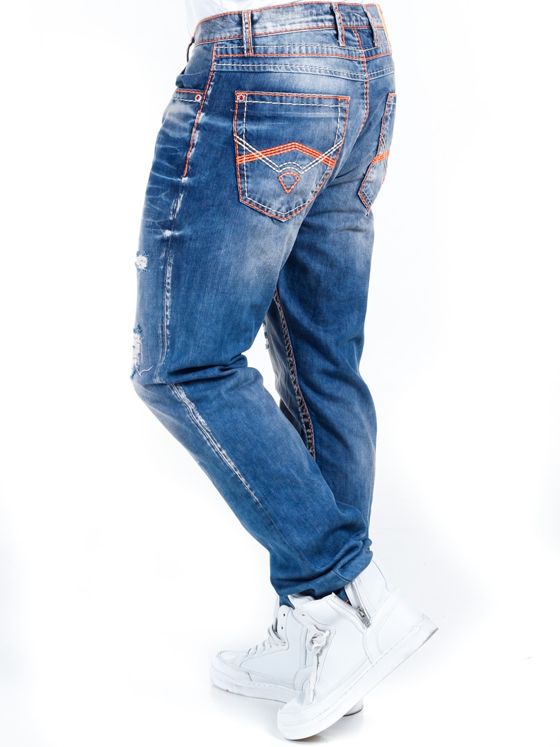 Jeansowe spodnie z przetarciami i widocznymi szwami w neonowo pomarańczowym i białym kolorze. Klasyczny model z trzema przednimi kieszeniami i dwiema tylnymi kieszeniami. Mają neonową pomarańczową naszywkę w pasie z tyłu, która zapewnia wyjątkowy detal!