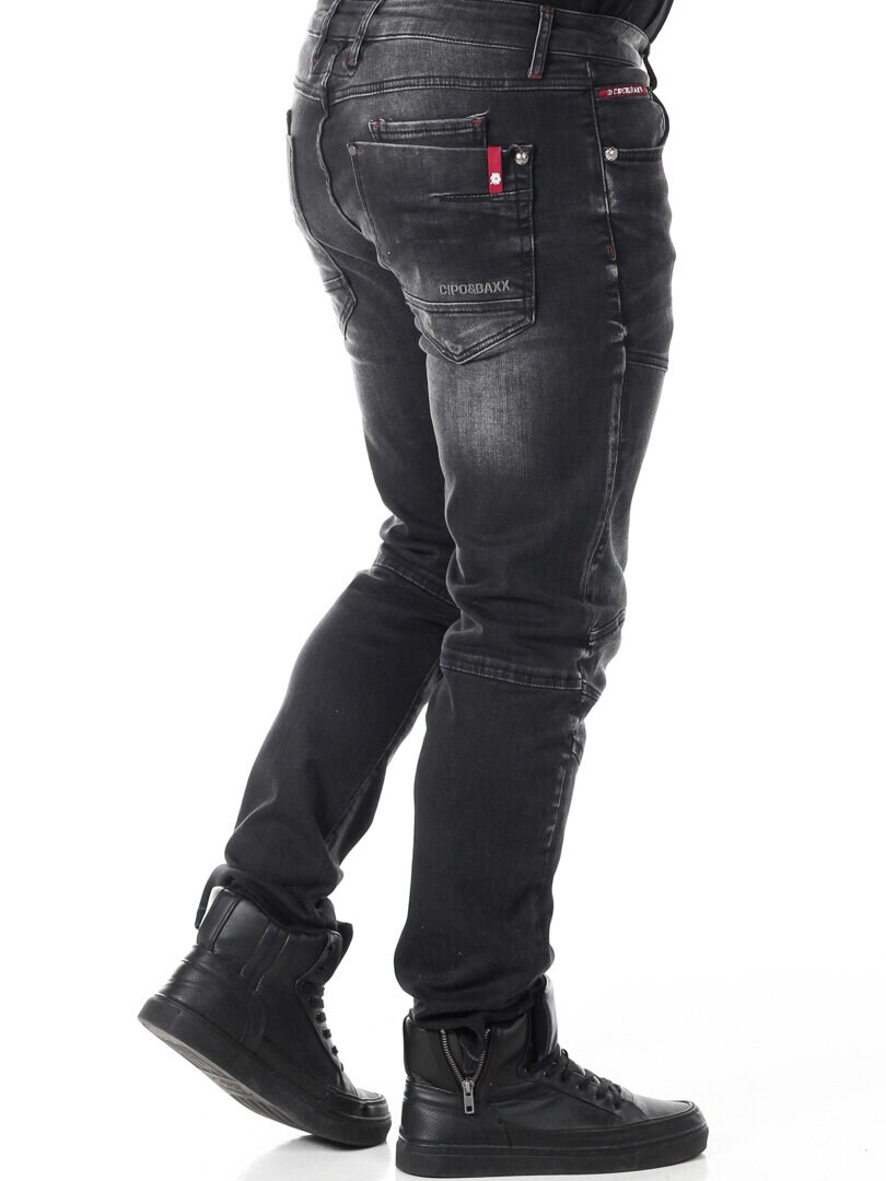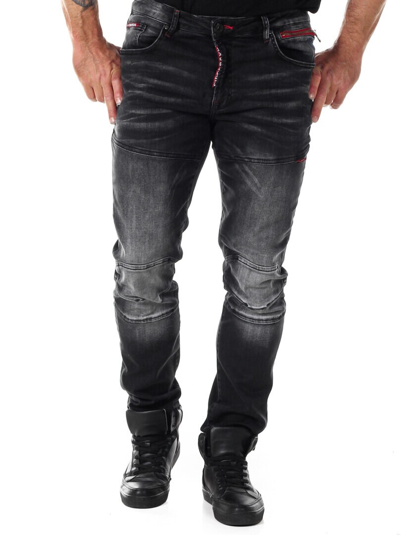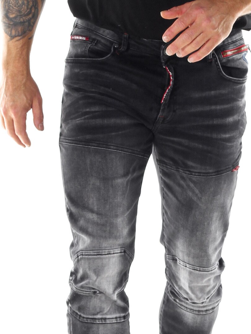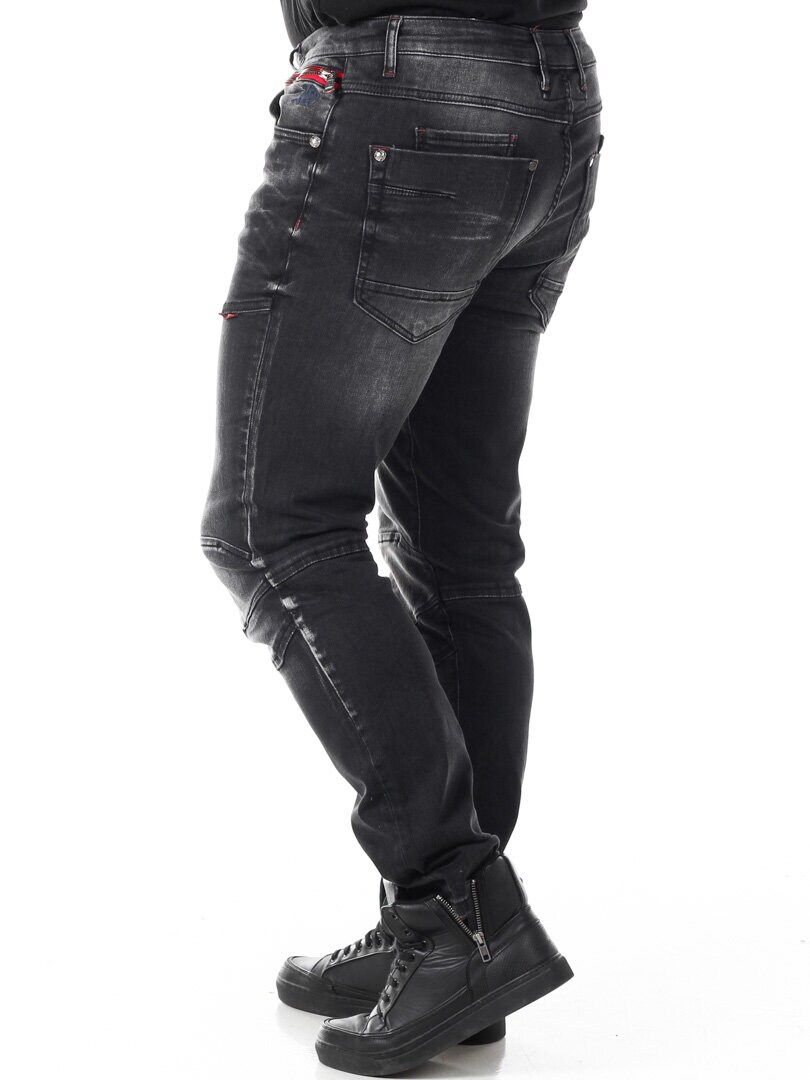 Spodnie z elastycznego denimu z dodatkowymi szwami z przodu na udach i kolanach. Cztery tylne kieszenie i cztery przednie kieszenie, w tym jedna zapinana na zamek. Czerwone detale, które dodają uroku!