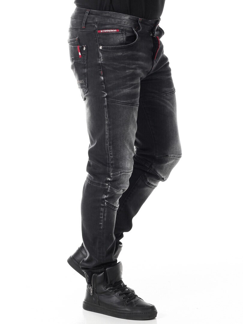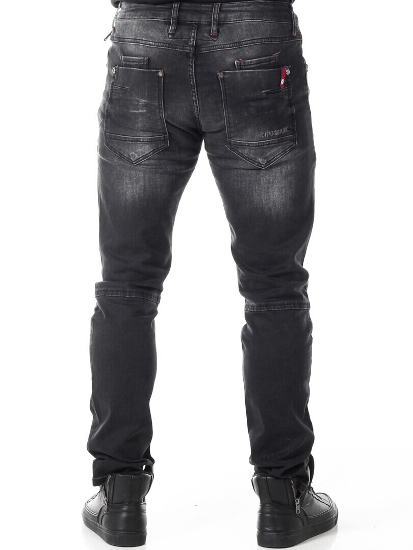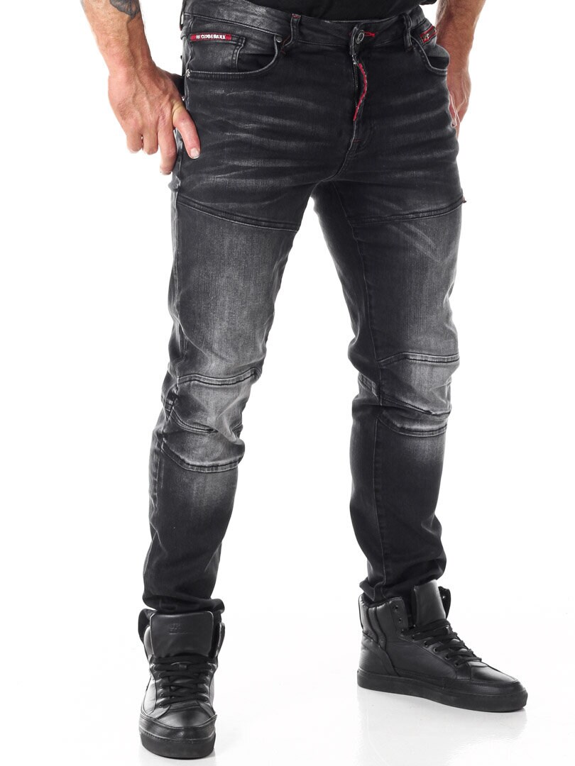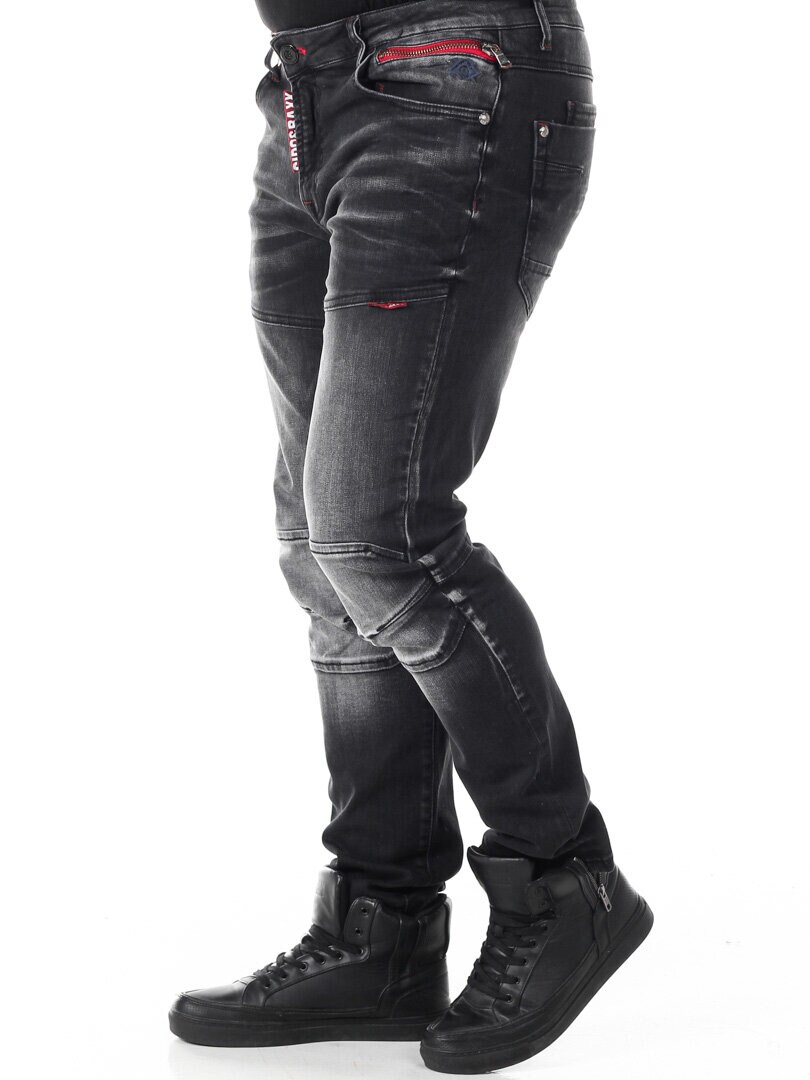 Spodnie z elastycznego denimu z dodatkowymi szwami z przodu na udach i kolanach. Cztery tylne kieszenie i cztery przednie kieszenie, w tym jedna zapinana na zamek. Czerwone detale, które dodają uroku!