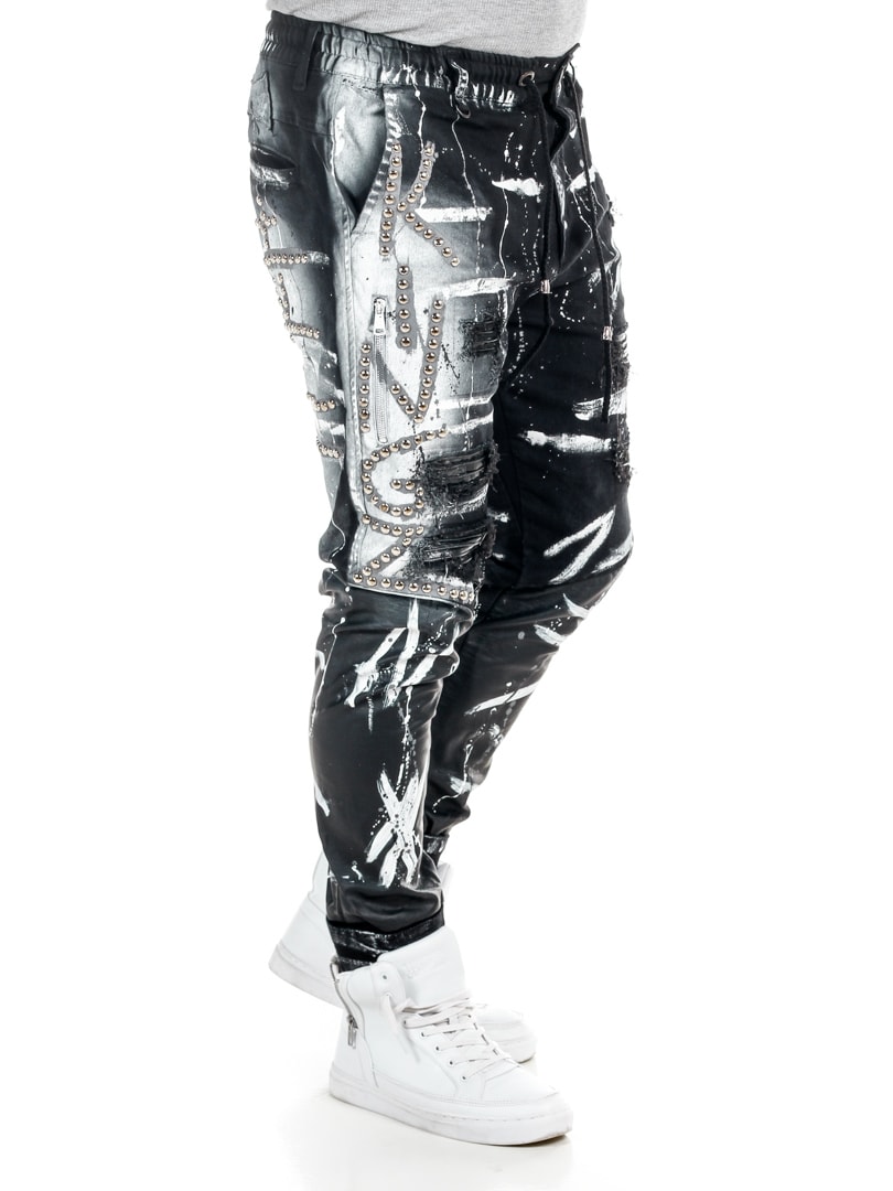 Wyjątkowo zaprojektowane spodnie z połączenia kolorowego denimu i czarnej imitacji skóry. Mają sznurek w pasie, wiele kieszeni, a końce nogawek można regulować za pomocą pasków na rzepy. Są ozdobione nitami, rozdarciami i malowanymi efektami.