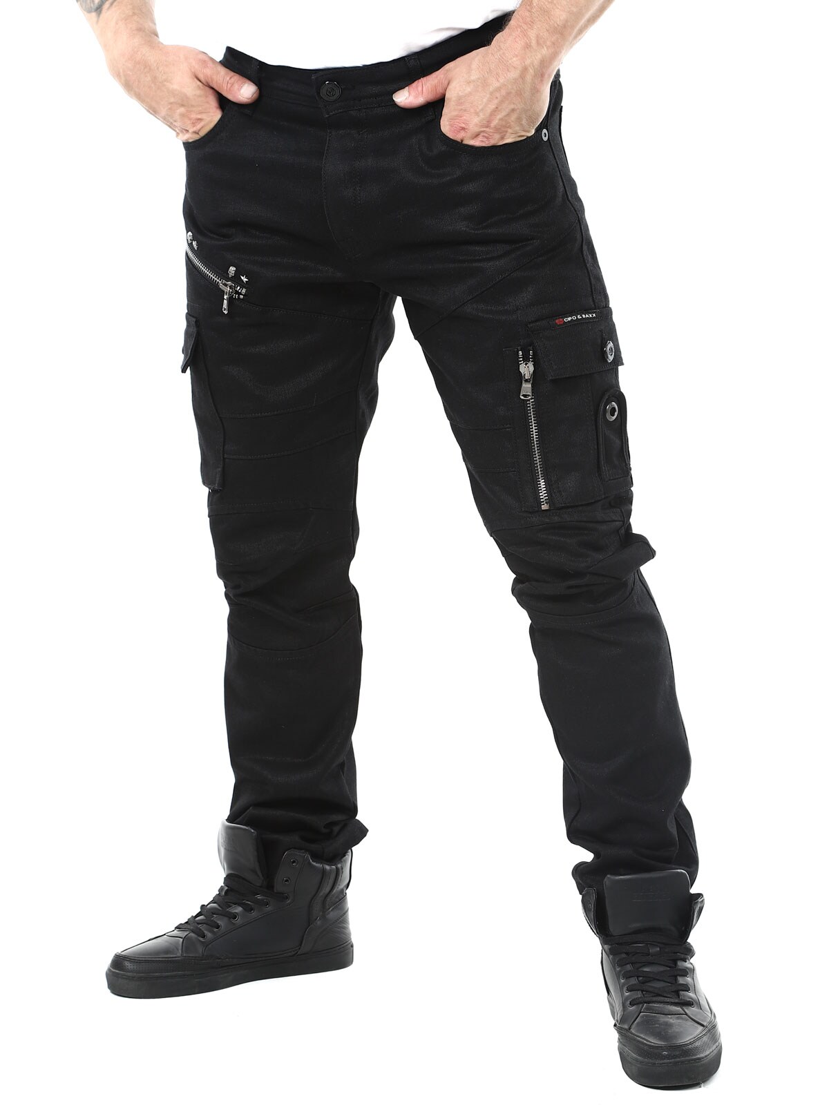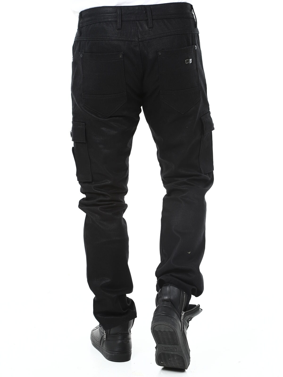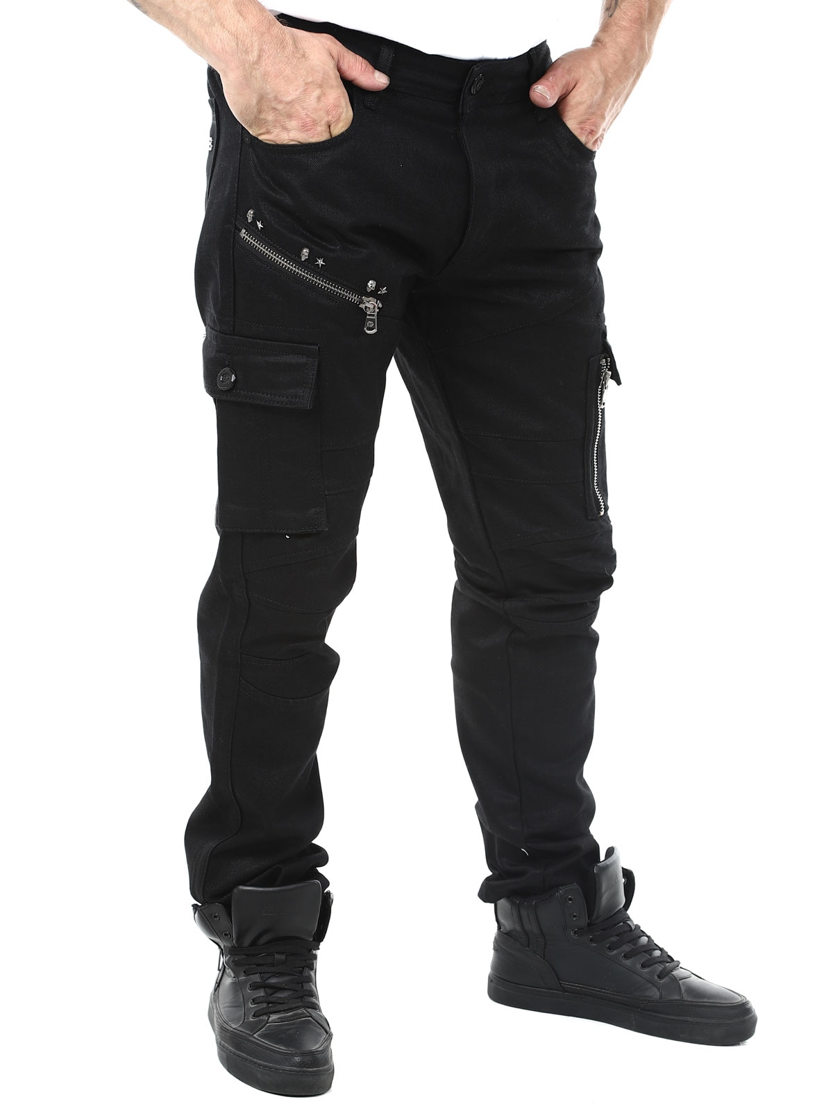 Spodnie z czarnego jeansu z ćwiekami i grubymi zamkami. Model posiada regularny krój w talii, wąskie nogawki oraz dużą ilość kieszeni. Wytrzymałe dżinsy i męski design!
