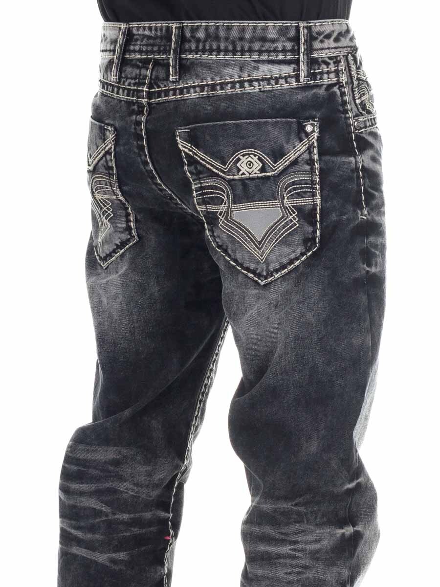 Ciemne jeansy wykonane z wytrzymałego denimu. Mają klasyczny krój, pięć kieszeni i szlufki w talii. Zaprojektowane z przeszyciami i dopasowanym nadrukiem w kontrastowym kolorze.