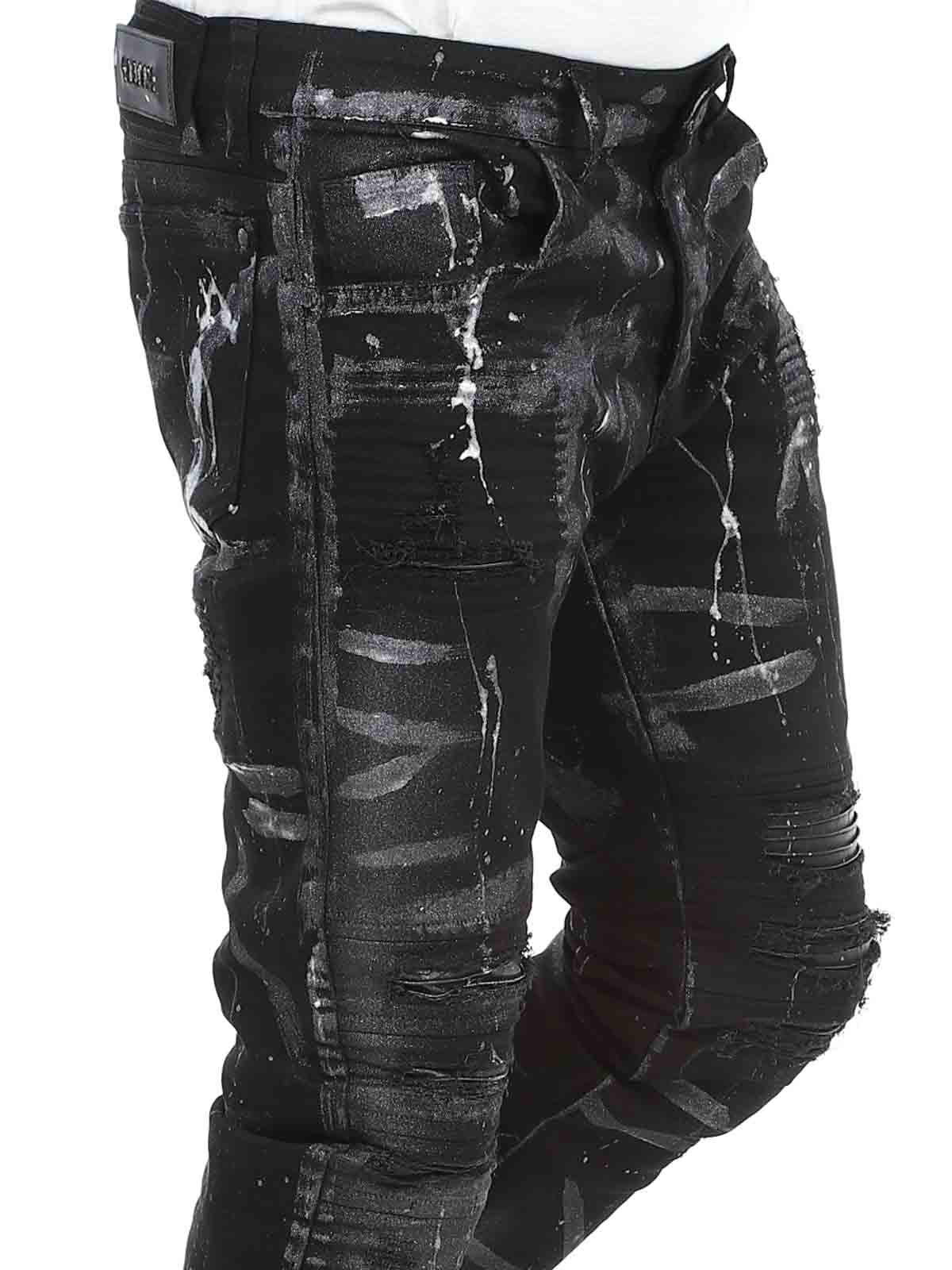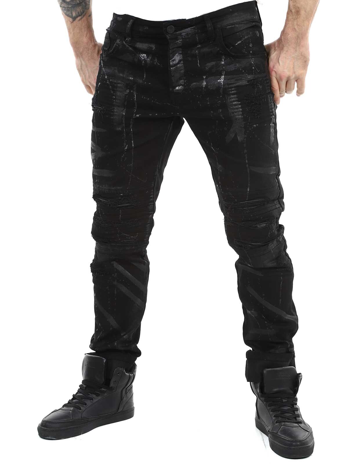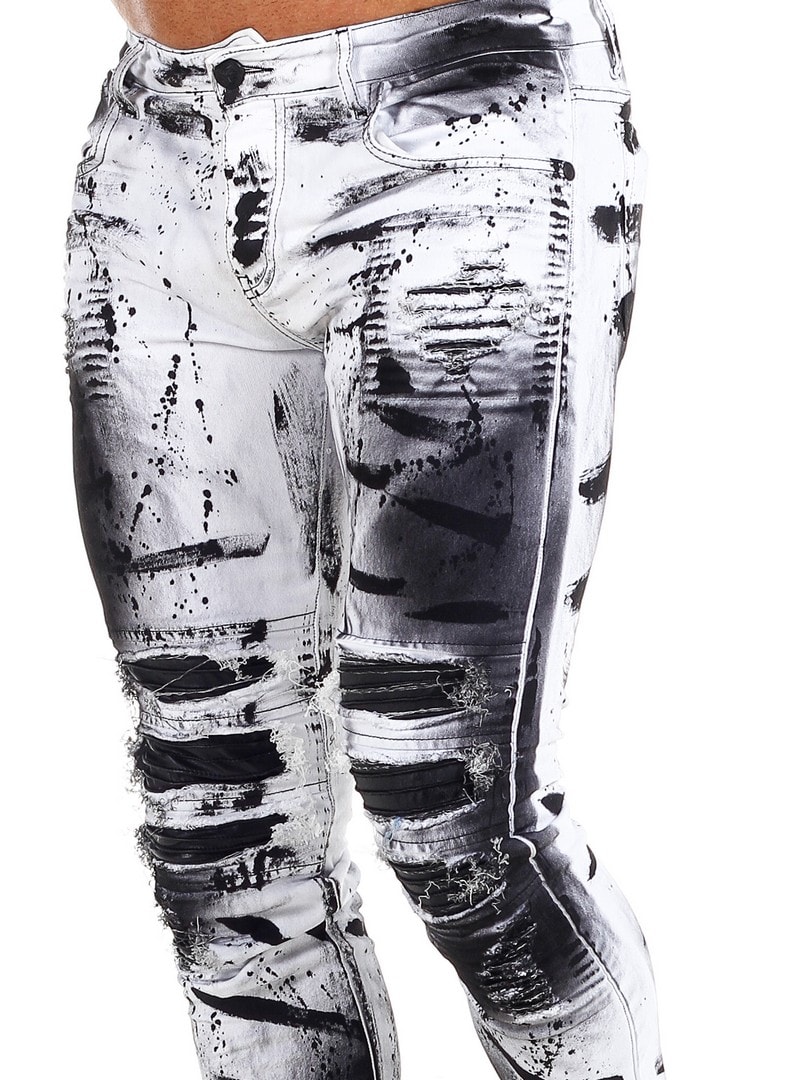 Spodnie o dopasowanym kroju z czarnymi, malowanymi efektami oraz elementami ze skóry ekologicznej w przetartym, vintage’owym stylu z rozdarciami. Pojemne kieszenie oraz naszywka w pasie z tyłu.