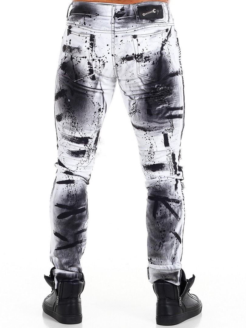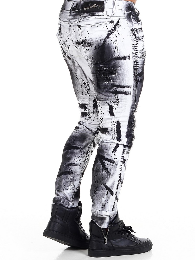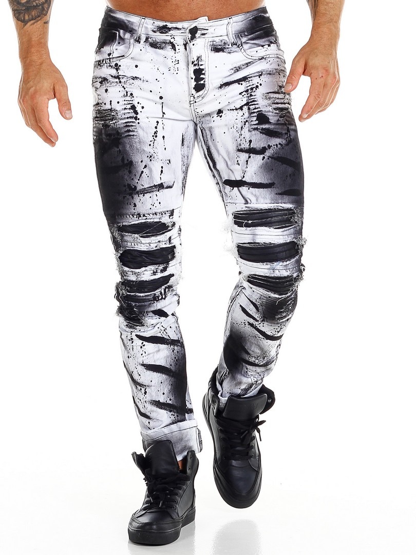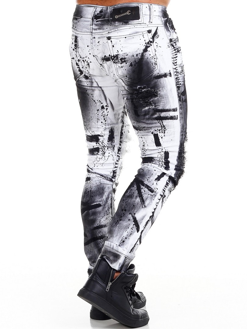 Spodnie o dopasowanym kroju z czarnymi, malowanymi efektami oraz elementami ze skóry ekologicznej w przetartym, vintage’owym stylu z rozdarciami. Pojemne kieszenie oraz naszywka w pasie z tyłu.
