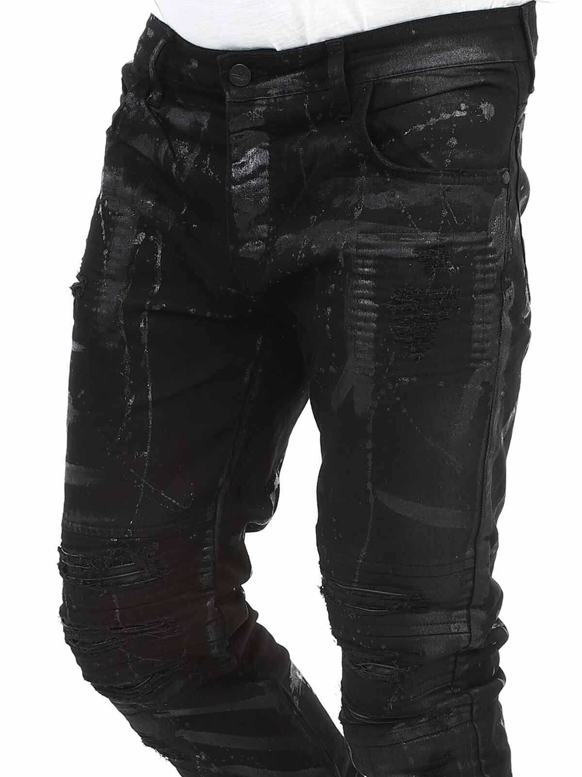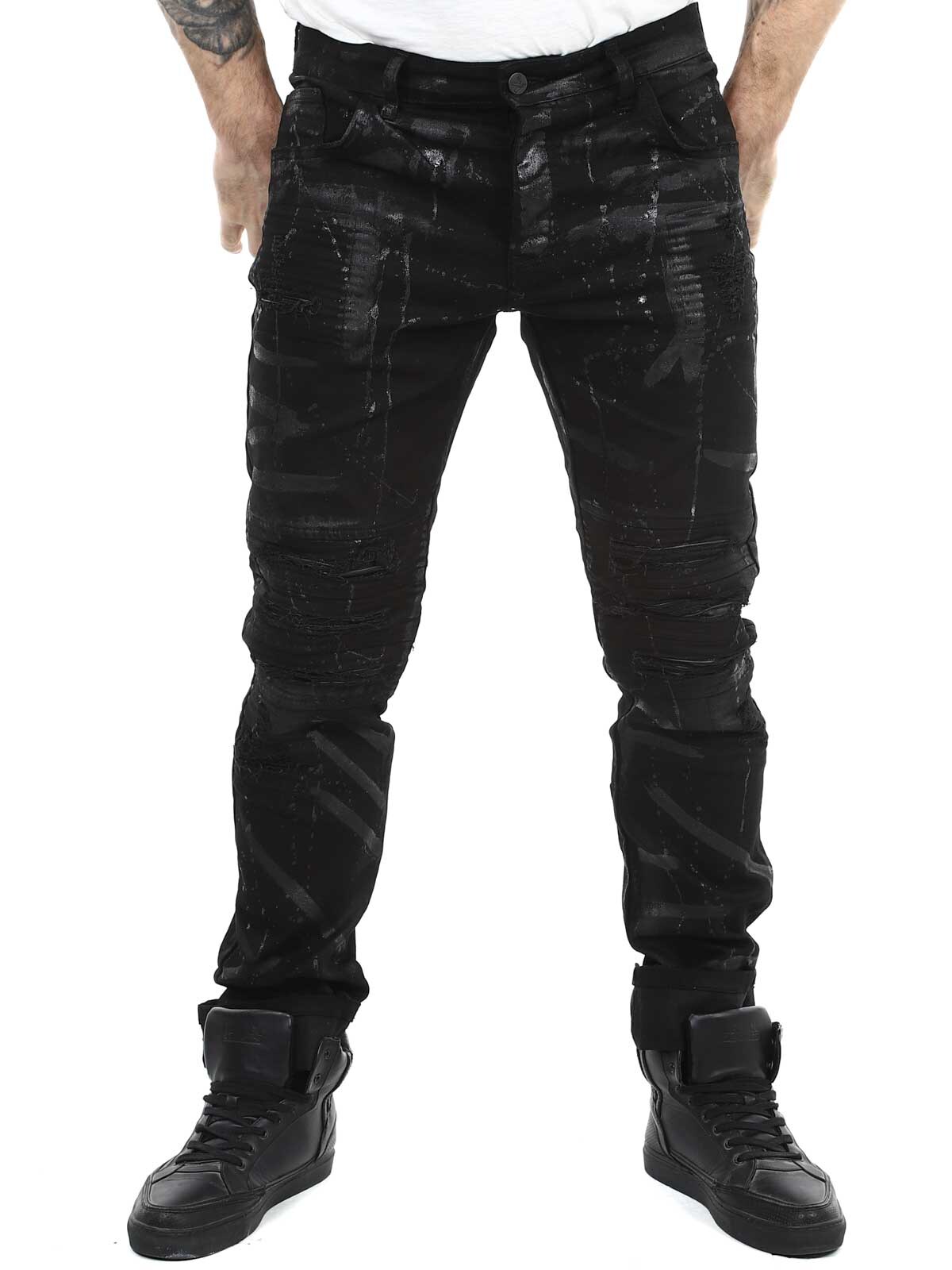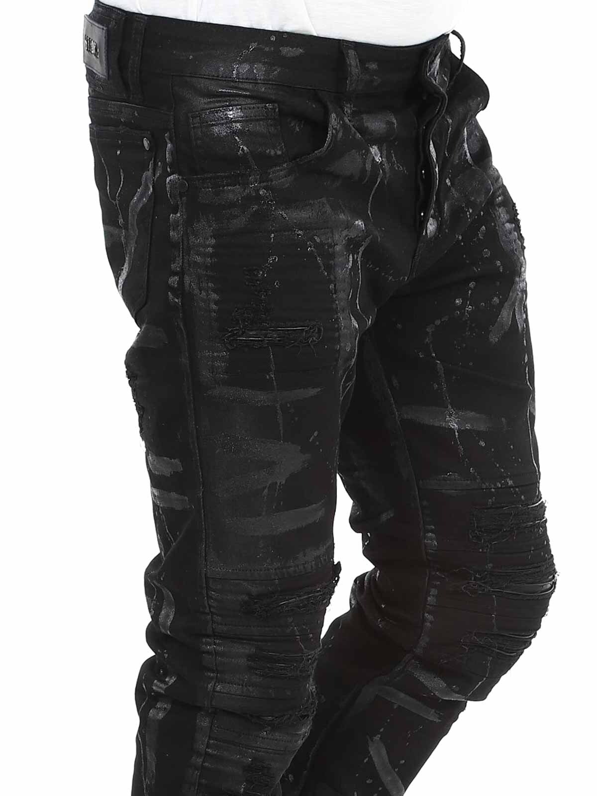 Jeansy z wygodnego i rozciągliwego denimu. Fajny design z rozdarciami ze sztucznej skóry i malowanymi efektami. Model z pięcioma kieszeniami, szlufkami na pasek i naszywką w pasie z tyłu. Jeansy stworzone, aby nadać Twojemu strojowi odważny i niepowtarzalny charakter!