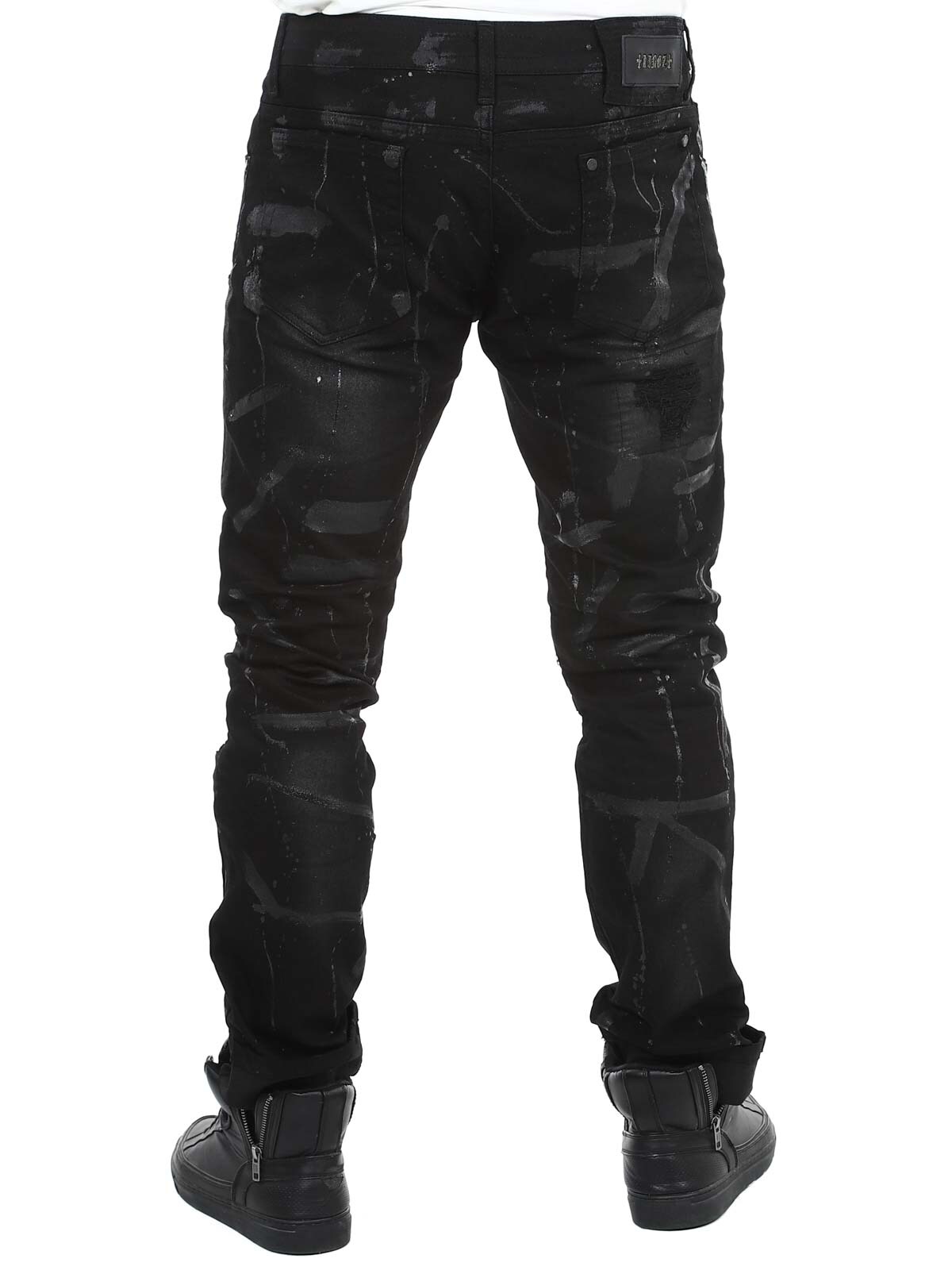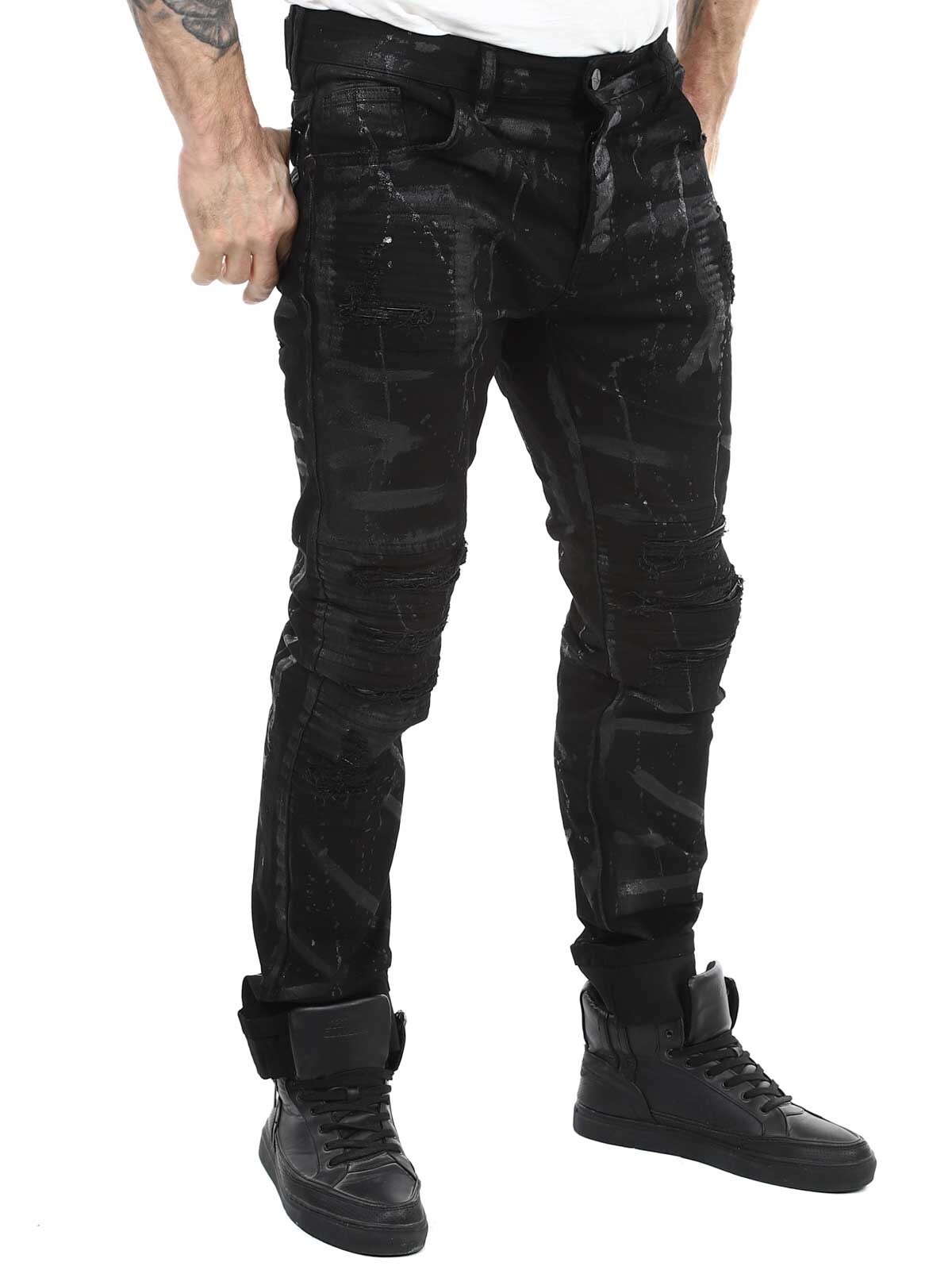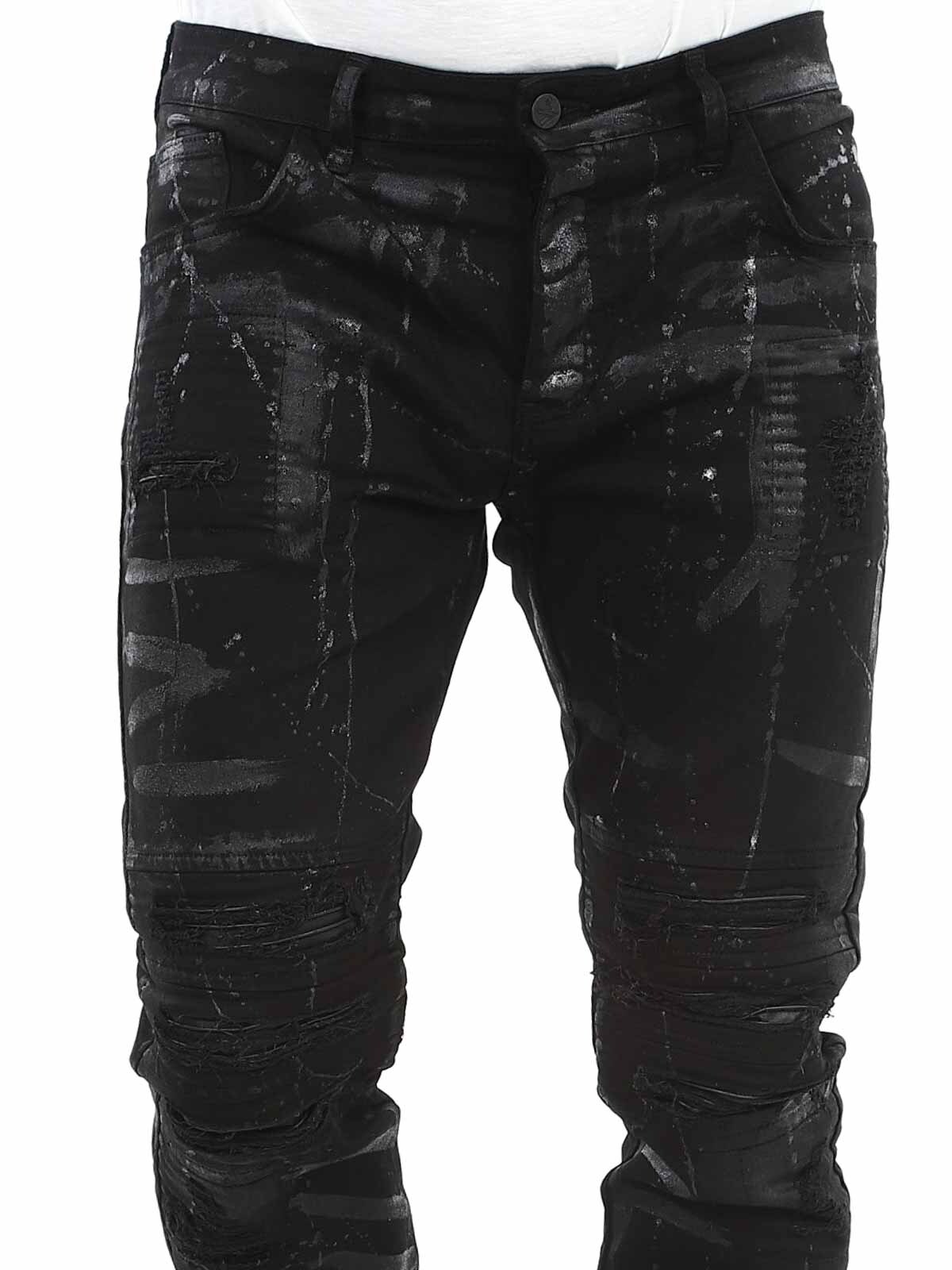 Jeansy z wygodnego i rozciągliwego denimu. Fajny design z rozdarciami ze sztucznej skóry i malowanymi efektami. Model z pięcioma kieszeniami, szlufkami na pasek i naszywką w pasie z tyłu. Jeansy stworzone, aby nadać Twojemu strojowi odważny i niepowtarzalny charakter!