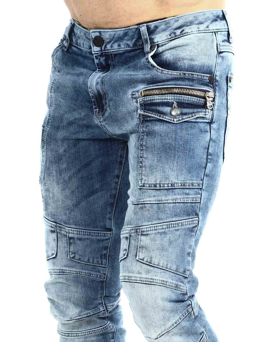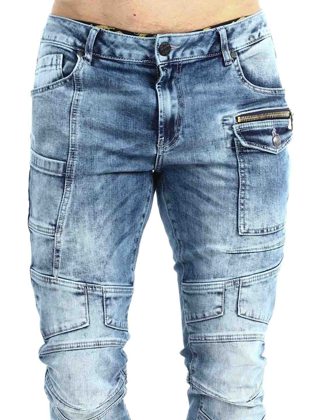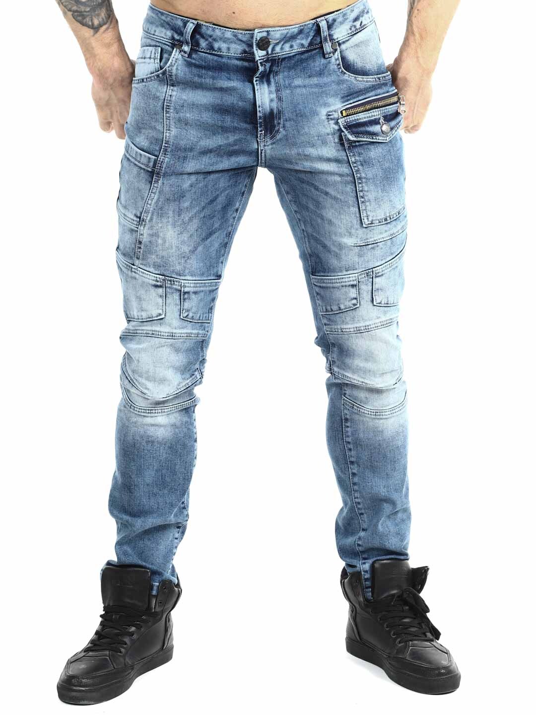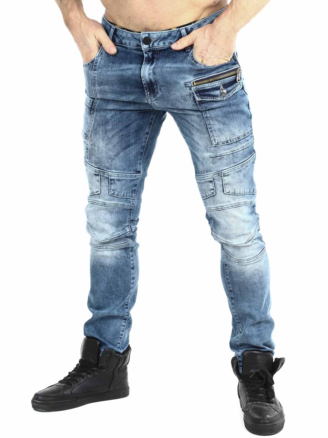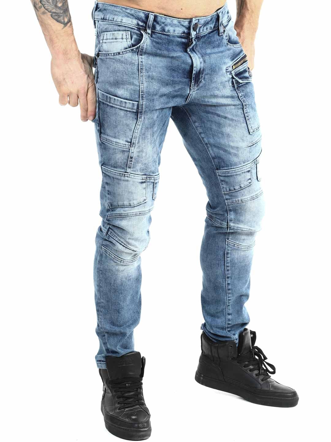 Te jeansy łączą nowoczesny styl streetwear z sportowym i funkcjonalnym designem. Sprany niebieski denim nadaje im żywy i autentyczny wygląd, a wyraźne szwy oraz panelowe detale na nogawkach tworzą dynamiczny i modny charakter. Ozdobny zamek błyskawiczny przy kieszeni podkreśla miejski styl i dodaje spodniom wyjątkowego akcentu. Idealne dla osób, które chcą mieć jeansy pasujące zarówno na co dzień, jak i do bardziej stylowej streetowej stylizacji.