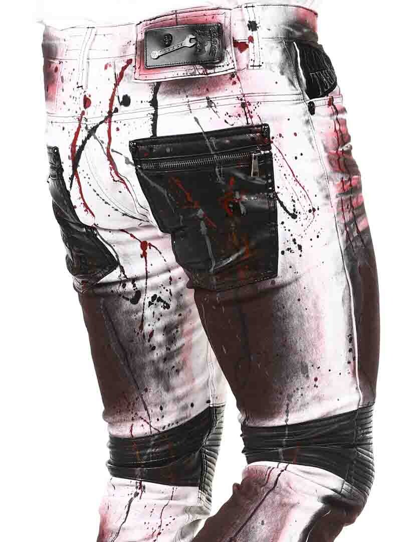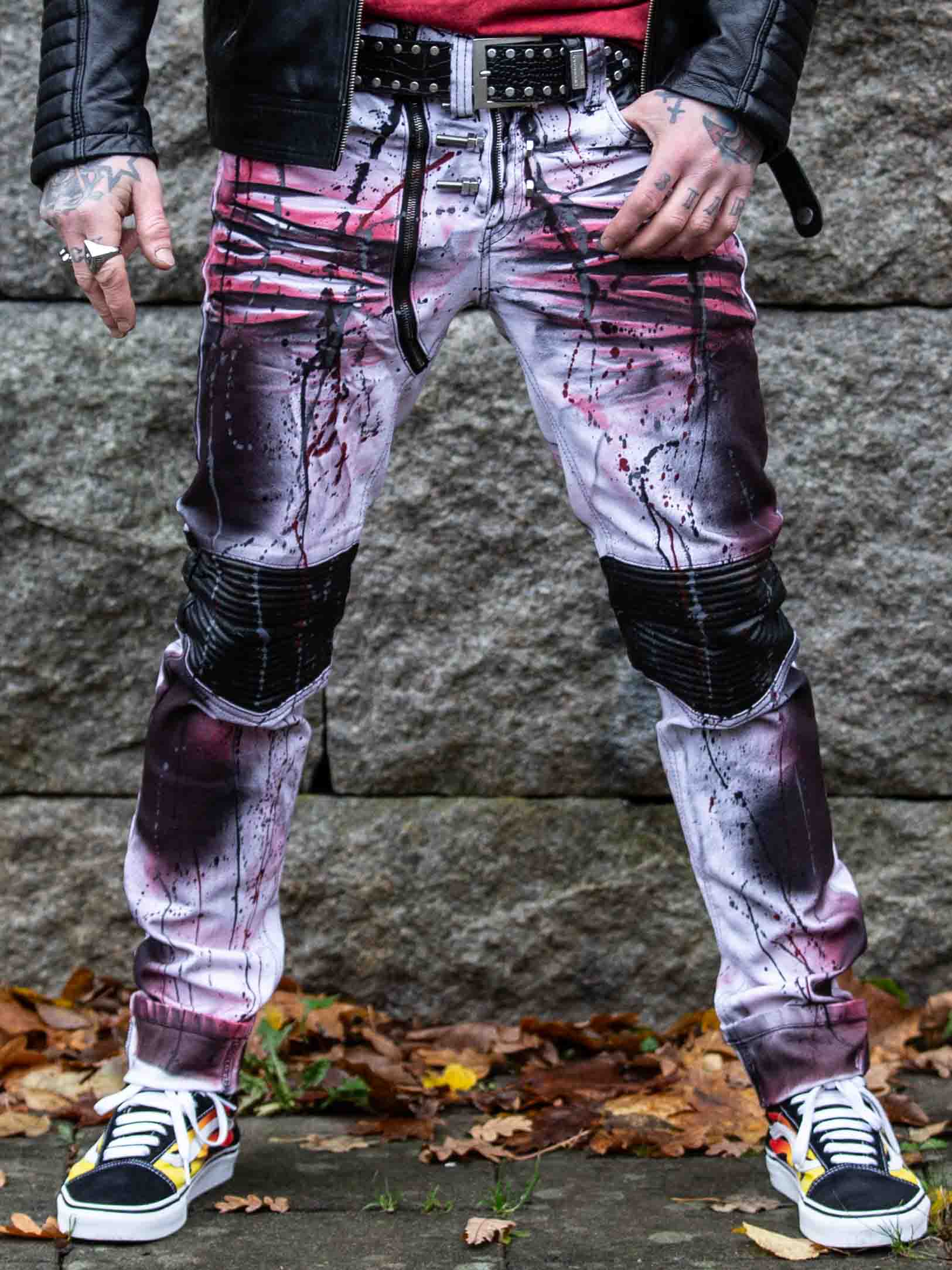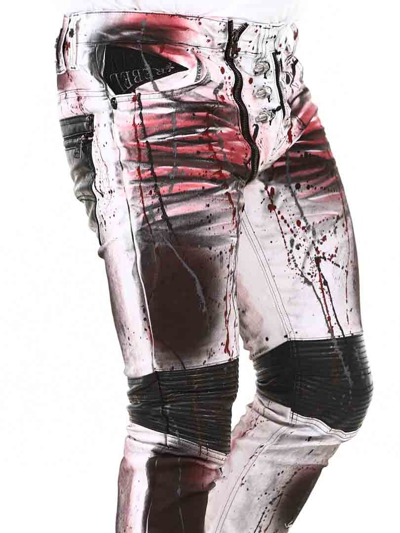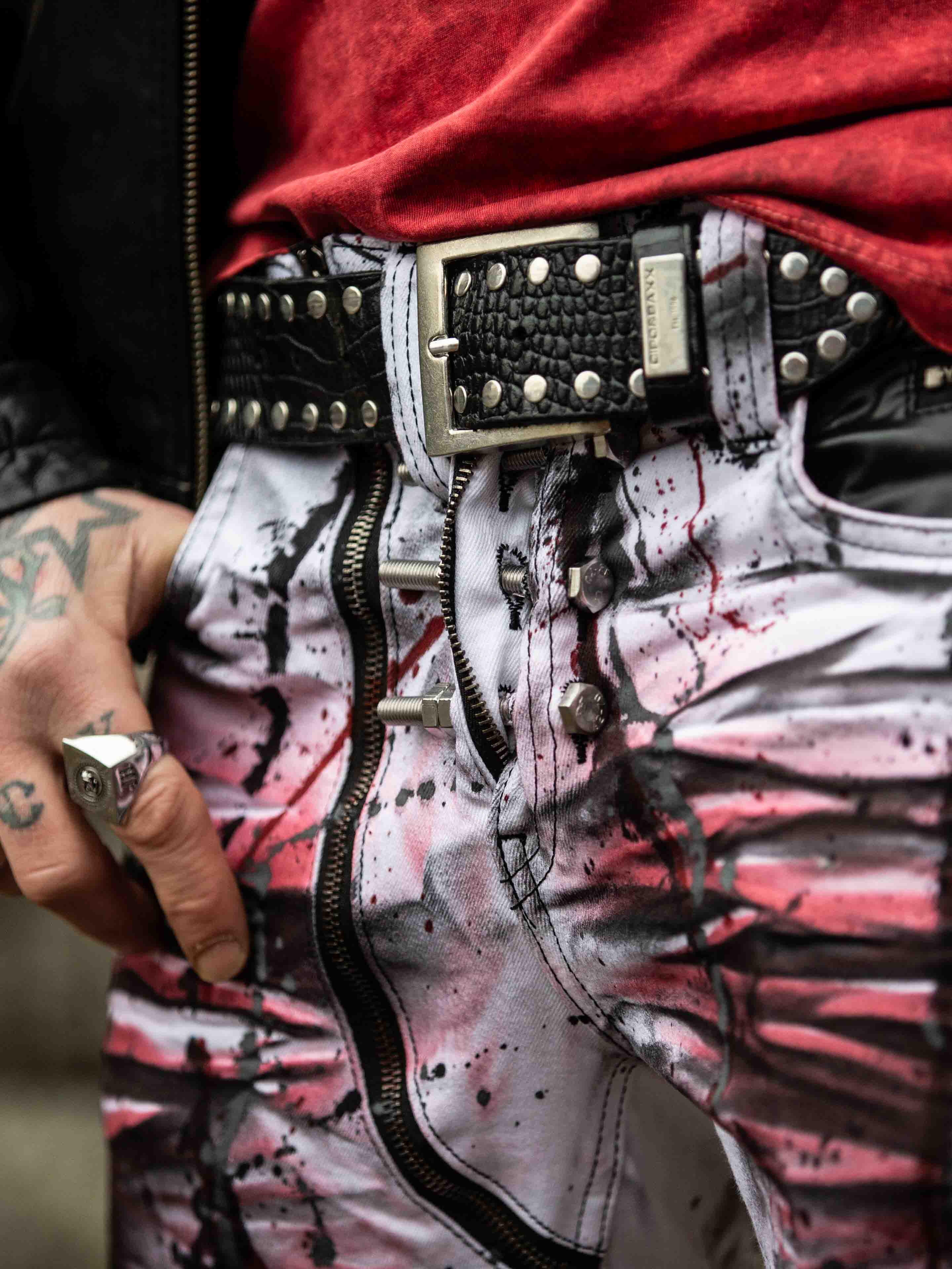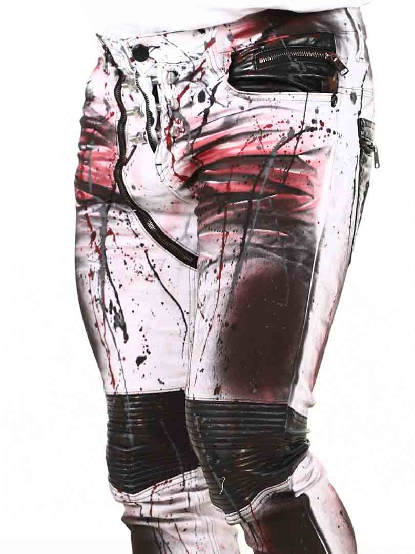 Wyjątkowe spodnie z kolorowego denimu, ze wstawkami z czarnej imitacji skóry na kolanach i kieszeniach. Dopasowany krój z ozdobnymi śrubami przy rozporku i tylnymi kieszeniami zapinanymi na metalowe zamki. Jeansy posiadają osobny zamek błyskawiczny, znajdujący się po prawej stronie rozporka.