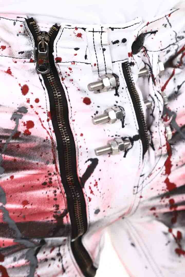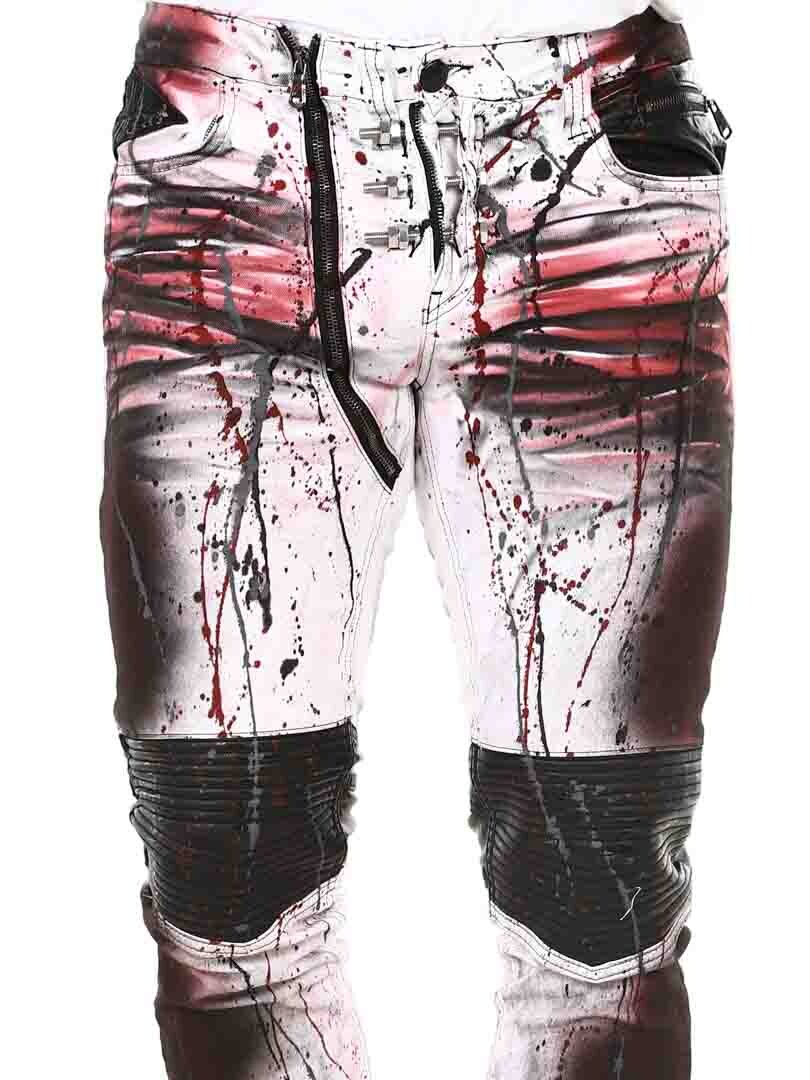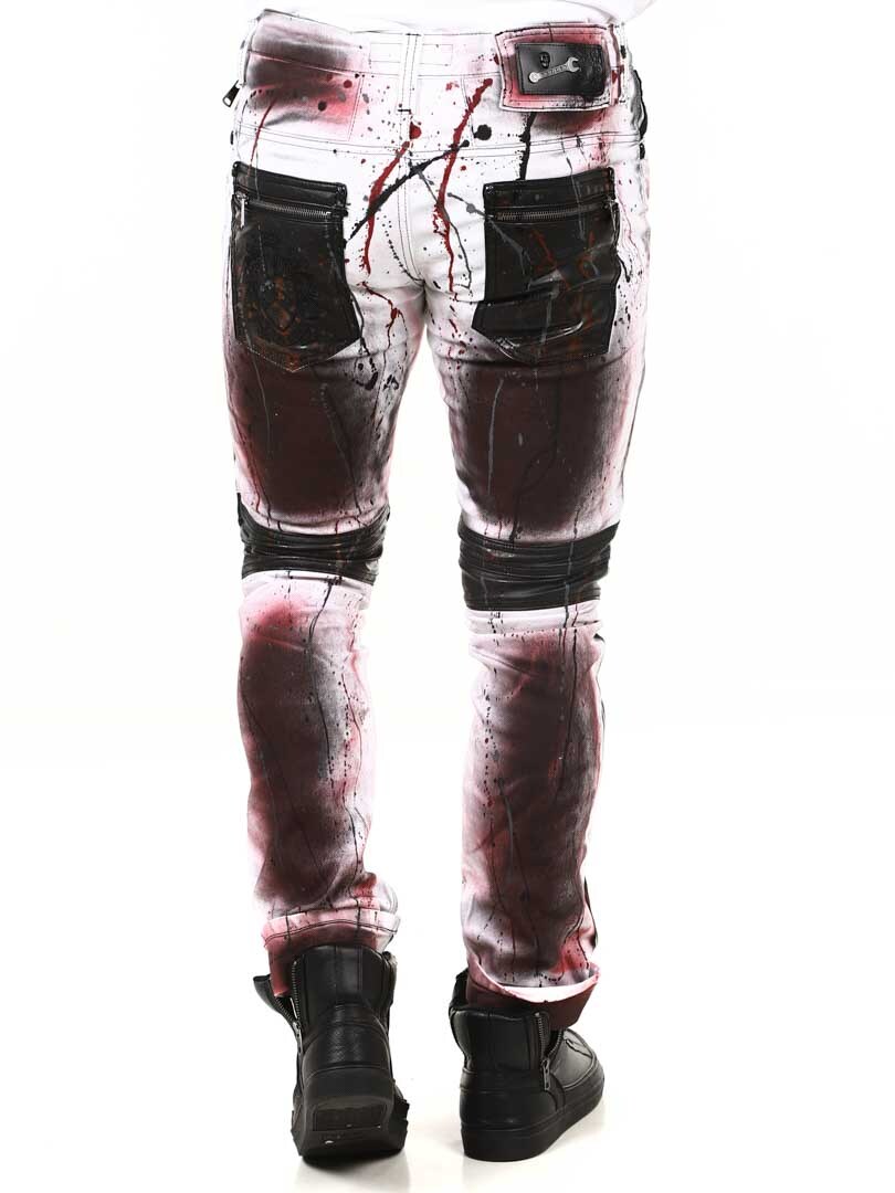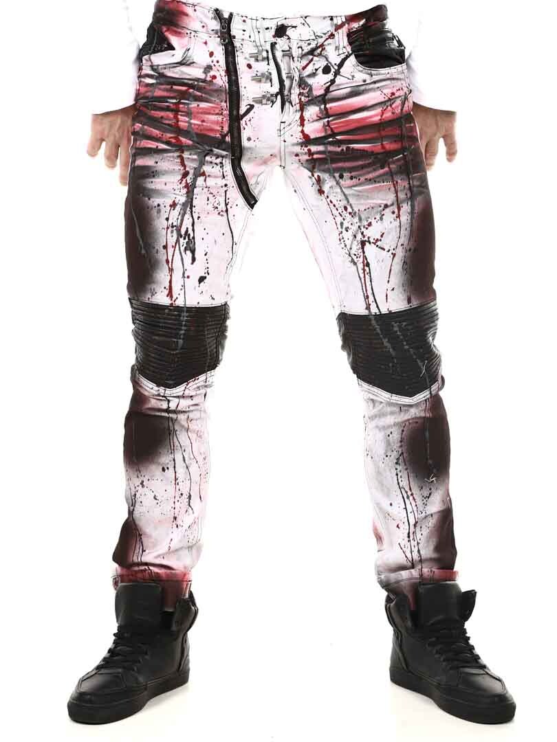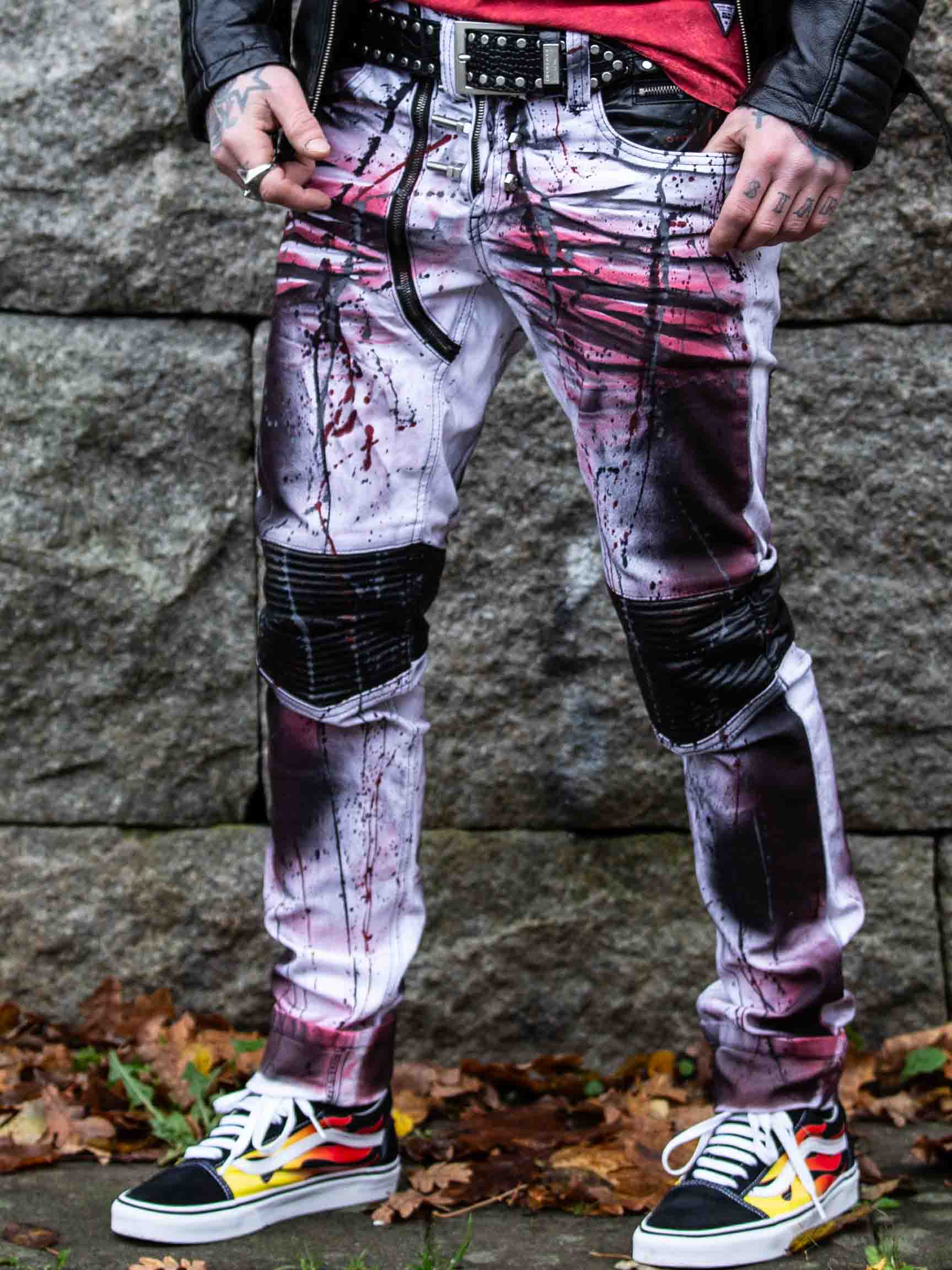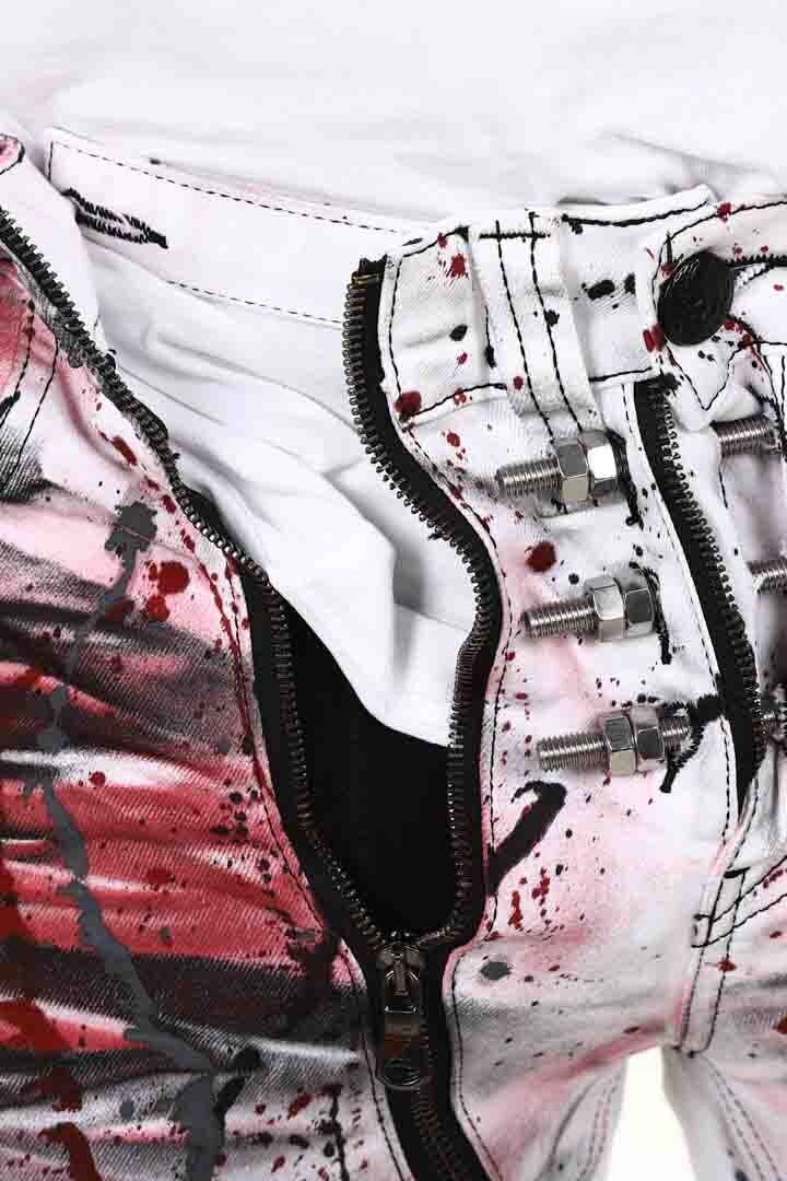 Wyjątkowe spodnie z kolorowego denimu, ze wstawkami z czarnej imitacji skóry na kolanach i kieszeniach. Dopasowany krój z ozdobnymi śrubami przy rozporku i tylnymi kieszeniami zapinanymi na metalowe zamki. Jeansy posiadają osobny zamek błyskawiczny, znajdujący się po prawej stronie rozporka.
