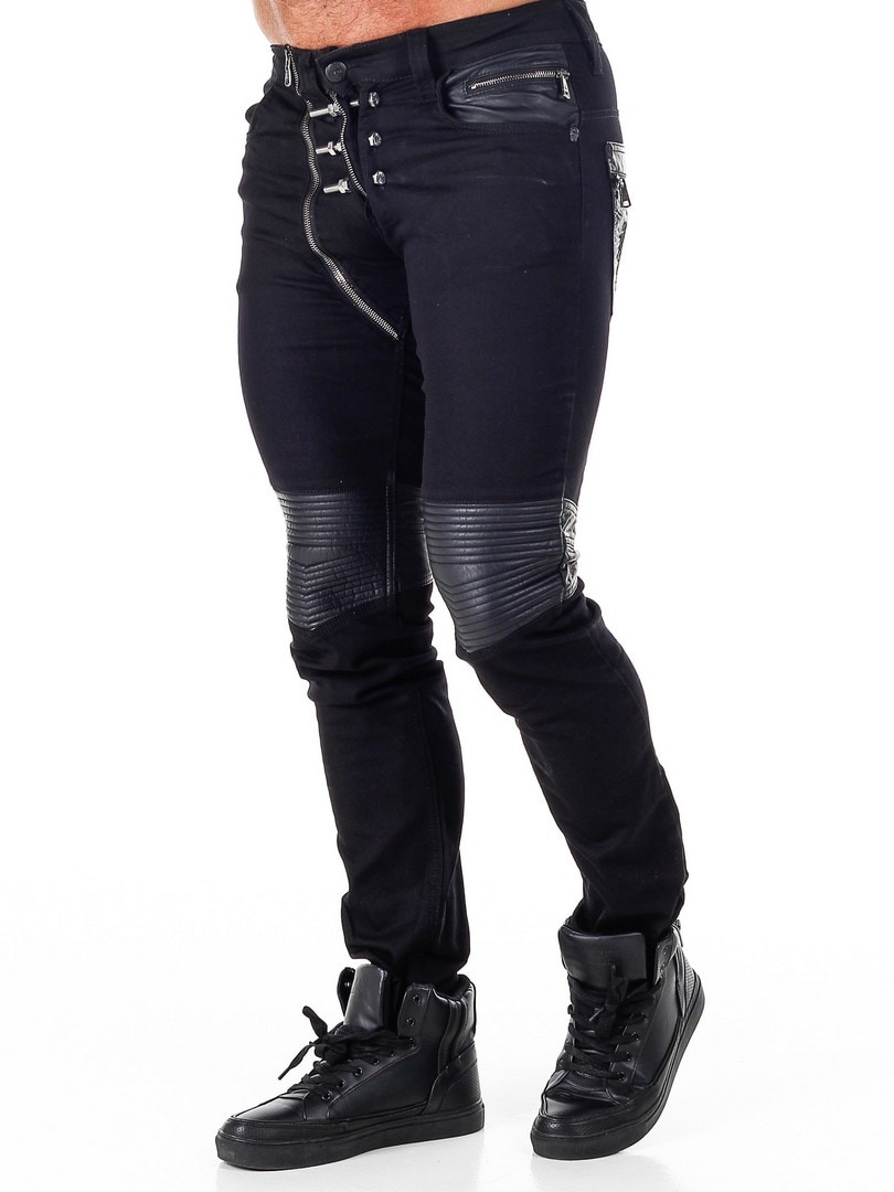 Wyjątkowe spodnie z kolorowego denimu, ze wstawkami z czarnej imitacji skóry na kolanach i kieszeniach. Dopasowany krój z ozdobnymi śrubami przy rozporku i tylnymi kieszeniami zapinanymi na metalowe zamki. Jeansy posiadają osobny zamek błyskawiczny, znajdujący się po prawej stronie rozporka.