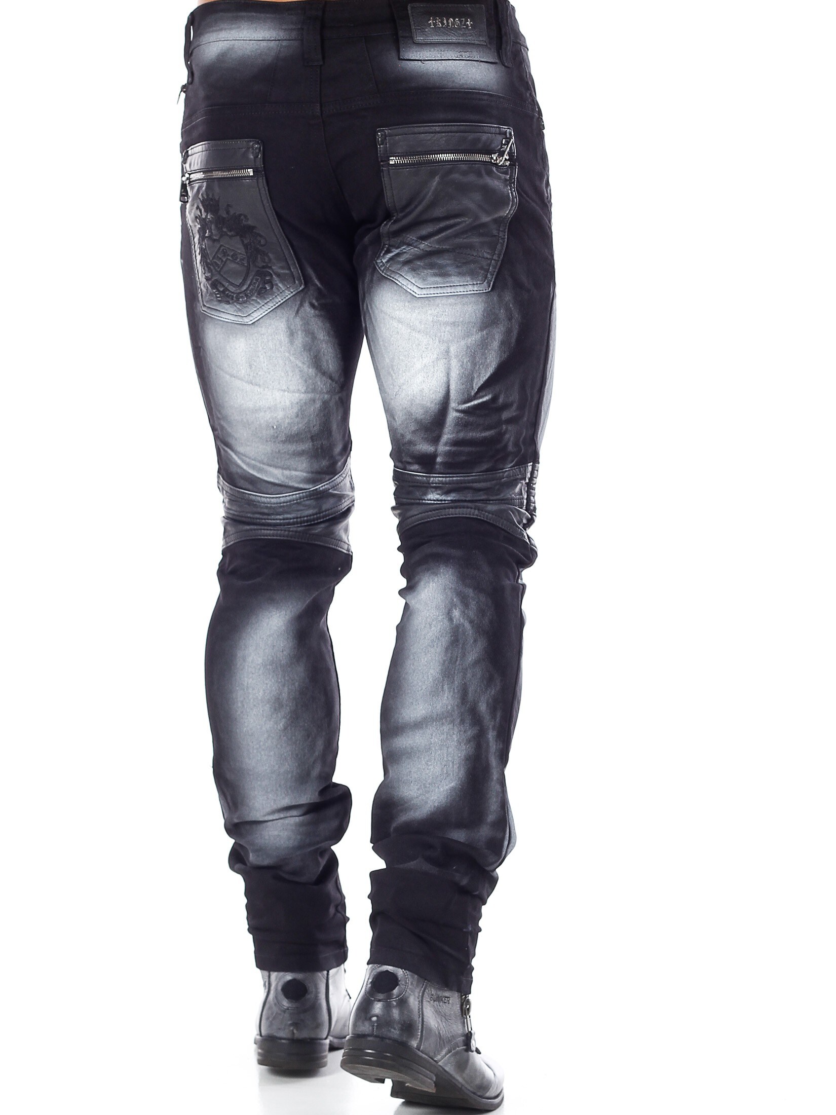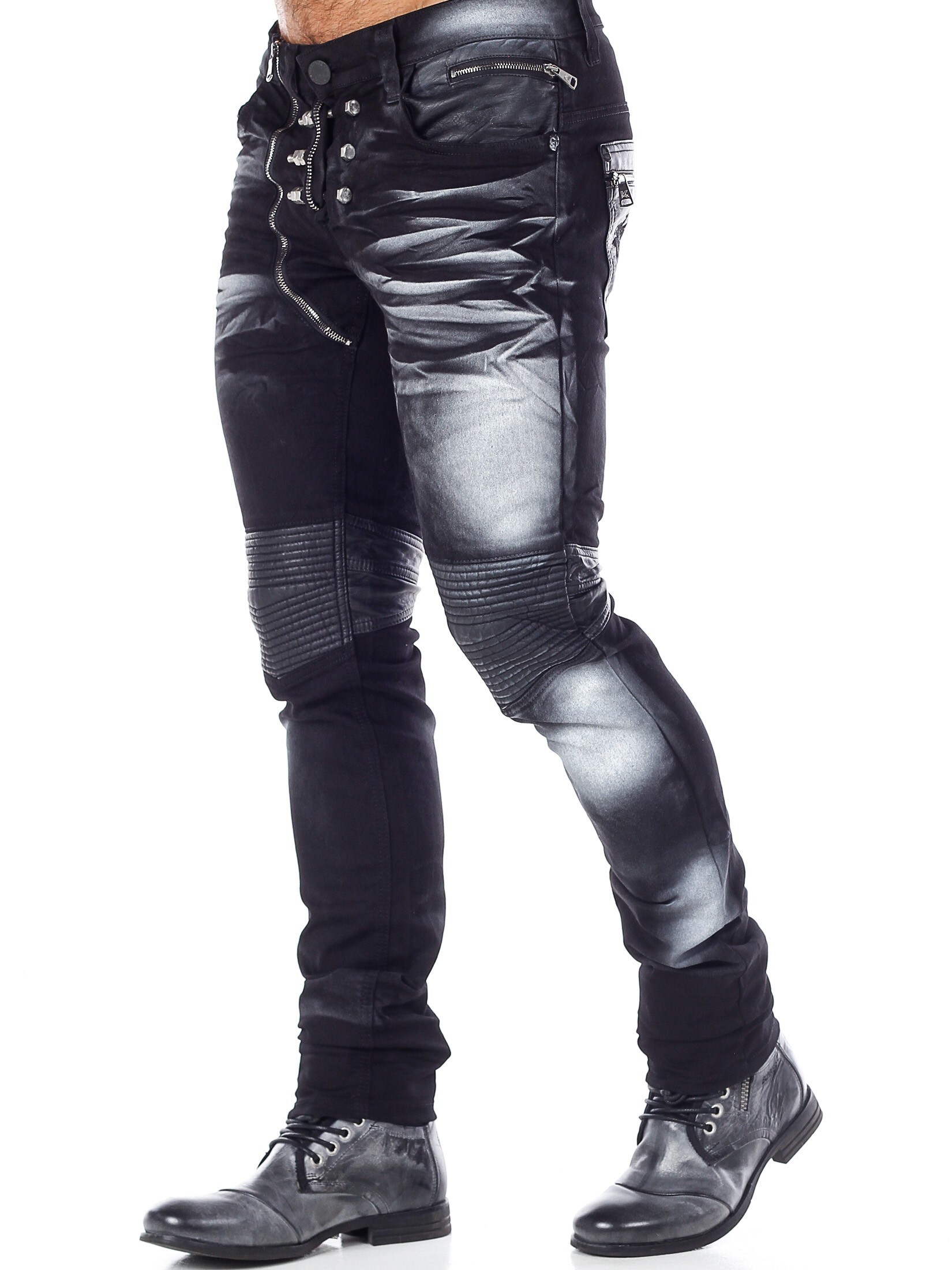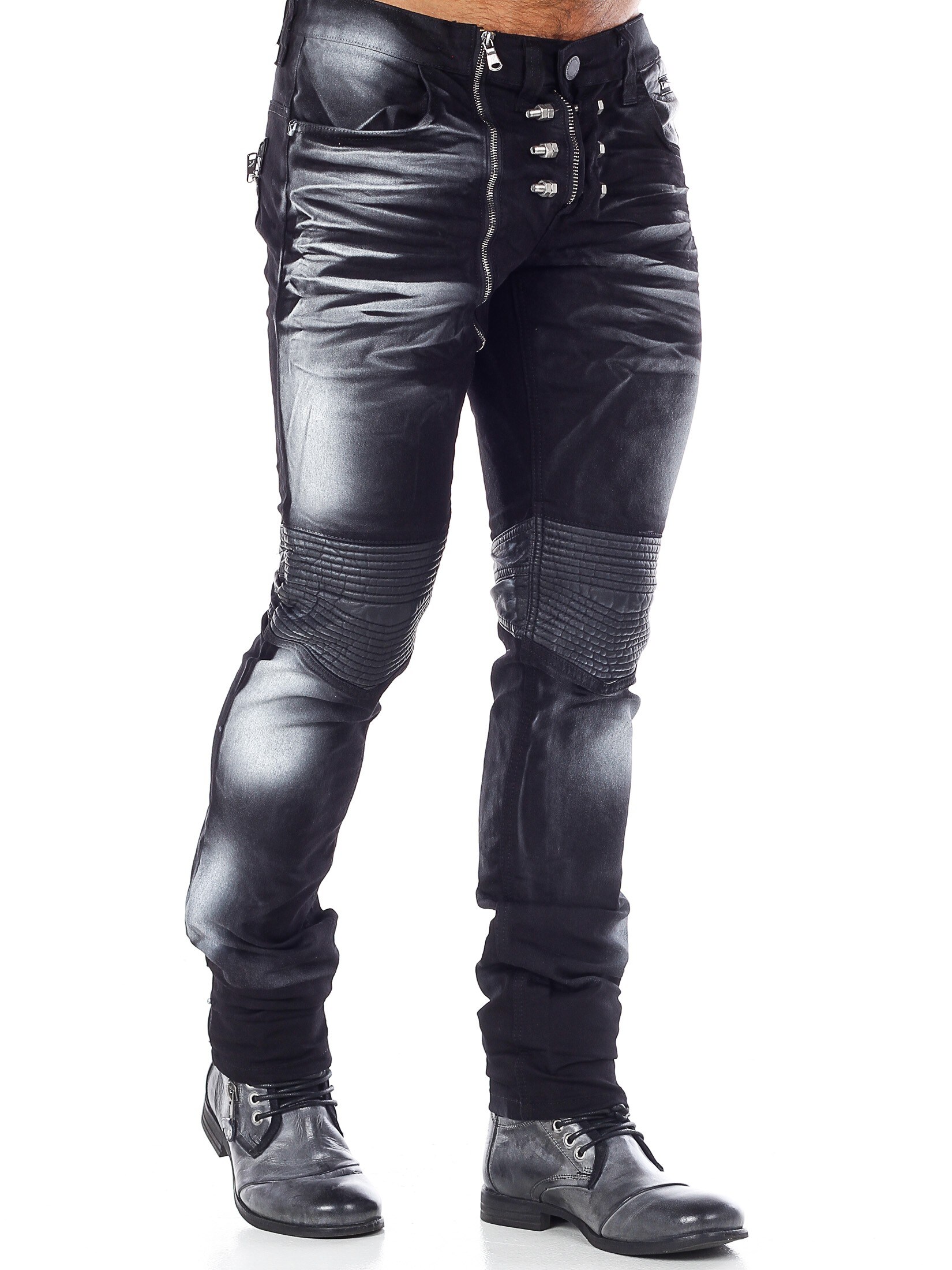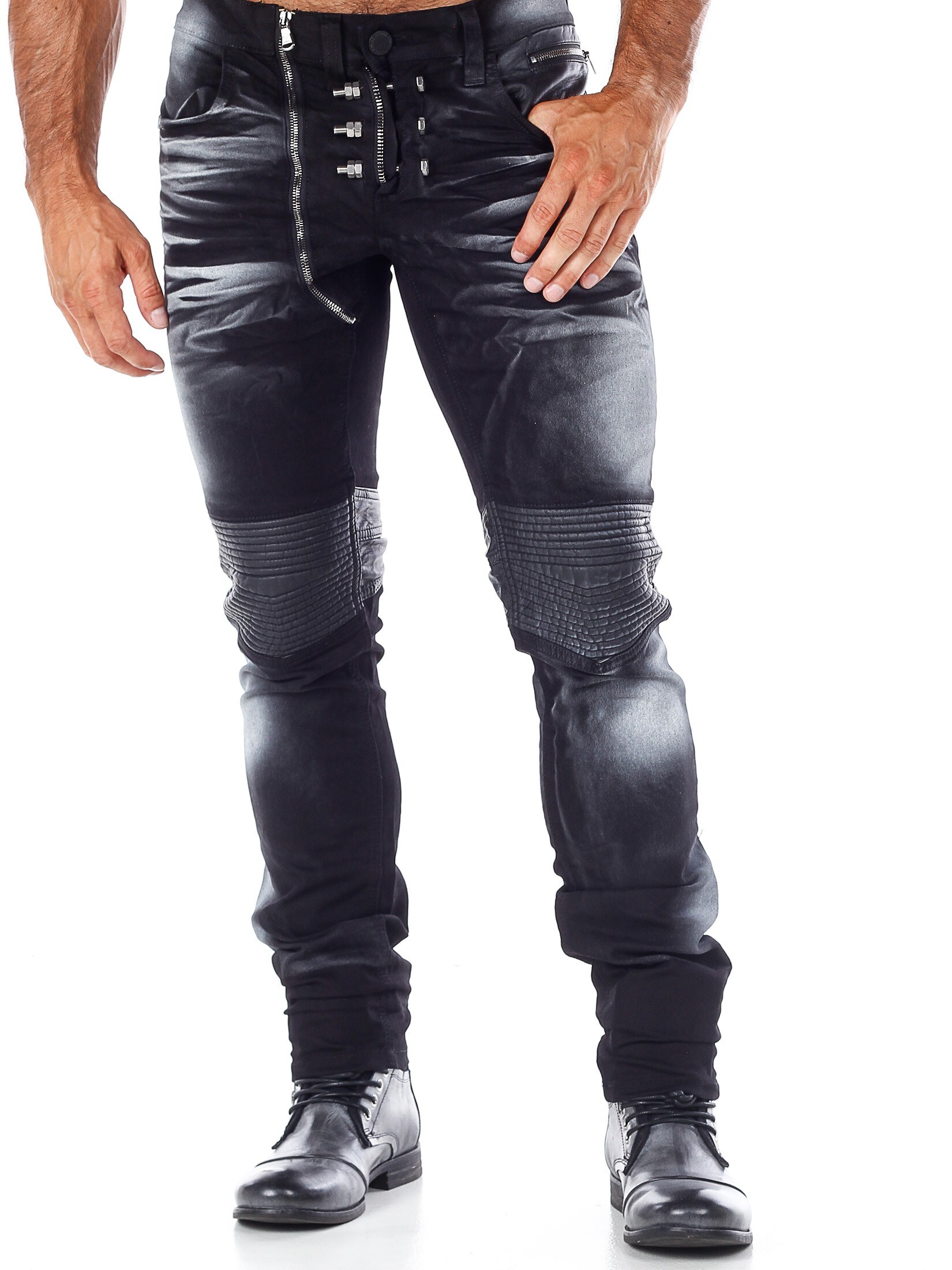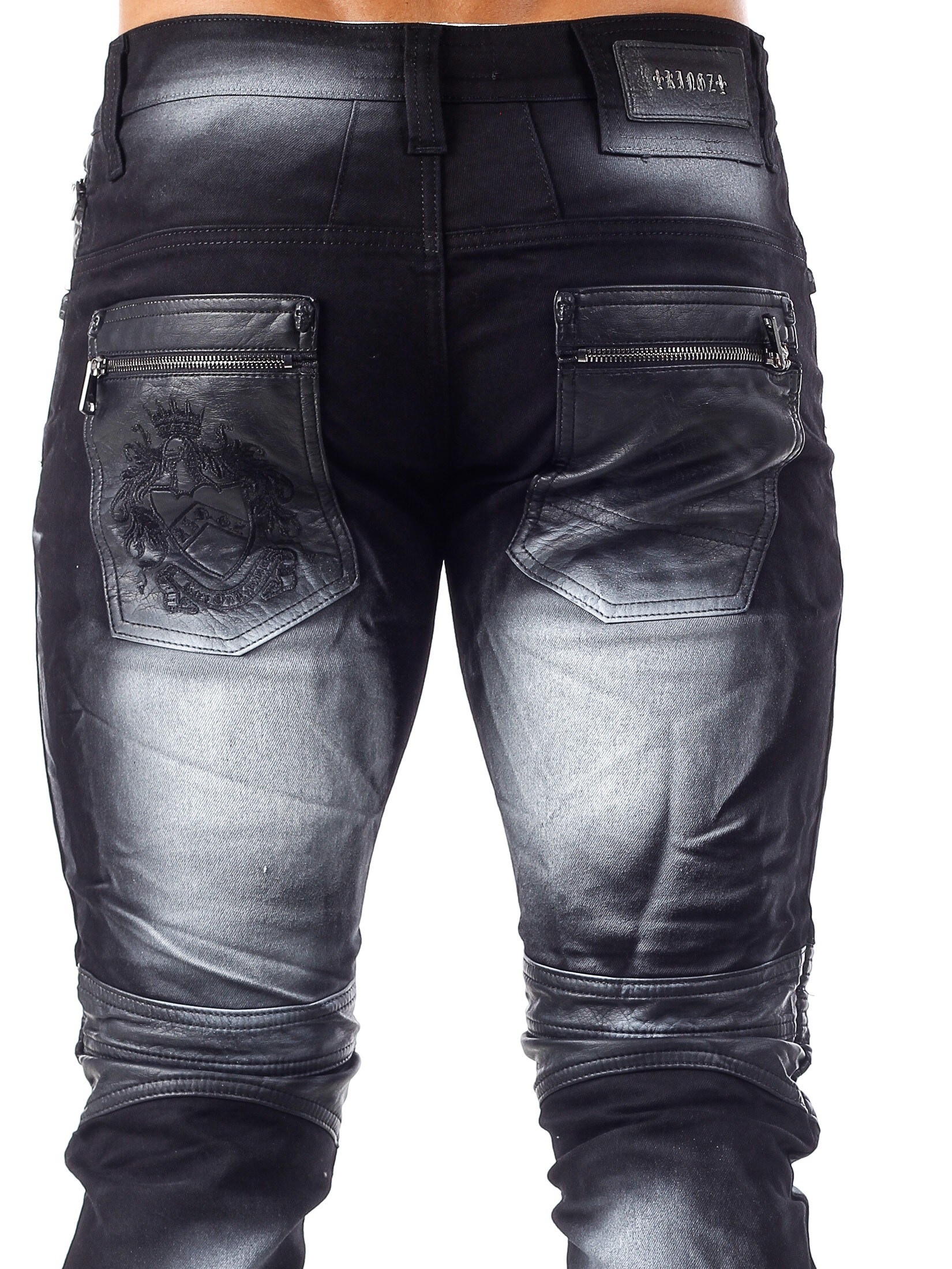 Unikalne spodnie z kolorowego denimu z kolanami i kieszeniami wykonanymi z czarnej skóry ekologicznej. Dopasowany krój z srebrnymi nitami podkreślającymi rozporek oraz tylne kieszenie zapinane na srebrne zamki błyskawiczne. Jeansy zapinane są na dodatkowy zamek błyskawiczny po prawej stronie od guzika w pasie.