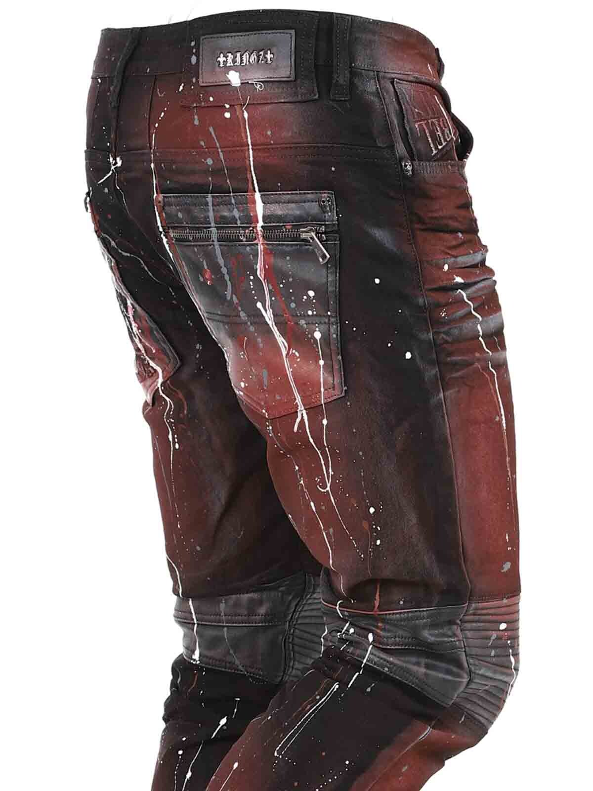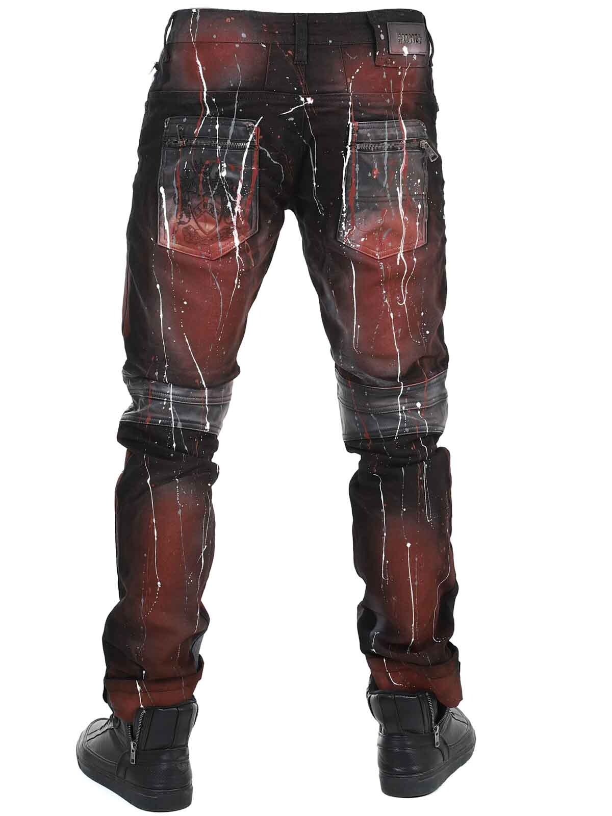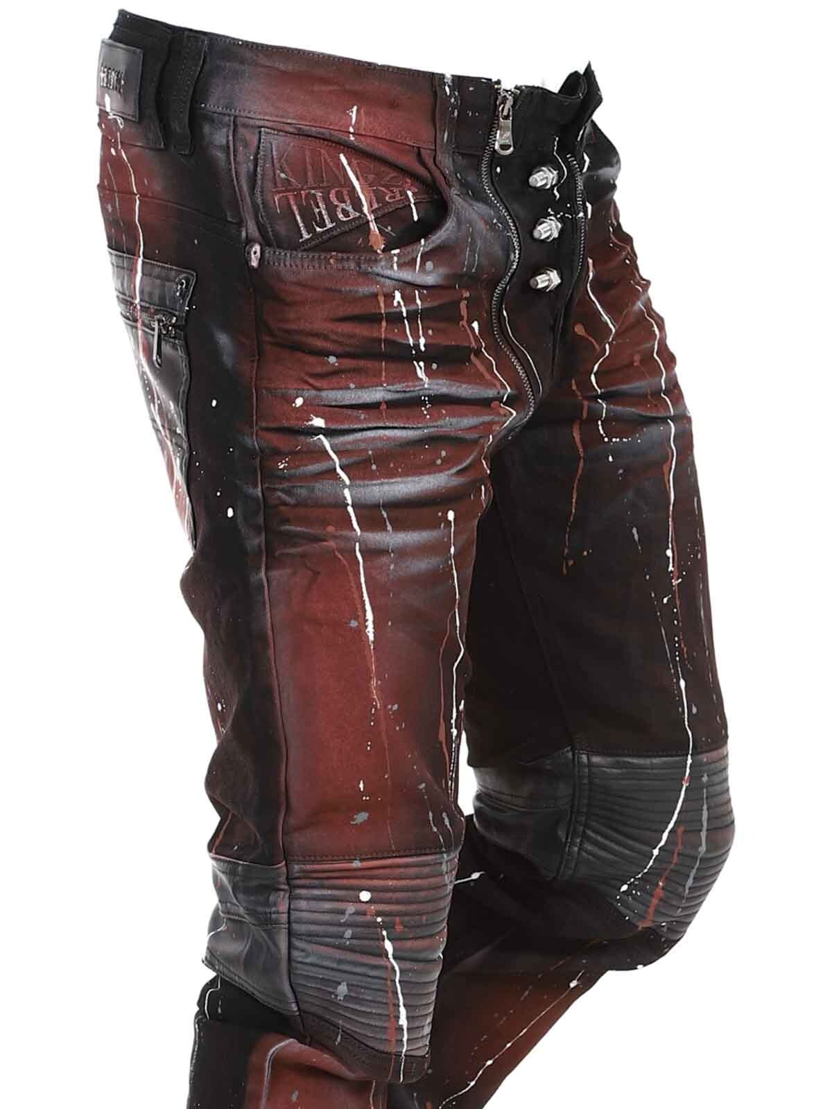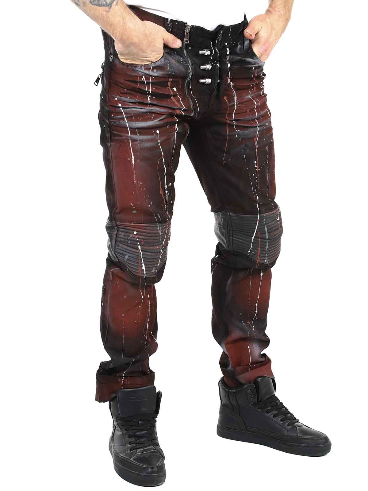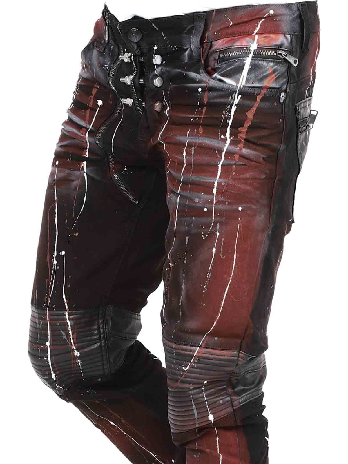 Wyjątkowe spodnie z kolorowego denimu, ze wstawkami z czarnej imitacji skóry na kolanach i kieszeniach. Dopasowany krój z ozdobnymi śrubami przy rozporku i tylnymi kieszeniami zapinanymi na metalowe zamki. Jeansy posiadają osobny zamek błyskawiczny, znajdujący się po prawej stronie rozporka.