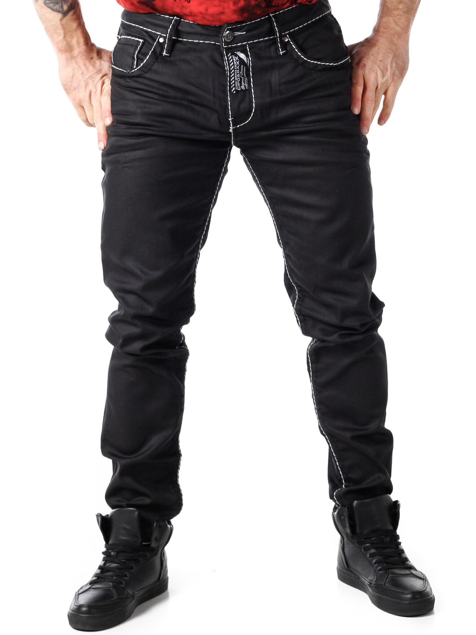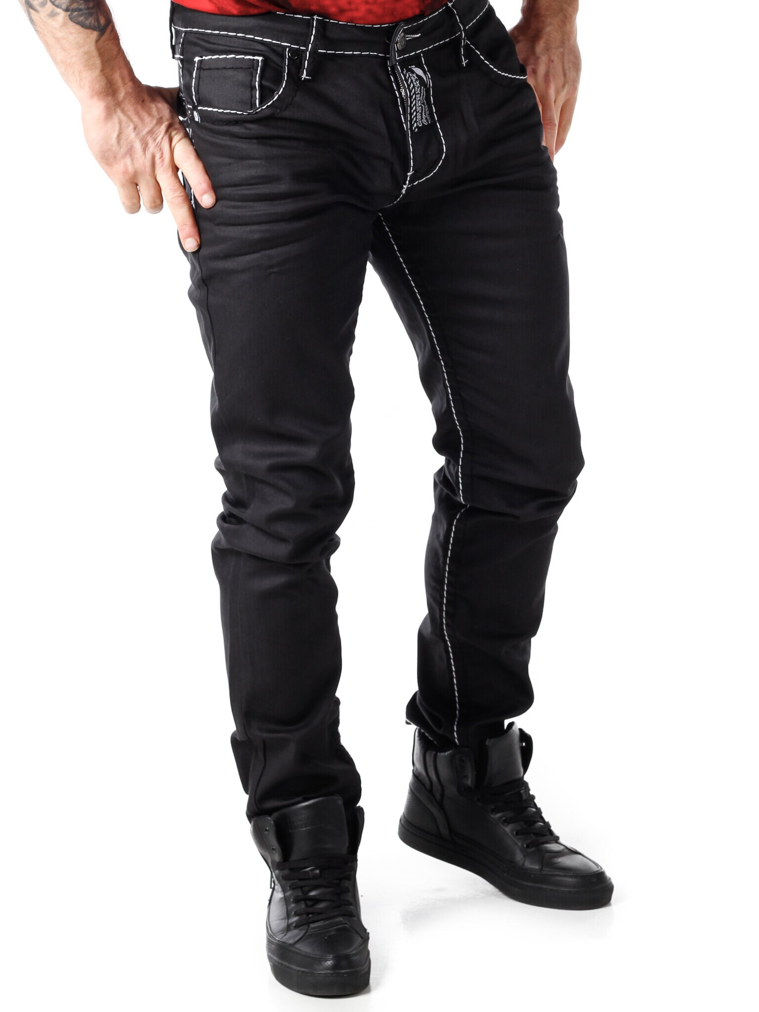 Jeansowe spodnie z grubymi szwami, które tworzą ciekawy efekt. Klasyczny fason ze stretchem i pięcioma kieszeniami. Z przodu i z tyłu znajdują się naszywki z materiału.