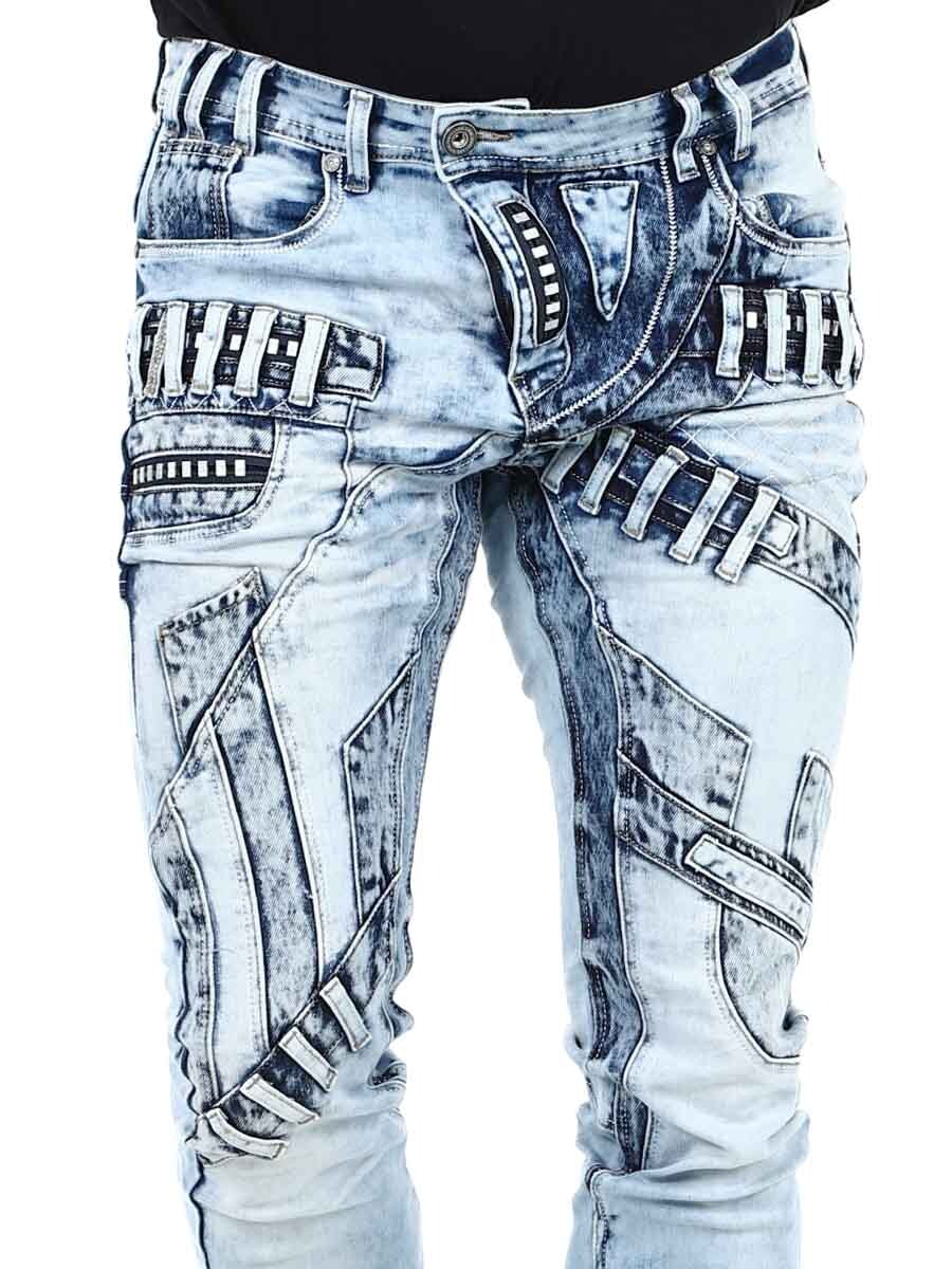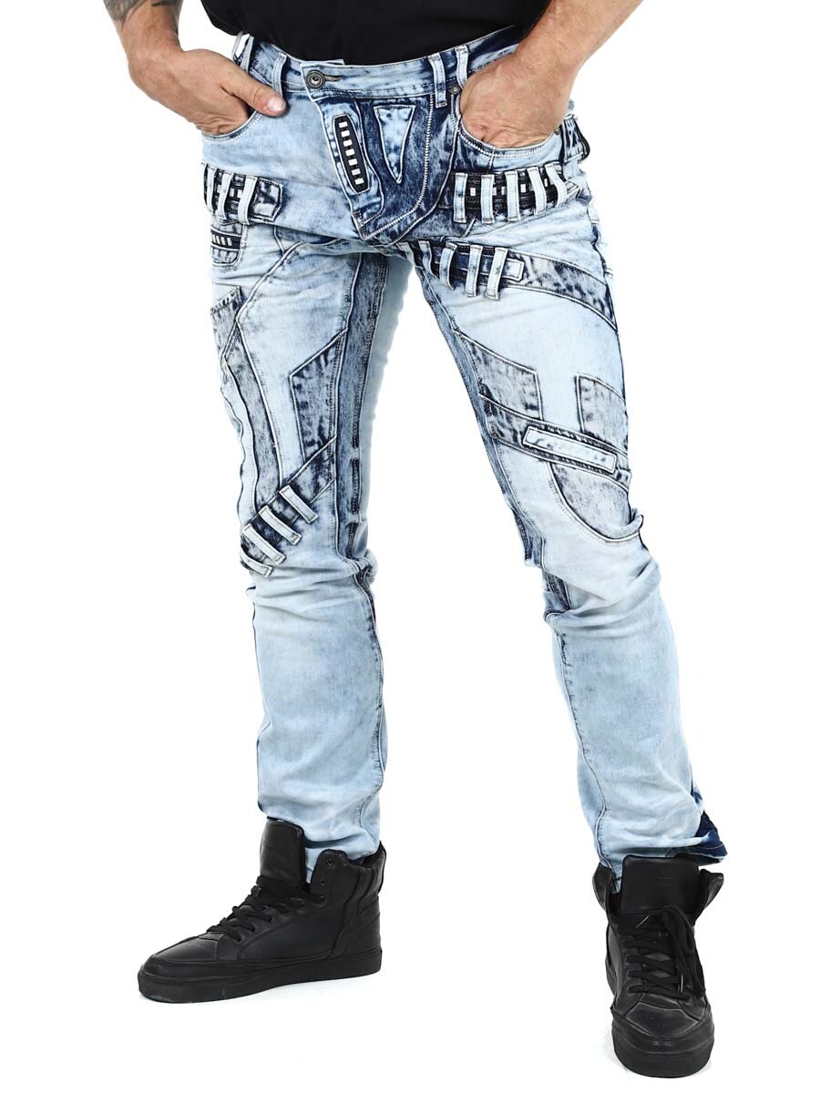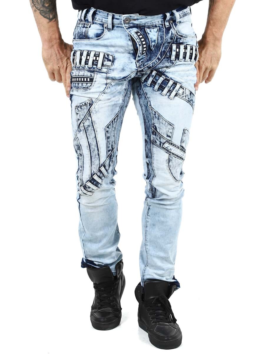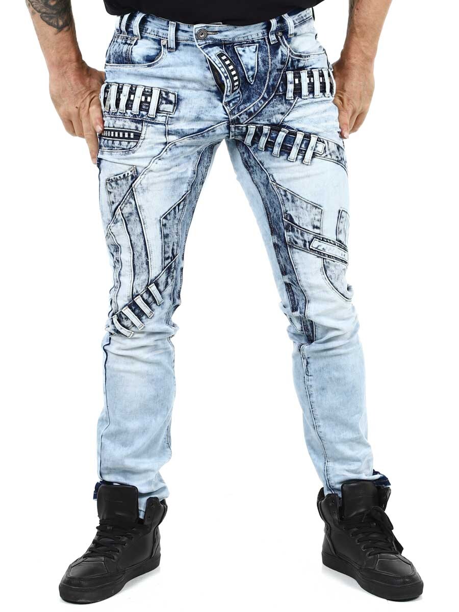 Wyjątkowe dżinsy wykonane z jasnego, spranego denimu z przetarciami, zamkami błyskawicznymi i wstawkami, które nadają im wyrazisty, a jednocześnie stylowy wygląd. Idealne dla osób, które chcą się wyróżniać z tłumu!