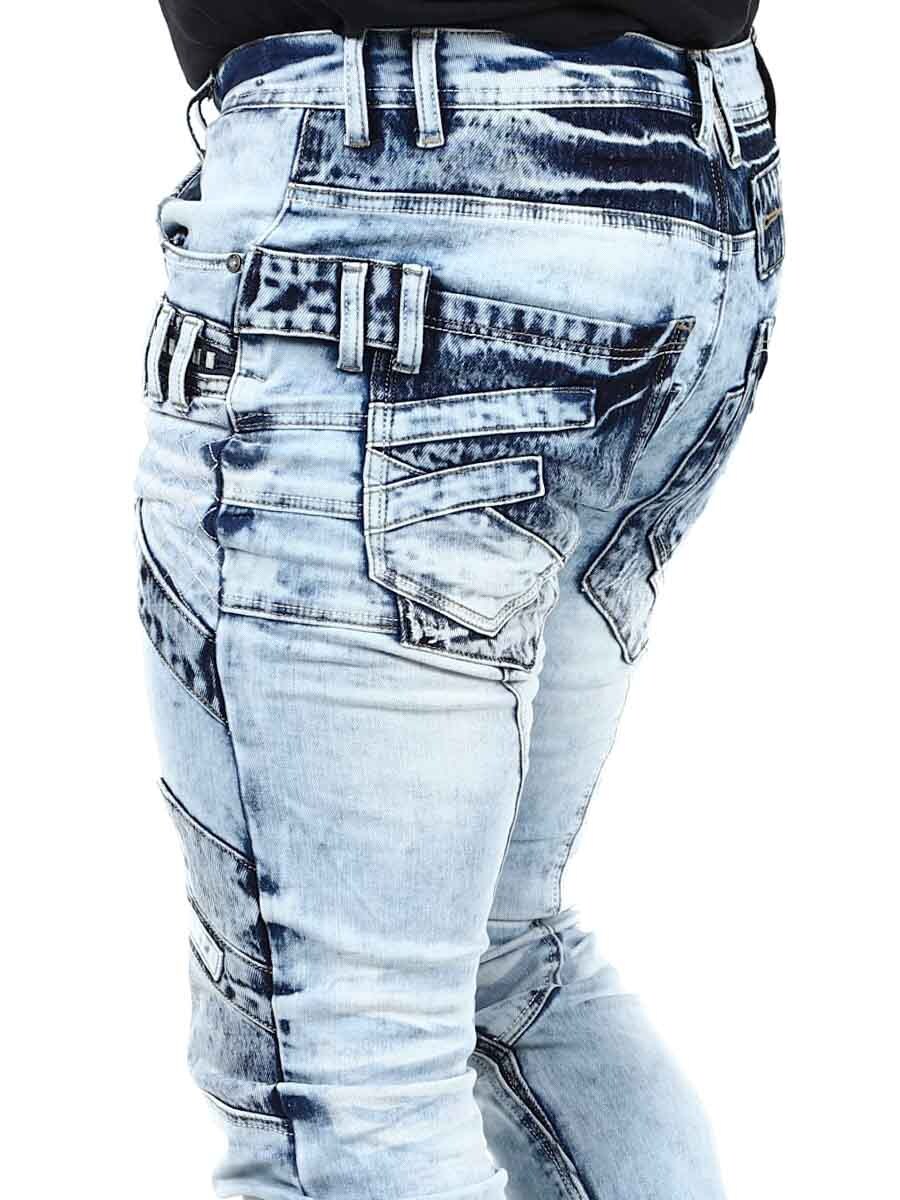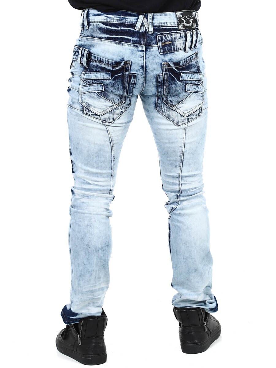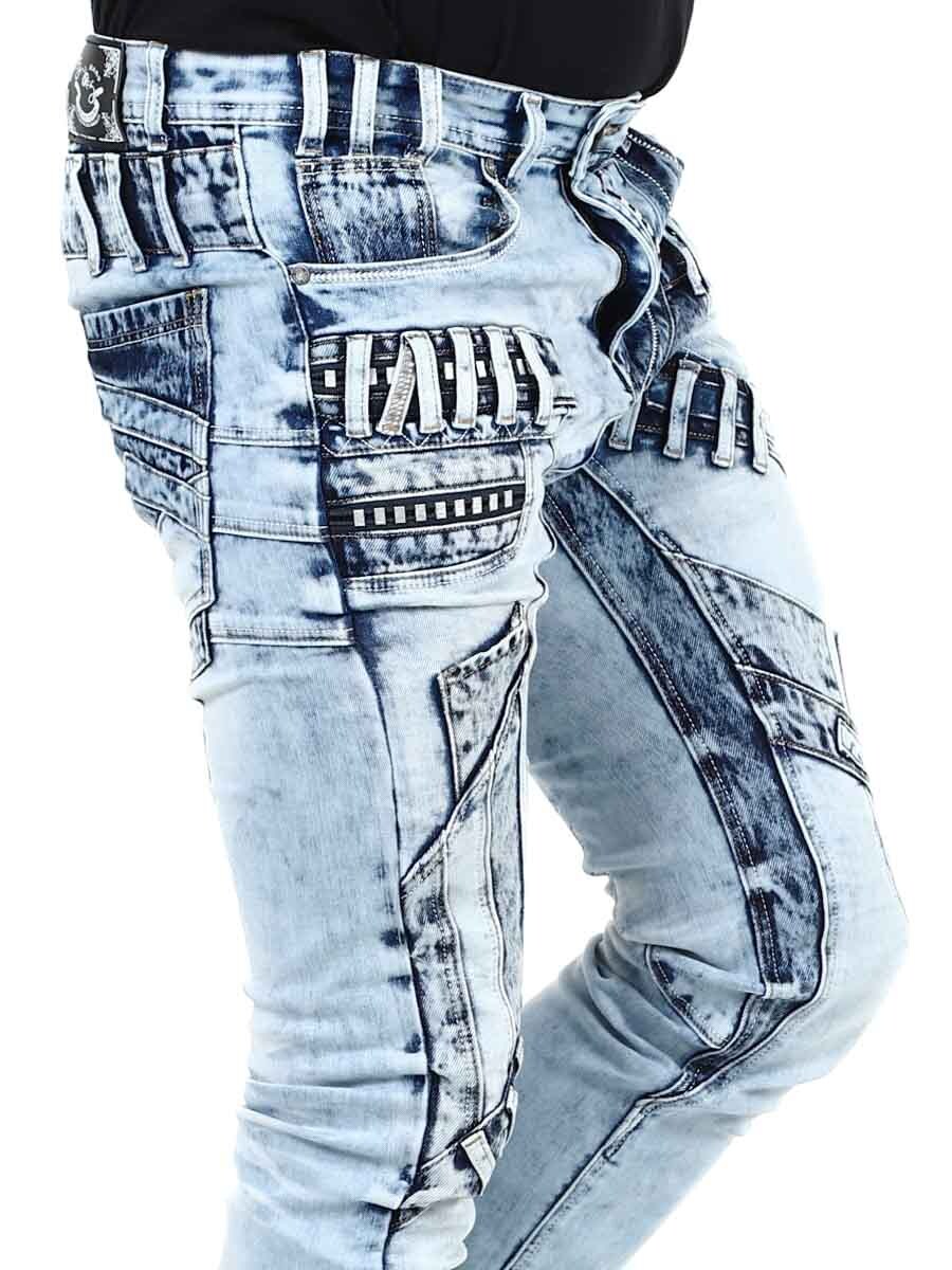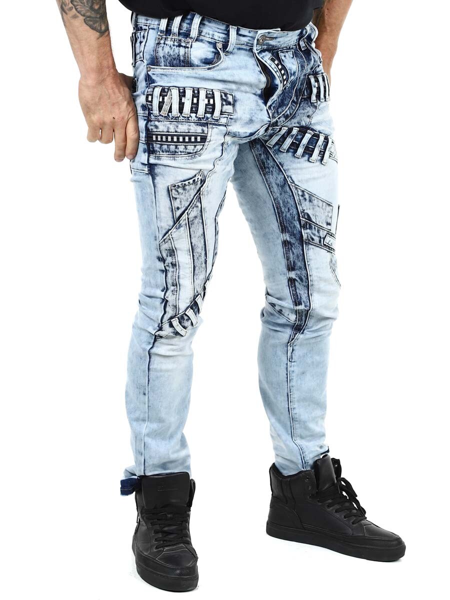 Wyjątkowe dżinsy wykonane z jasnego, spranego denimu z przetarciami, zamkami błyskawicznymi i wstawkami, które nadają im wyrazisty, a jednocześnie stylowy wygląd. Idealne dla osób, które chcą się wyróżniać z tłumu!
