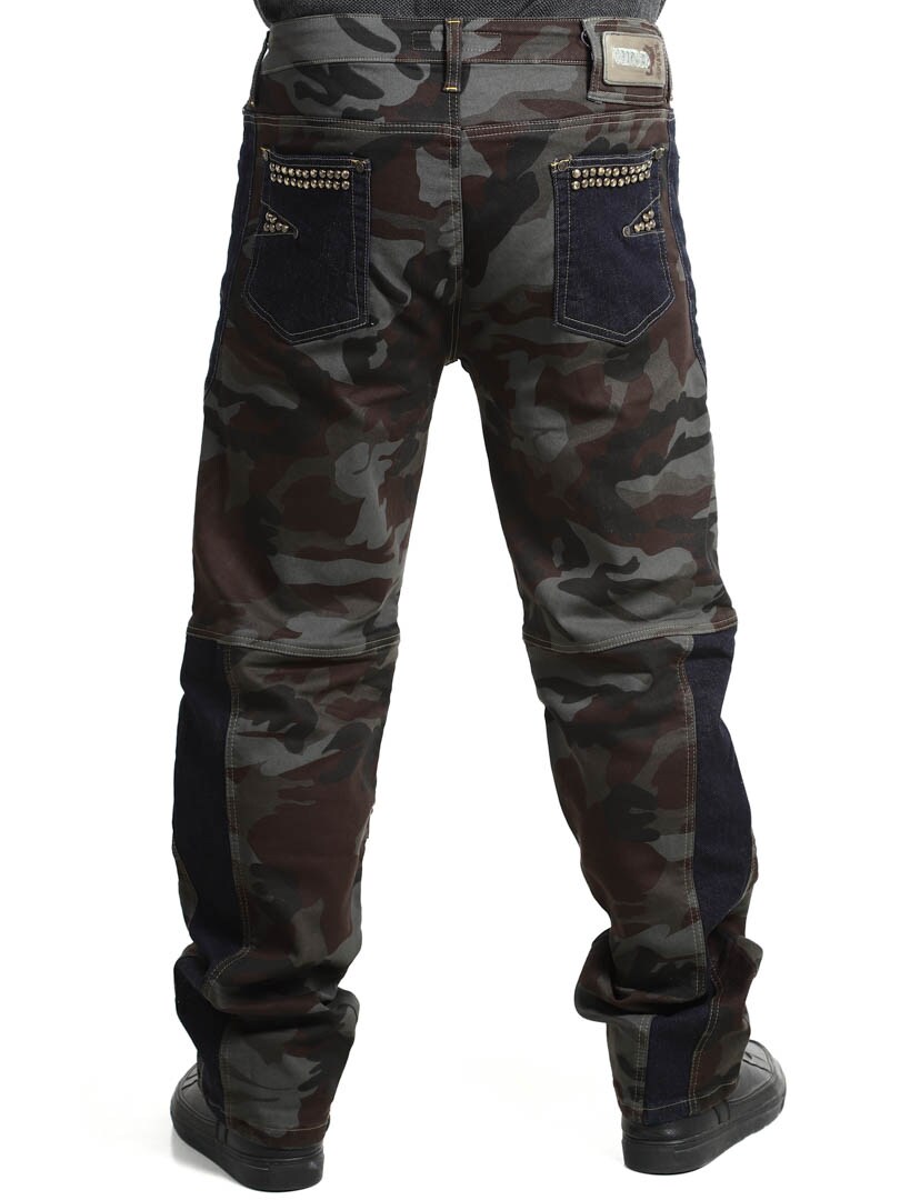 Te spodnie łączą wojskowy wzór z kontrastowymi panelami z denimu i ozdobnymi nitami, zapewniając surowy i przyciągający wzrok styl. Mają kilka funkcjonalnych i stylowych kieszeni. Elastyczny krój zapewnia wygodę i swobodę ruchów, a spodnie są idealne dla tych, którzy chcą się wyróżnić ostrym wyglądem!