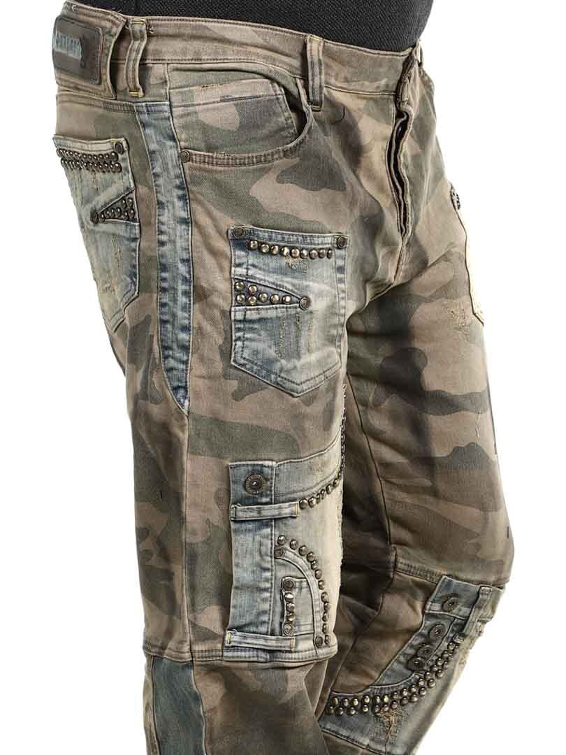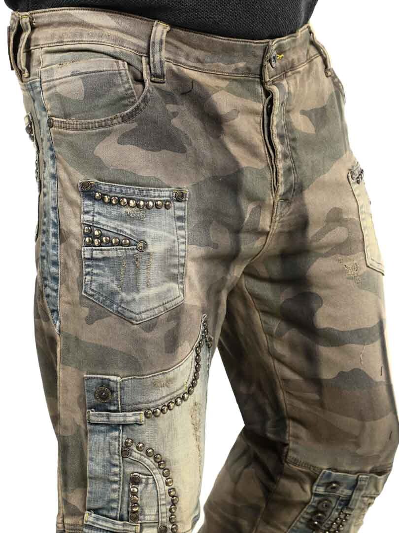 Te spodnie łączą wojskowy wzór z kontrastowymi panelami z denimu i ozdobnymi nitami, tworząc surowy i przyciągający wzrok styl. Mają kilka funkcjonalnych i stylowych kieszeni. Elastyczny krój zapewnia wygodę i swobodę ruchów, a spodnie są idealne dla tych, którzy chcą się wyróżnić ostrym wyglądem!