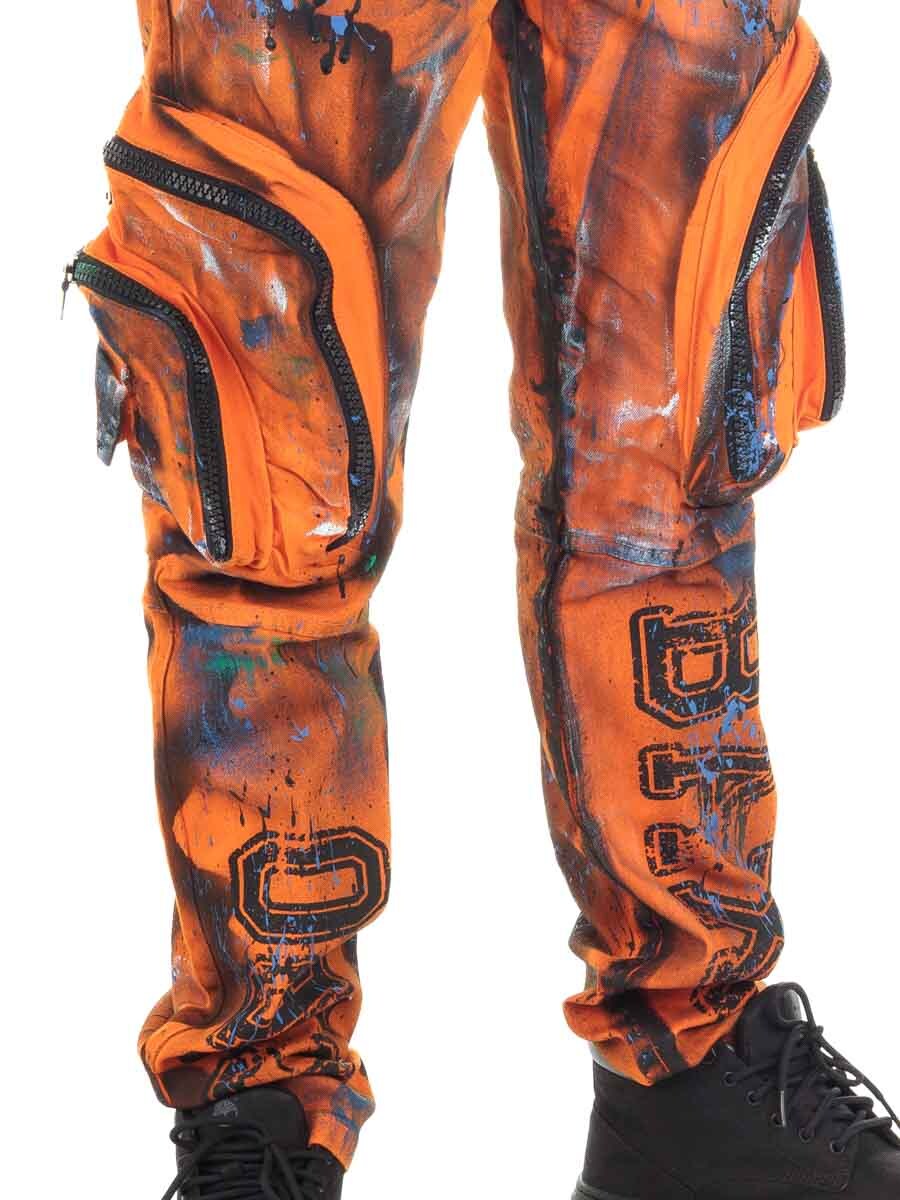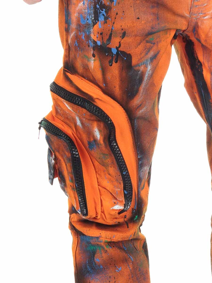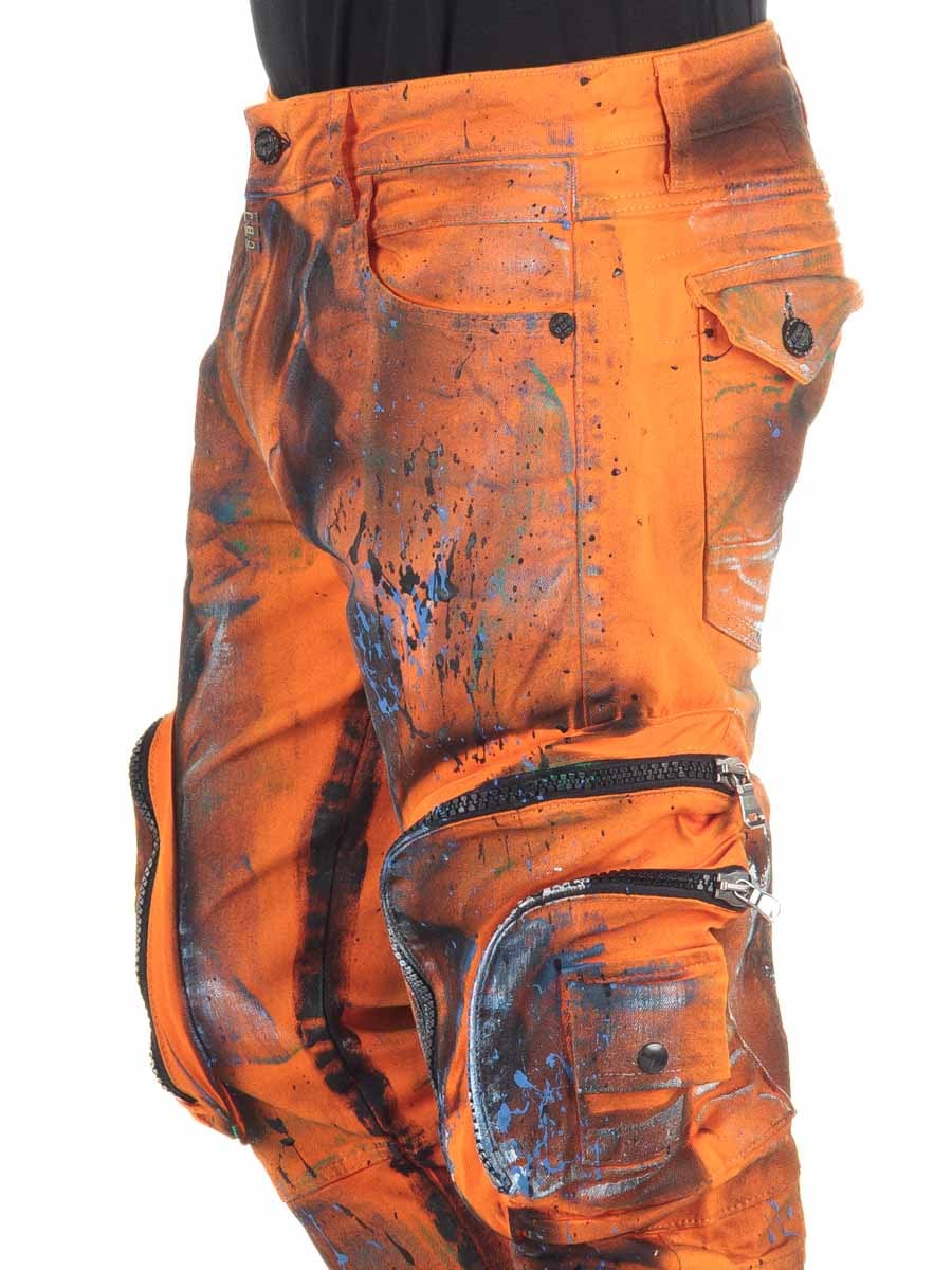 Podnieś swój styl na wyższy poziom dzięki tym przyciągającym wzrok jeansom w intensywnym pomarańczowym kolorze. Model ma streetowy charakter, a na obu nogawkach znajdują się kieszenie cargo wyposażone w zamki błyskawiczne. Ręcznie wykonane, nakrapiane wykończenie w kroju regular fit z rozporkiem na zamek.