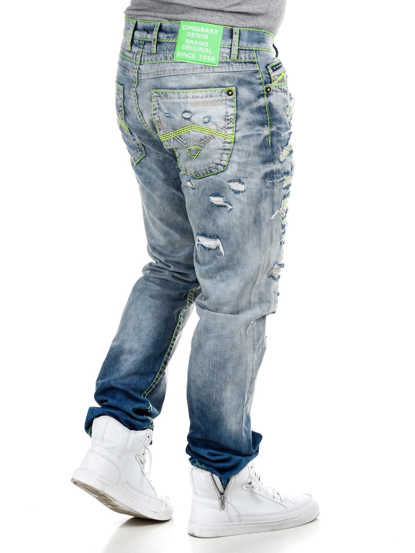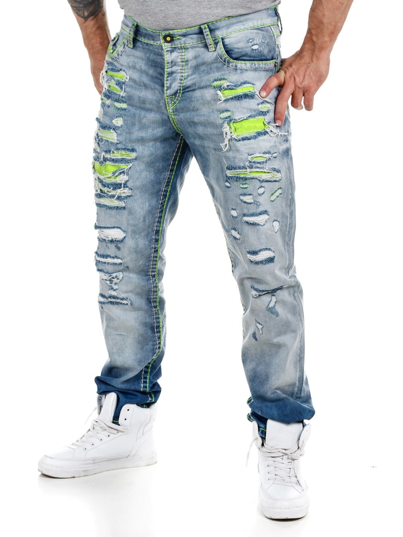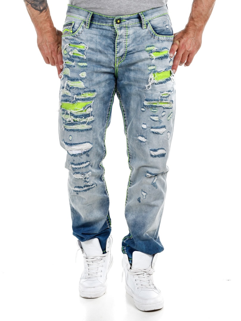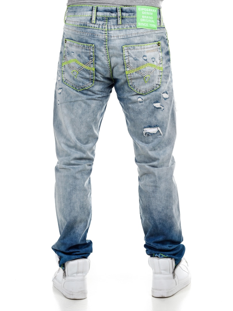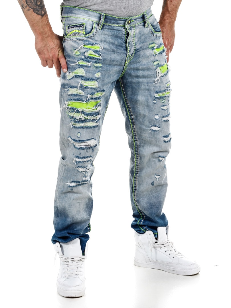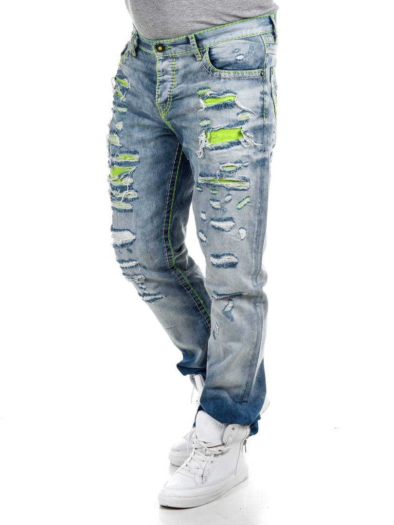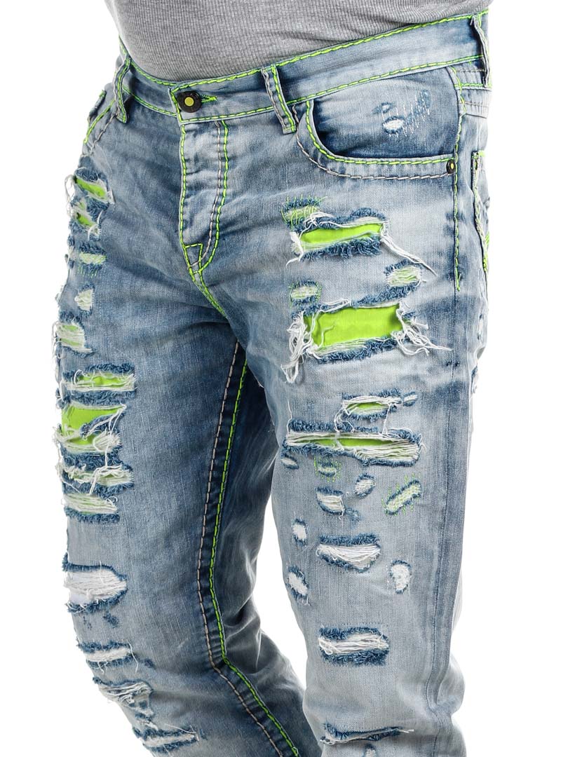 Spodnie z jasnego denimu z wyrazistymi szwami w neonowo zielonym kolorze. Klasyczny krój, trzy kieszenie z przodu i dwie z tyłu. Zaprojektowane z grubymi przetarciami i neonowo zielonym podszewką, która nadaje fajny efekt z przodu.