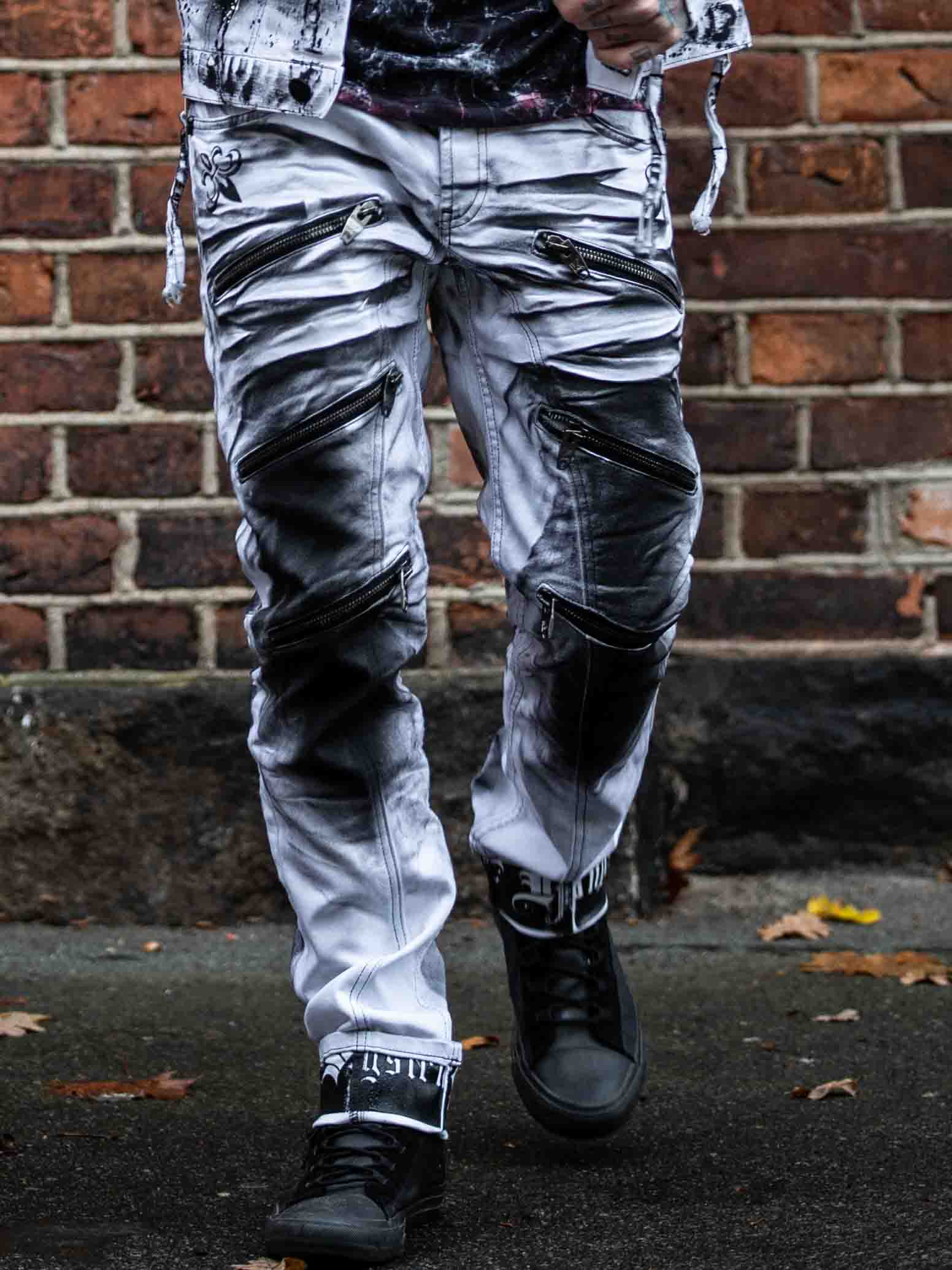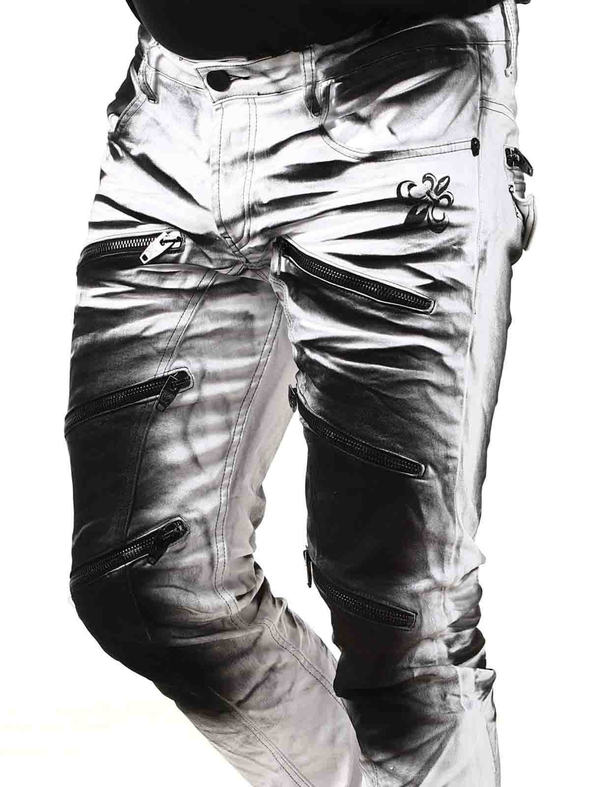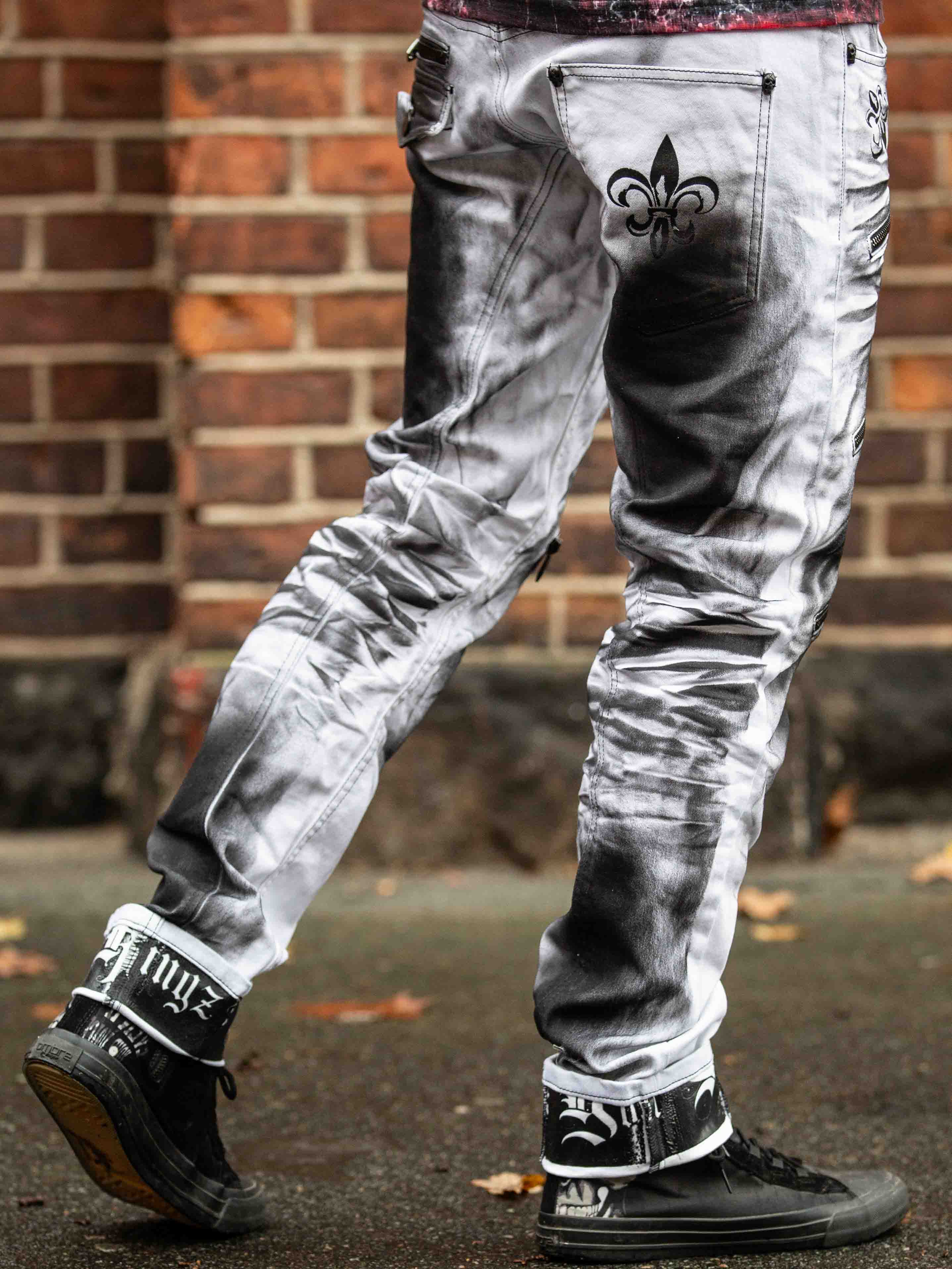 Wytrzymałe jeansy, ze stylowym wykończeniem nogawek. Jeansy posiadają trzy kieszenie z przodu, dwie kieszenie z tyłu oraz szlufki w pasie. Charakteryzują się ciekawymi detalami, zamkami błyskawicznymi, nadrukami i kontrastowymi szwami.