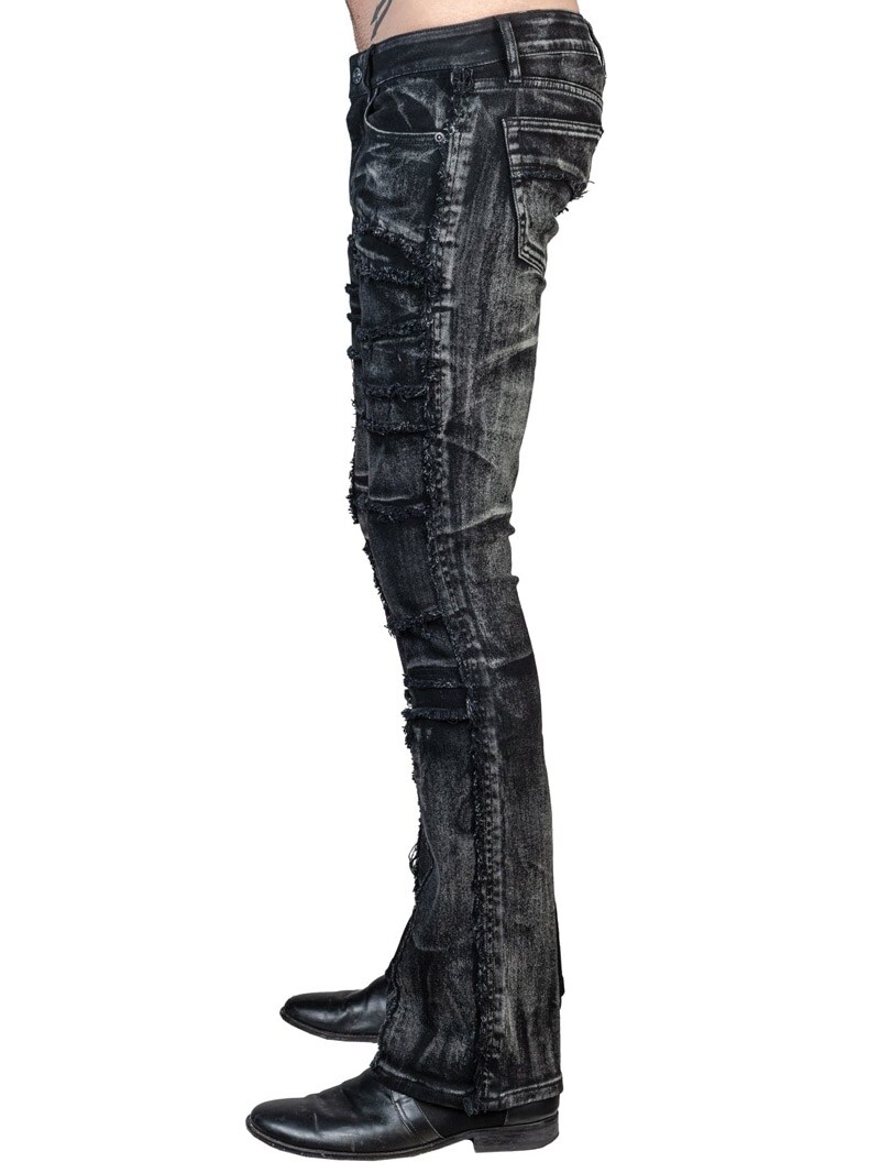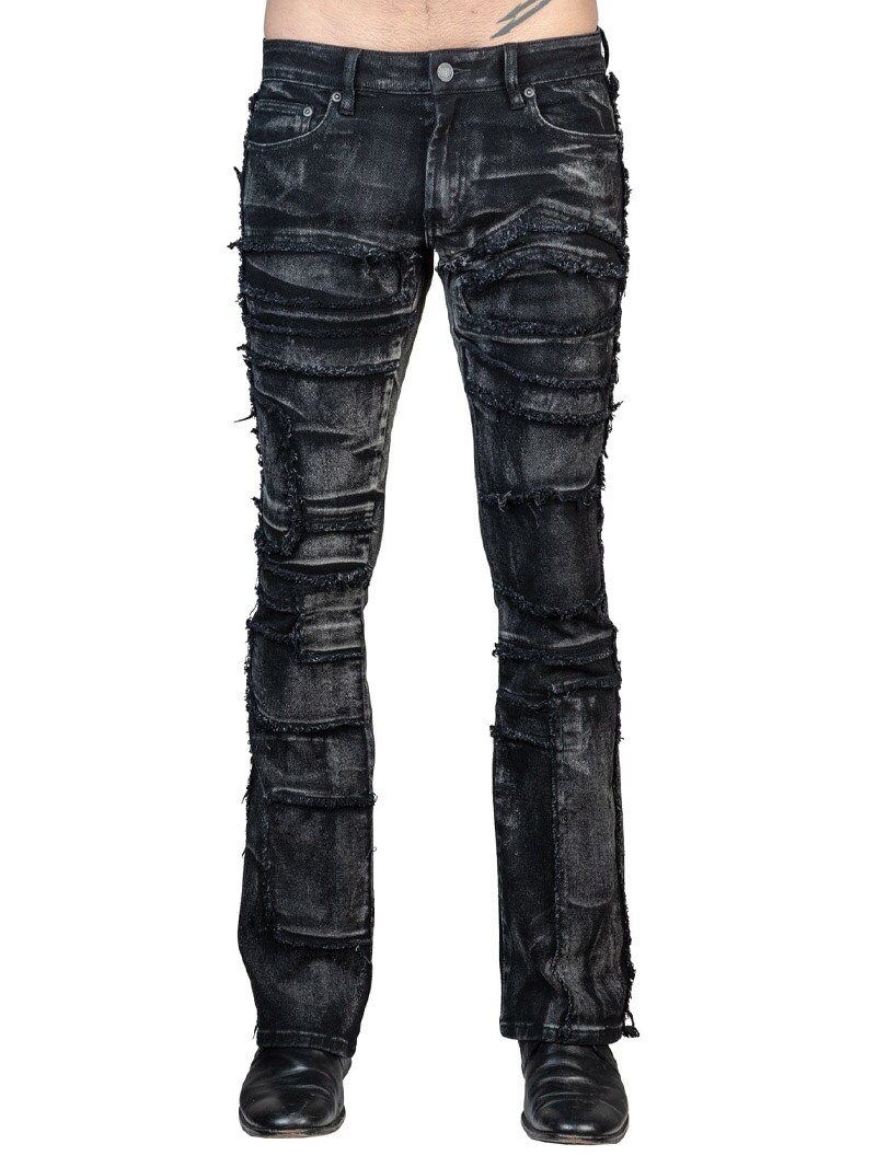 Wornstar Remnant jeans w spranej czarnej wersji to rockowy model bootcut z unikalnymi, ręcznie wykonanymi detalami.