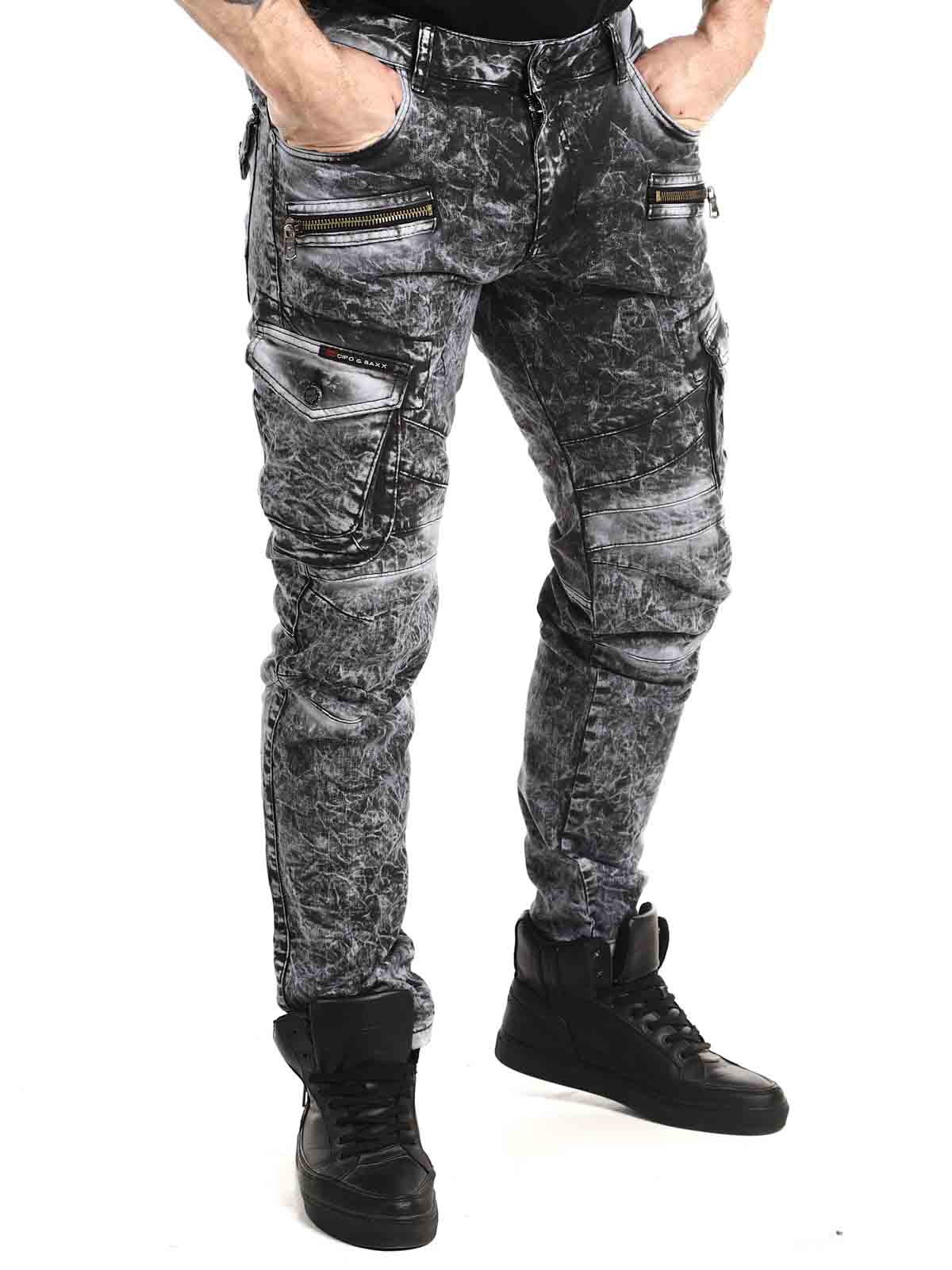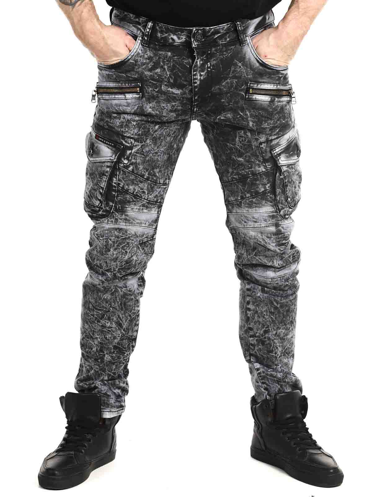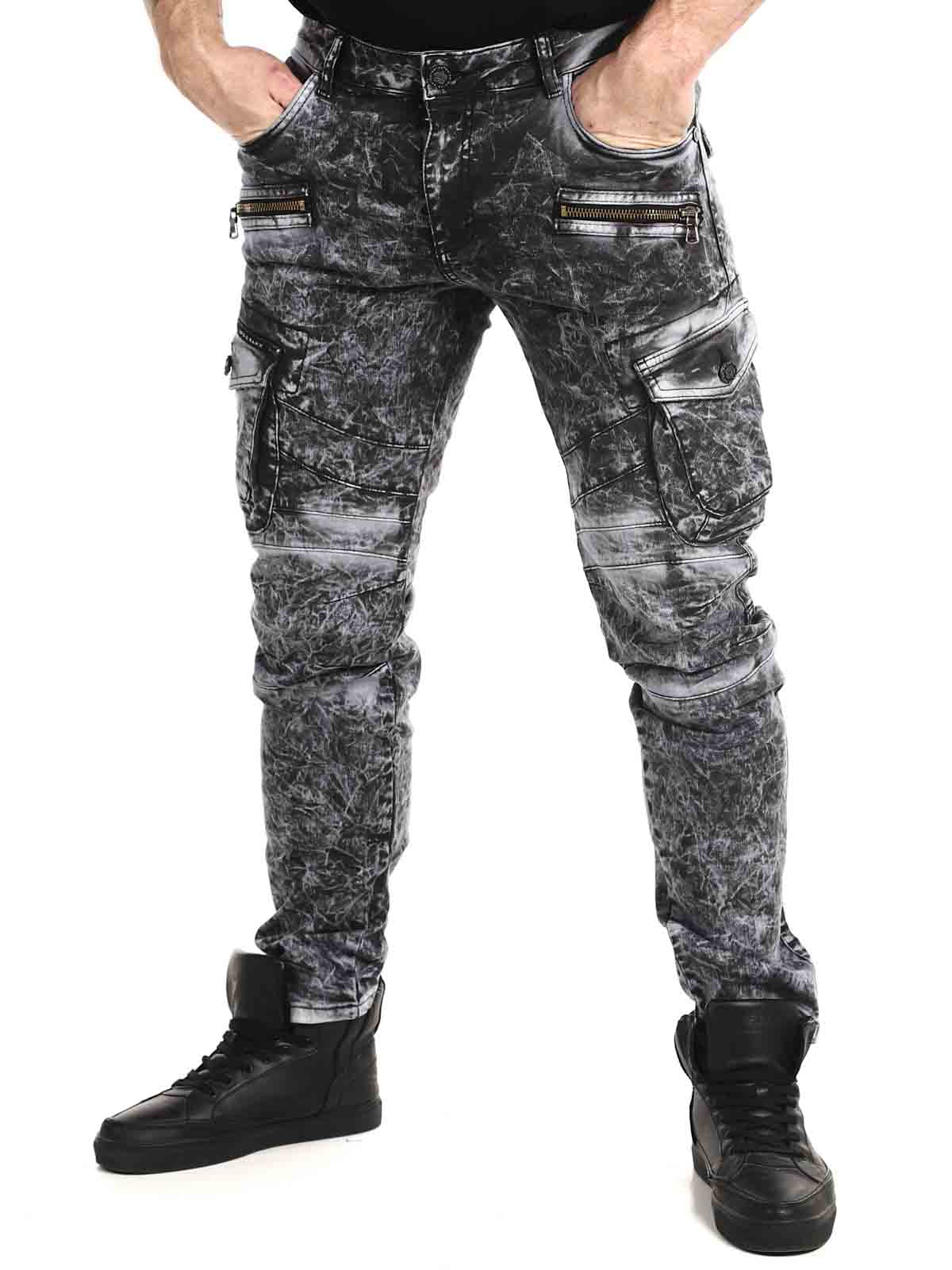 Stylowe jeansy w klasycznym modelu, z kieszeniami typu cargo. Ozdobne zamki błyskawiczne, logo i unikalne szwy. Posiadają szlufki w talii i rozporek na zamek błyskawiczny.