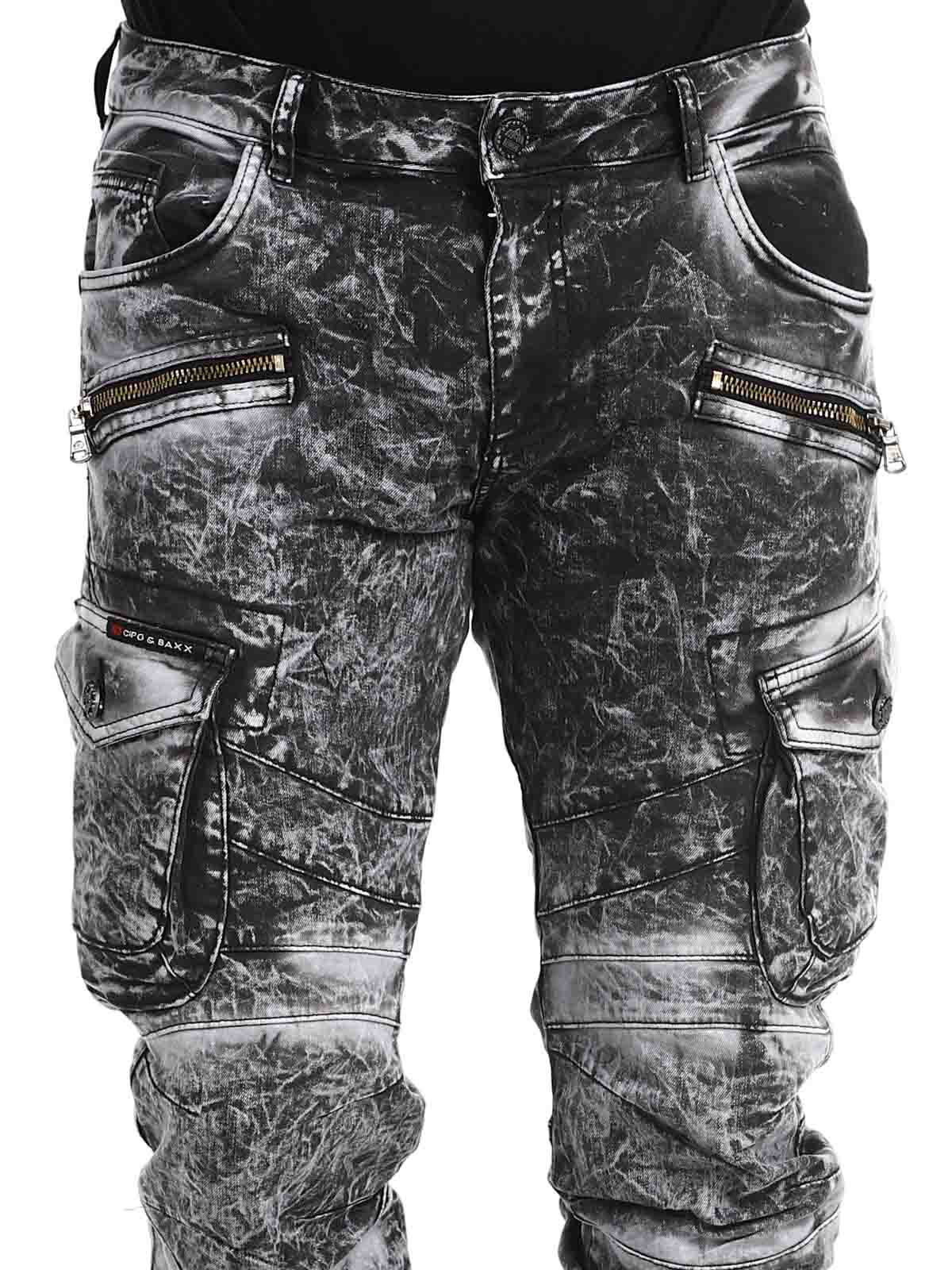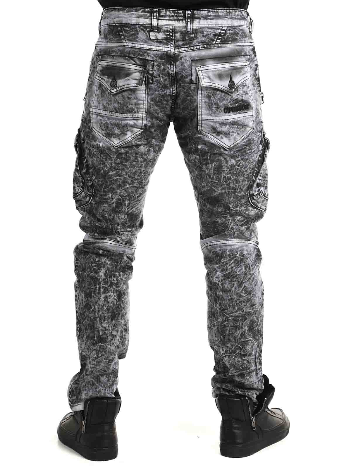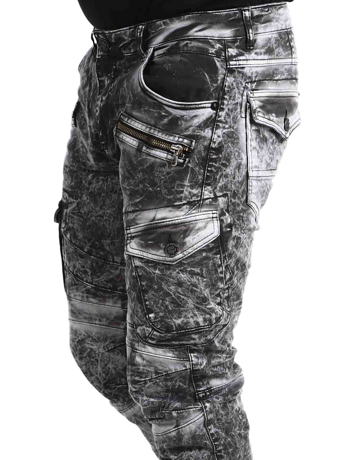 Stylowe jeansy w klasycznym modelu, z kieszeniami typu cargo. Ozdobne zamki błyskawiczne, logo i unikalne szwy. Posiadają szlufki w talii i rozporek na zamek błyskawiczny.