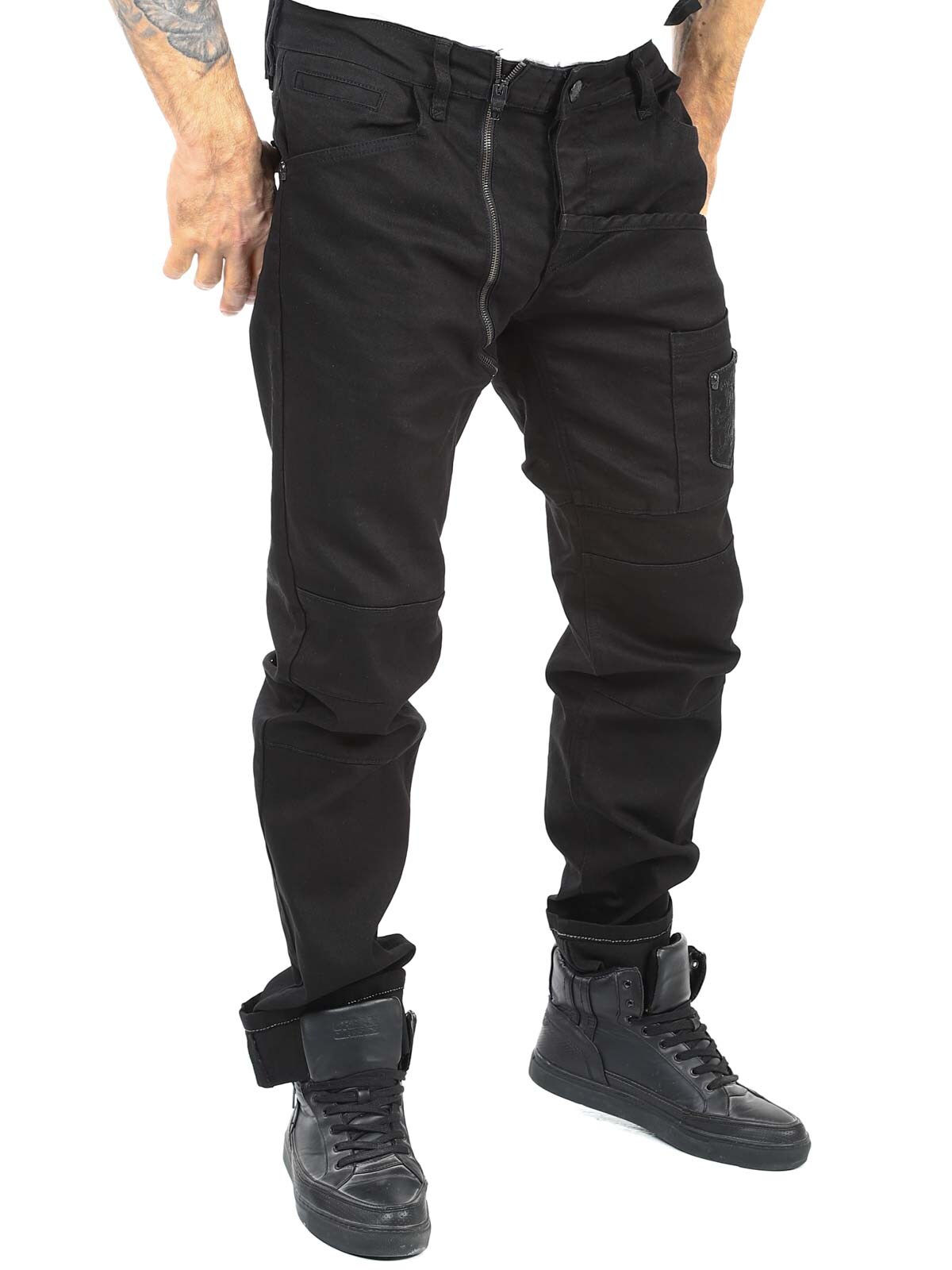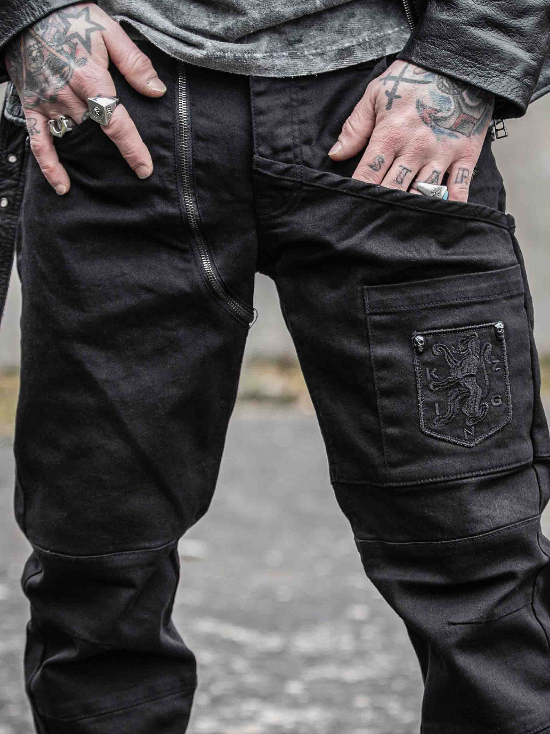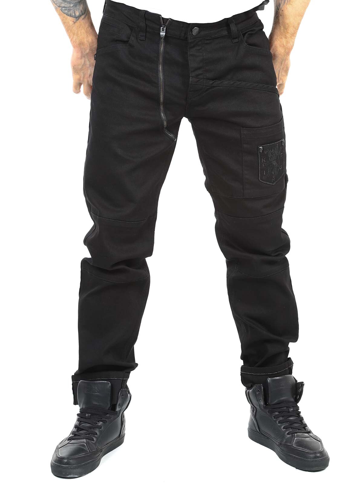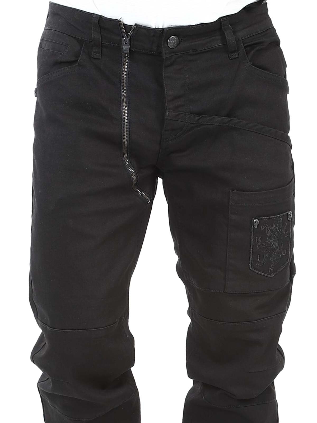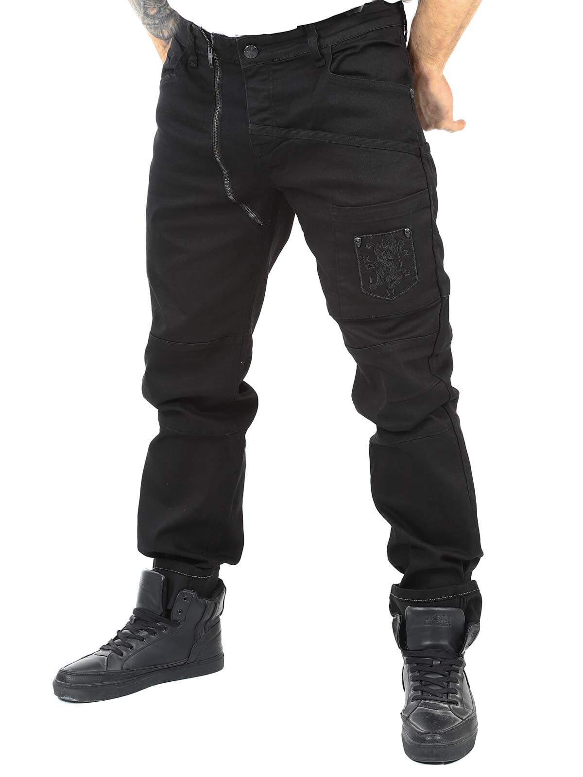Dżinsy w jednolitym kolorze ze stretchem i szlufkami w talii. Mają detale, takie jak kieszenie z haftowanym logo i zamki błyskawiczne, które zapewniają fajny wygląd. Te dżinsy można zapiąć na guziki w rozporku lub na osobny zamek błyskawiczny po lewej stronie guzika w talii. Dzięki tym jeansom Kingz jesteś gotowy na każde wyzwanie ze stylem i postawą.
